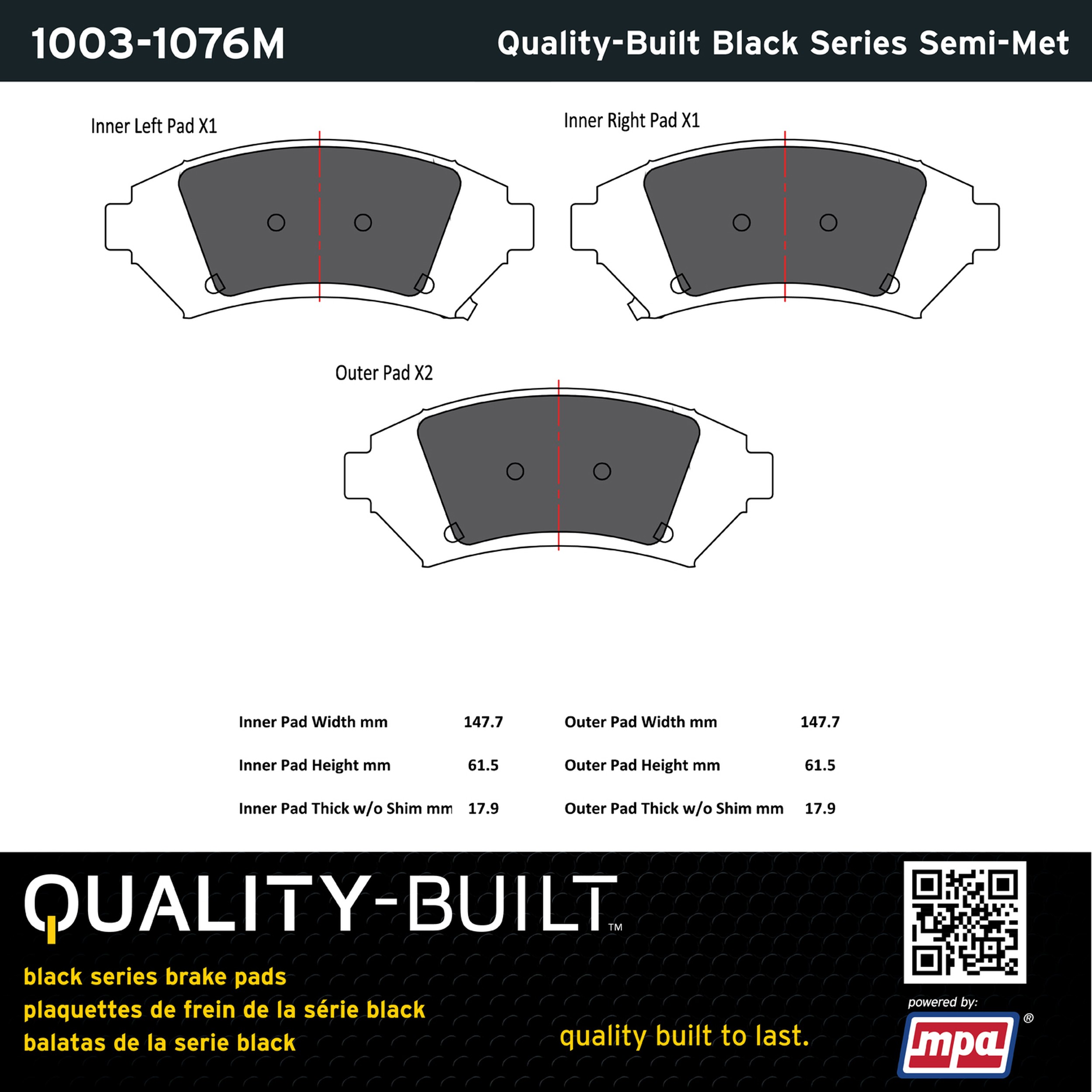 - Quality-Built Black Series Brake Pads are the ultimate in brake pad performance, delivering smooth, reliable stopping with zero noise and low dust. Application-specific friction formulas take the guesswork out of pad selection while providing even, predictable pedal feel and fade-free stopping power across a wide thermal range. Black Series friction compounds are engineered for optimized brake system performance and improved stopping power.