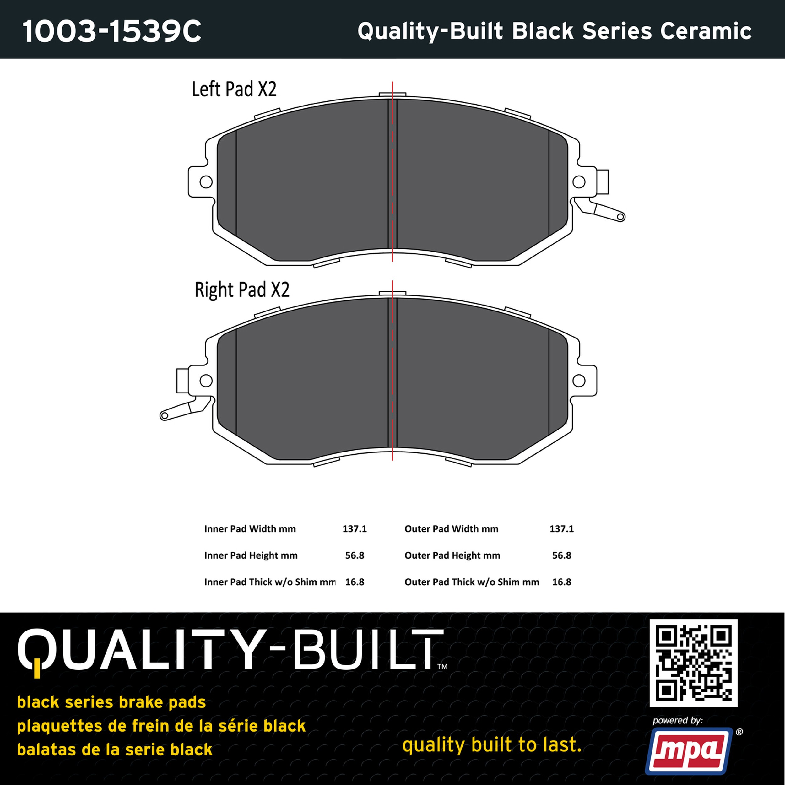 • Quality-Built Black Series Brake Pads are the ultimate in brake pad performance, delivering smooth, reliable stopping with zero noise and low dust. Application-specific friction formulas take the guesswork out of pad selection while providing even, predictable pedal feel and fade-free stopping power across a wide thermal range. Black Series friction compounds are engineered for optimized brake system performance and improved stopping power.