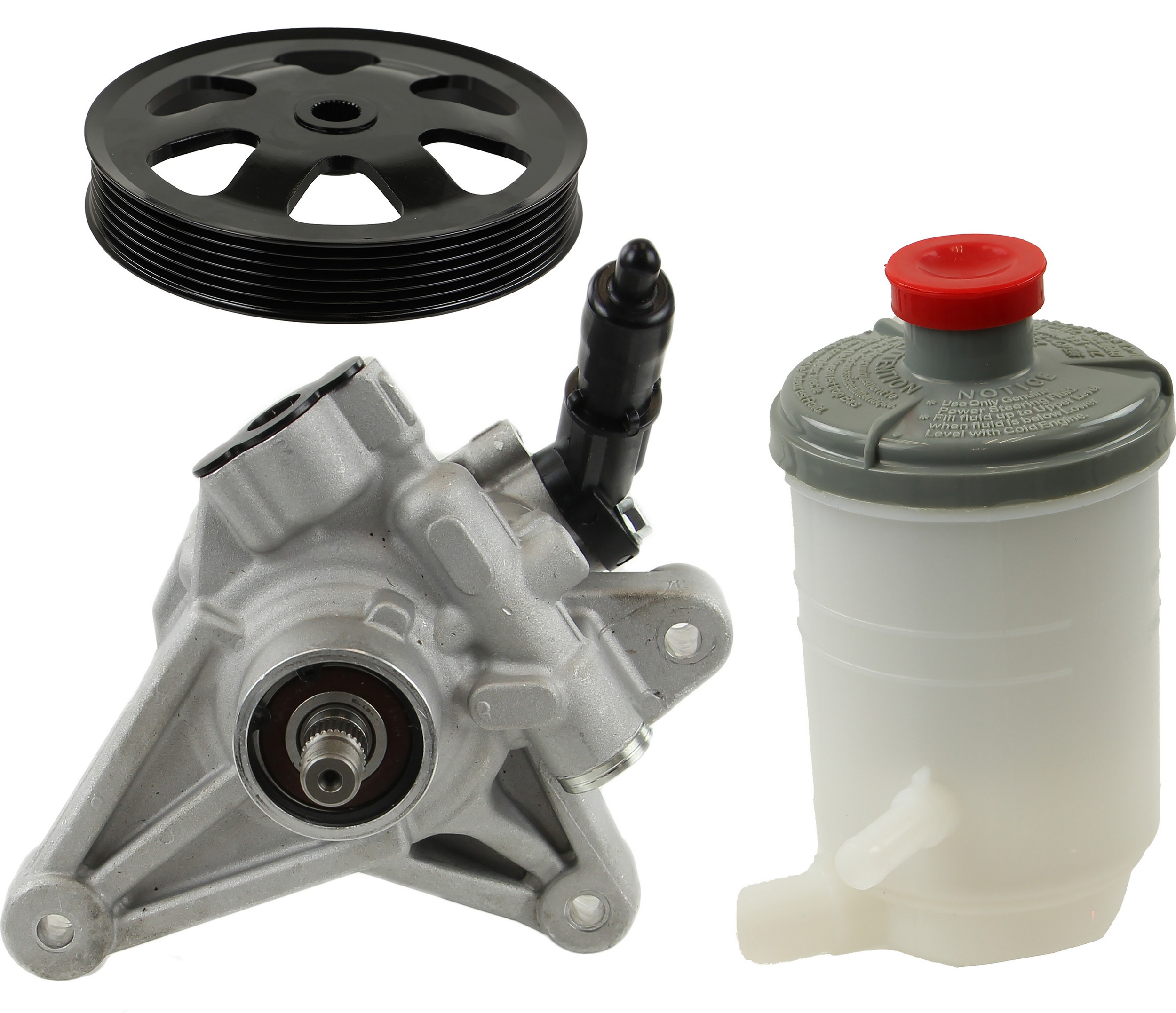 - Comes as complete kit with new pump, pulley, return pipe, o-ring, and reservoir.