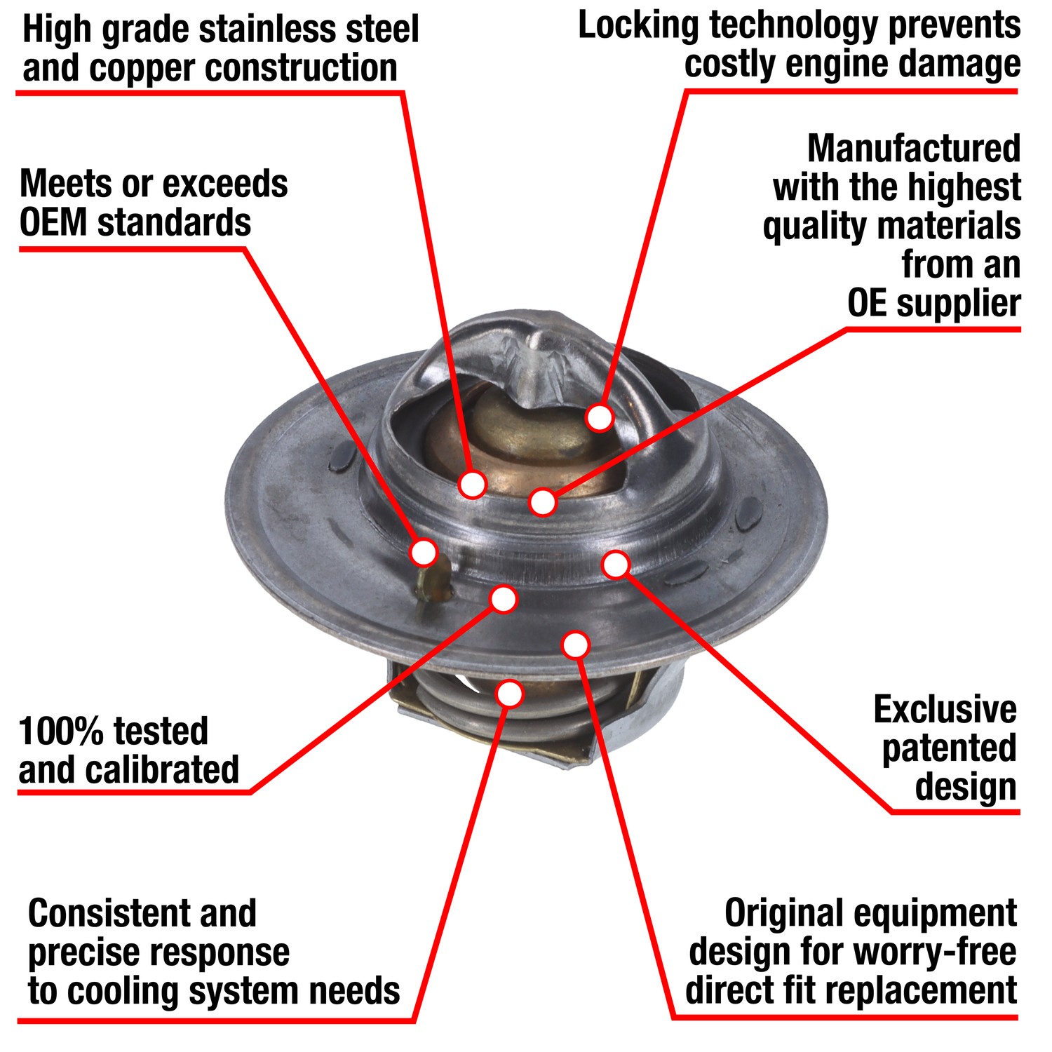 - Manufactured with OEM quality materials and safety standards by an OE Supplier. Stands up to even the most demanding automotive cooling systems. Manufactured with OEM specifications and processes. Copper case and wax compound assures rapid response to temperature changes in the coolant. Offset design, air relief valve, and OEM style seals included where applicable