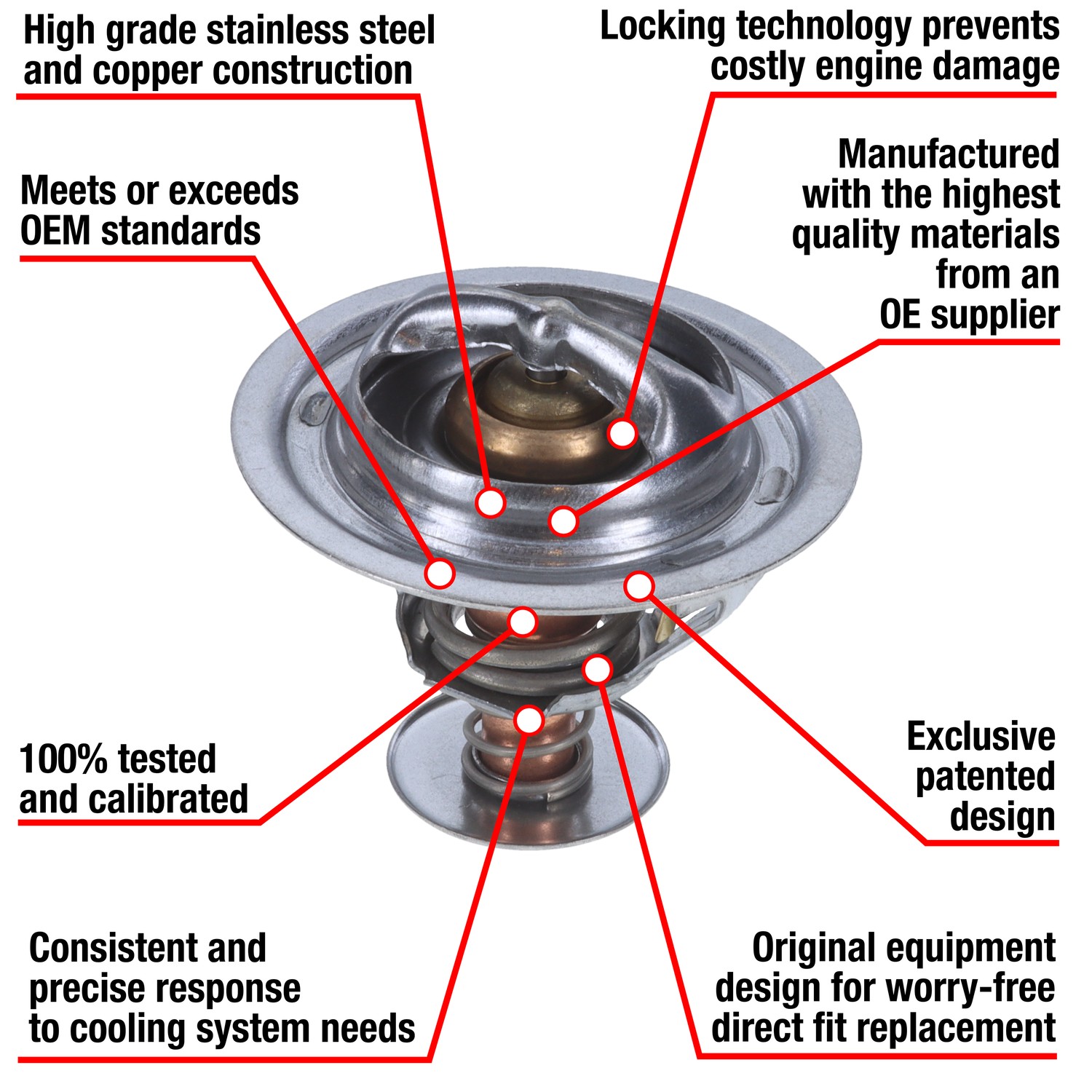 - Manufactured with OEM quality materials and safety standards by an OE Supplier. Stands up to even the most demanding automotive cooling systems. Manufactured with OEM specifications and processes. Copper case and wax compound assures rapid response to temperature changes in the coolant. Offset design, air relief valve, and OEM style seals included where applicable