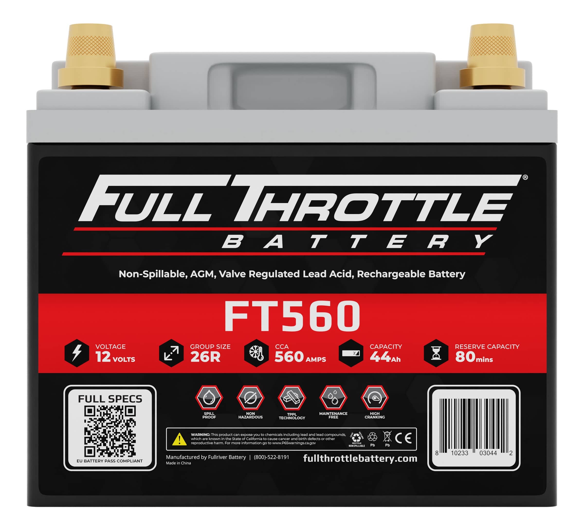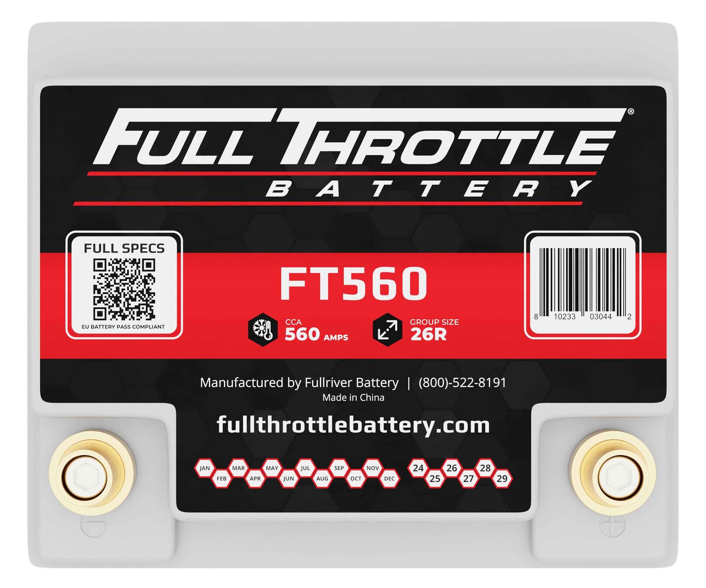 - Full Throttle 12V Battery, Group 26R, 560CCA, 44AH, Brass SAE Terminal RHP