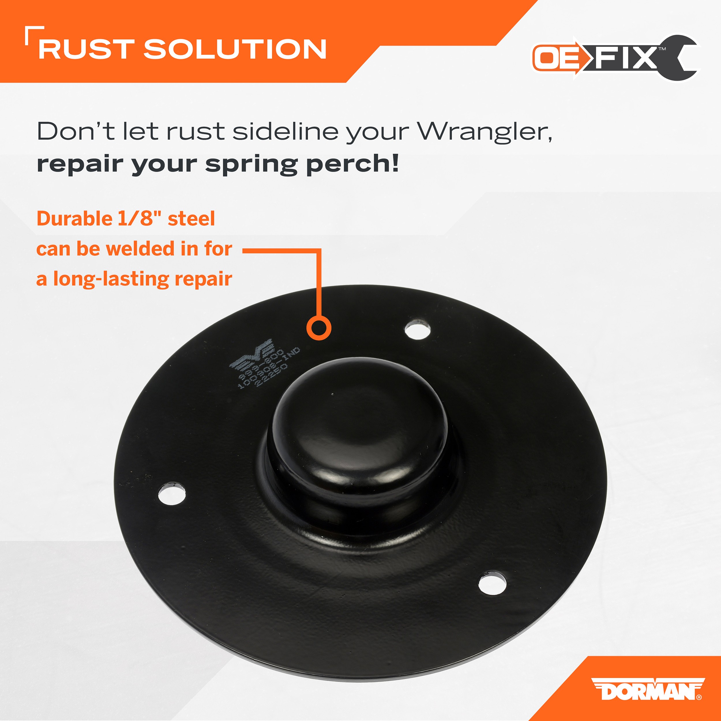 - When an original equipment lower coil spring bracket on certain Jeep Wrangler vehicles rusts and fails, the typical options for repair are a costly complete axle assembly from the dealer, the time-consuming fabrication of a custom bracket, or salvage yard parts with an unknown history that might invite another failure again soon. This weld-on Dorman OE FIX coil spring bracket is constructed from quality carbon steel and designed to save money and eliminate future repair worries by allowing the replacement of just the rusted factory bracket. It is engineered to precise dimensions for a perfect fit and features a rust-resistant electrostatic coating to help ensure long service life under the toughest on- and off-road conditions. For a thorough, professional repair, be sure to grind off a section of the electrostatic coating as needed to ensure a contaminant-free weld, and apply a rust-resistant paint over the weld to protect the exposed metal surfaces.