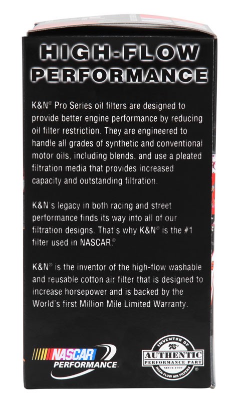 - K&N Performance Silver Cartridge Oil Filters are constructed with a high flow design that helps to improve engine performance by reducing oil filter restriction. K&N Performance Silver oil filters provide outstanding filtration and engine protection throughout their service life and are engineered to handle virtually all grades of synthetic, conventional and blended motor oils. The pleated media provides high filtration capacity making them suitable for extended oil change intervals when used in accordance with the vehicle and motor oil manufacturers recommendation.