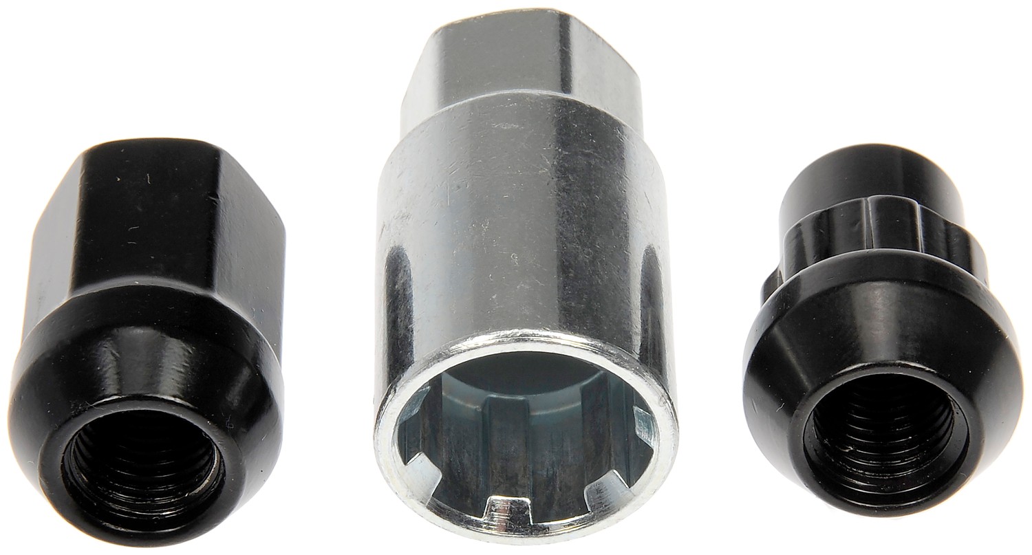- This wheel lock set includes sixteen standard lug nuts, four locking lug nuts and a wheel lock key for security. Made of carbon steel with a black chrome finish, these wheel nuts have been tested to ensure strength, longevity and safety.