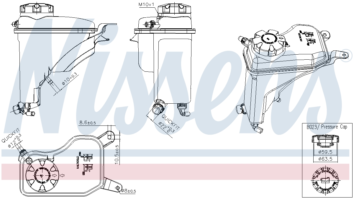 - Nissens engine coolant reservoir (expansion tank) is a complete aftermarket solution that includes high-quality pressure caps and pre-mounted sensors when needed. Nissens engine coolant reservoirs are manufactured using OE matching plastics, high durable welding, and reinforced fittings for a fast and secure part connection. Nissens thoroughly tests tanks and the inner components to ensure excellent fit and reliable performance.