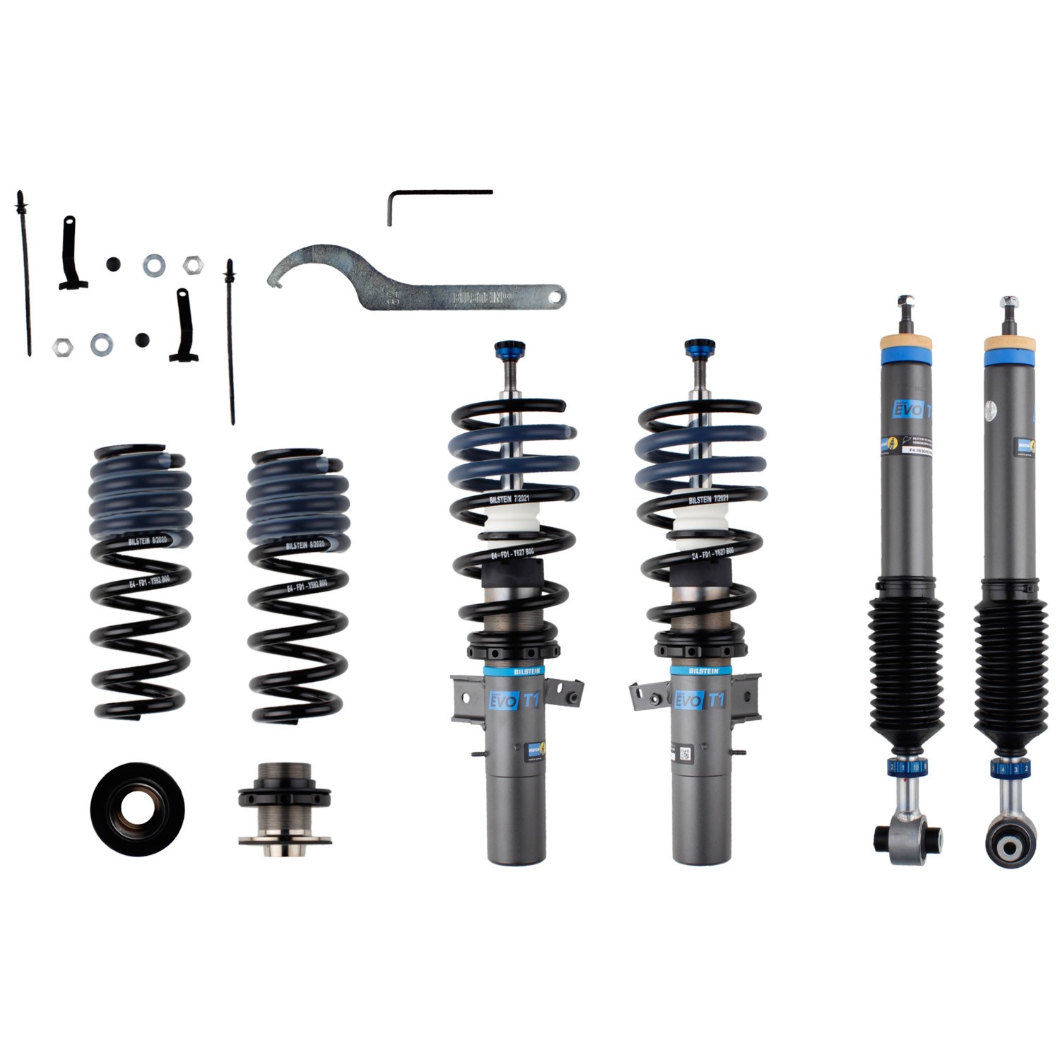 - Bilstein EVO Series coilovers are the next step in the evolution of performance suspension tuning. EVO T1 is a coilover kit built and tuned specifically for everyday street use and occasional track duty. Featuring ride height adjustability and manually adjustable performance dampers. The 10-stage damping system adjusts both rebound and compression to provide the best handling performance for both street and track conditions. Redesigned threaded bodied dampers allow for extreme lowering of up to 70mm. High quality components provide consistent performance for every adjustment. Greater stability, traction and higher cornering speeds are achieved through specific application tuning. Bilstein EVO Series suspension kits are designed and built in Germany with technology tested and tuned on the Nürburgring.