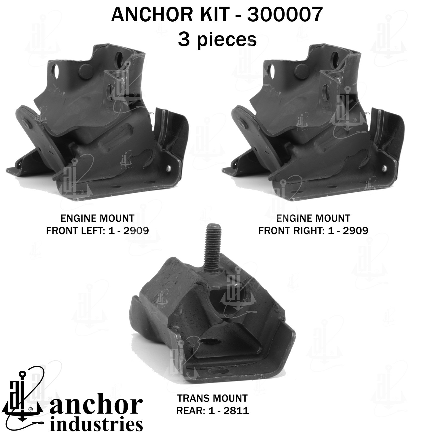 - Anchor 300007; ENGINE MNT KIT ; Each part of this kit is specifically engineered and manufactured to meet or exceed OE standards to ensure perfect fit and function. Natural and SBR rubber provide maximum life and performance. Steel fasteners are heat treated grade 5 bolts. A special bonding agent is used to ensure a rubber to metal bond. Rubber material is mixed to specific Durometer, hardness. 12 Month Warranty.