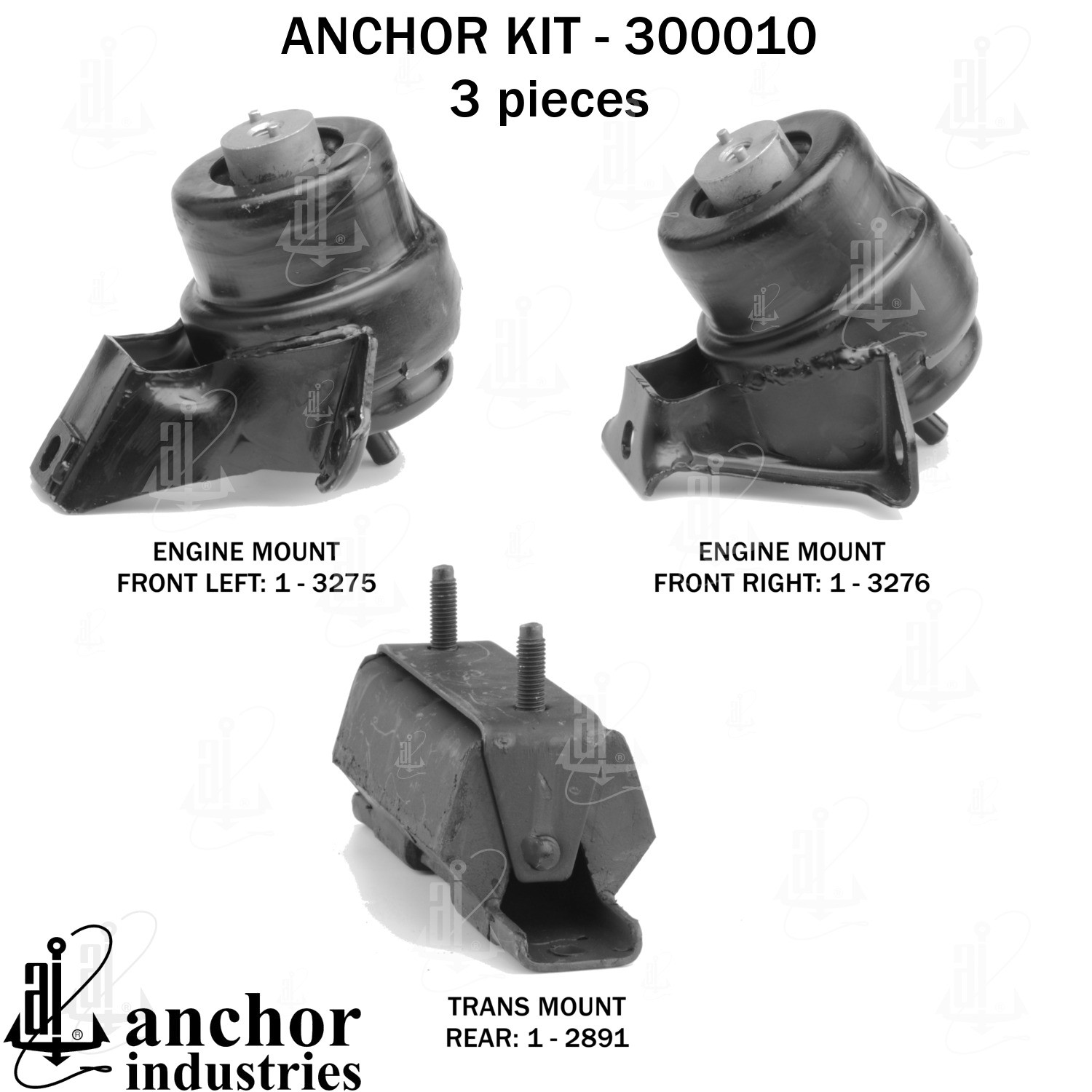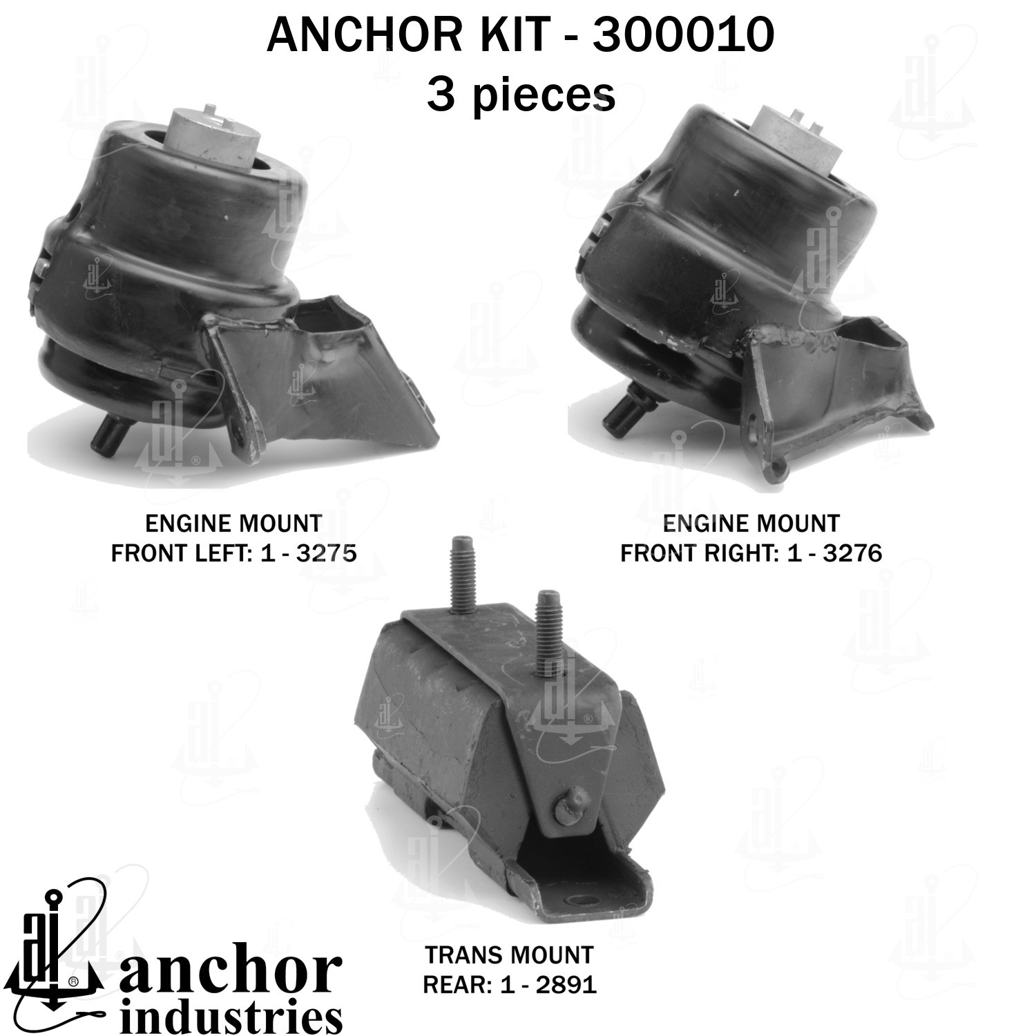 - Anchor 300010; ENGINE MNT KIT ; Each part of this kit is specifically engineered and manufactured to meet or exceed OE standards to ensure perfect fit and function. Natural and SBR rubber provide maximum life and performance. Steel fasteners are heat treated grade 5 bolts. A special bonding agent is used to ensure a rubber to metal bond. Rubber material is mixed to specific Durometer, hardness. 12 Month Warranty.