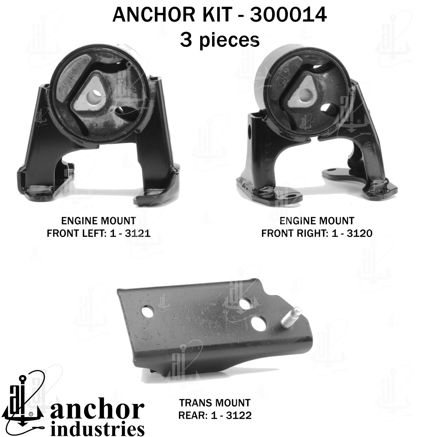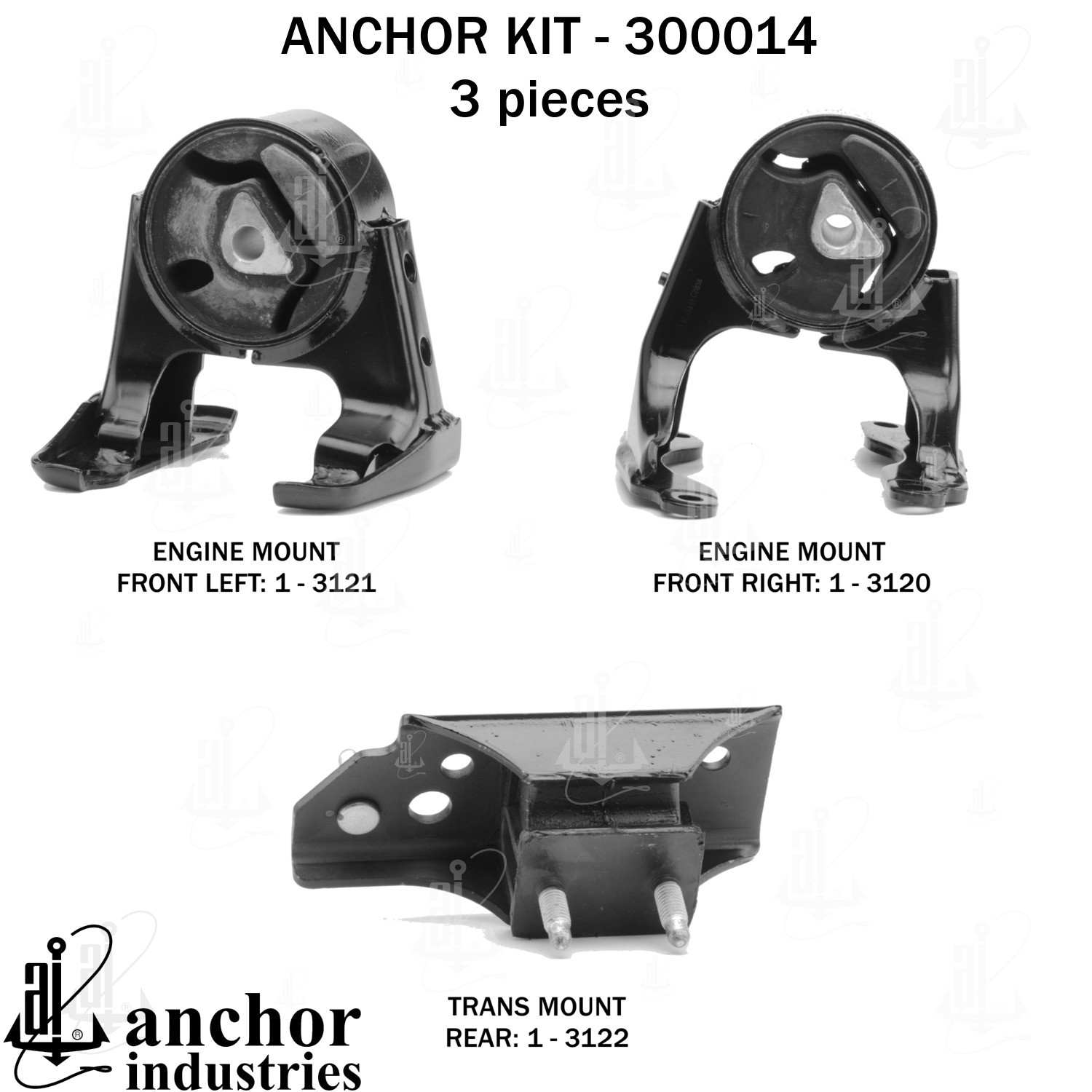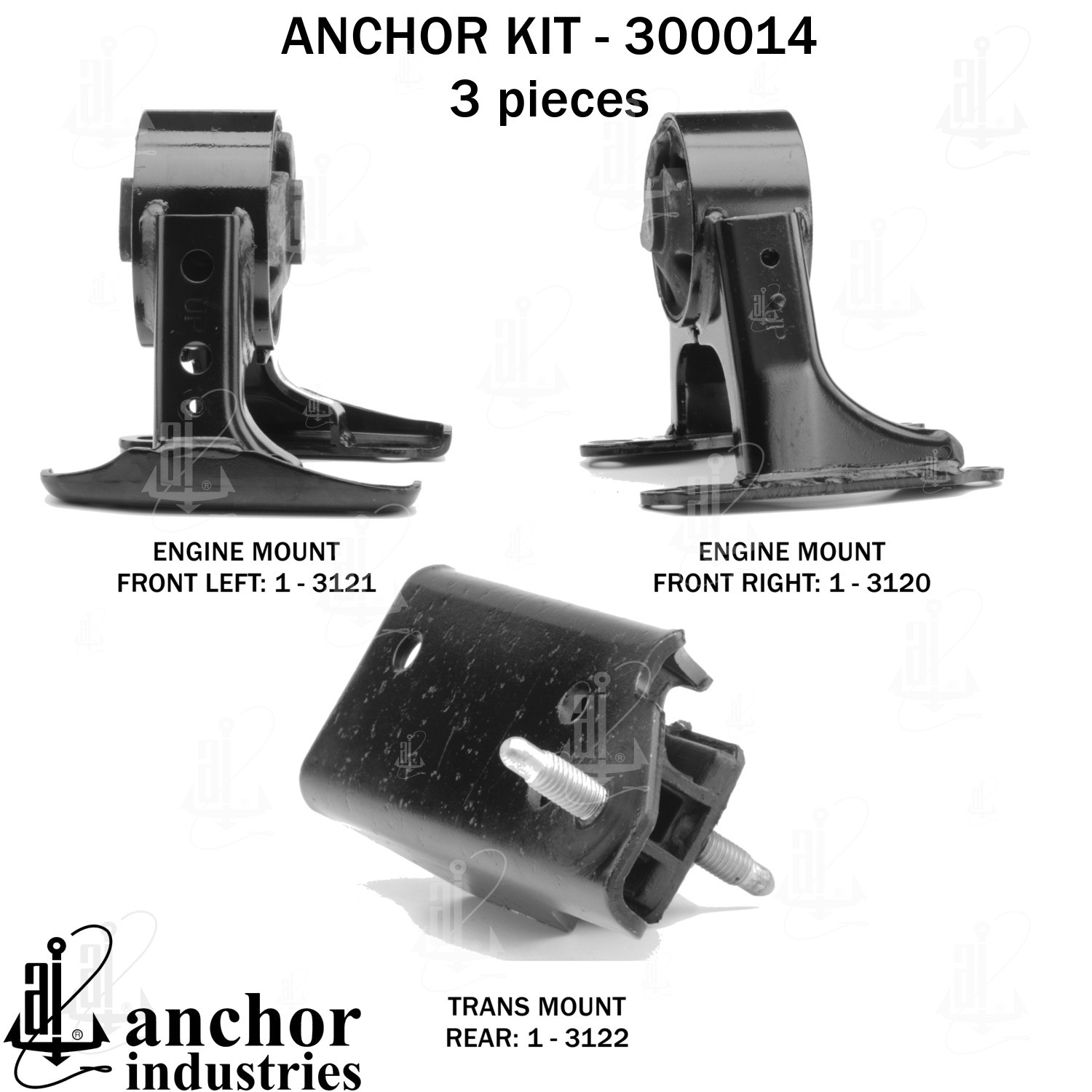 • Anchor 300014ENGINE MNT KIT Each part of this kit is specifically engineered and manufactured to meet or exceed OE standards to ensure perfect fit and function.Natural and SBR rubber provide maximum life and performance.Steel fasteners are heat treated grade 5 bolts.A special bonding agent is used to ensure a rubber to metal bond.Rubber material is mixed to specific Durometer, hardness.12 Month Warranty.