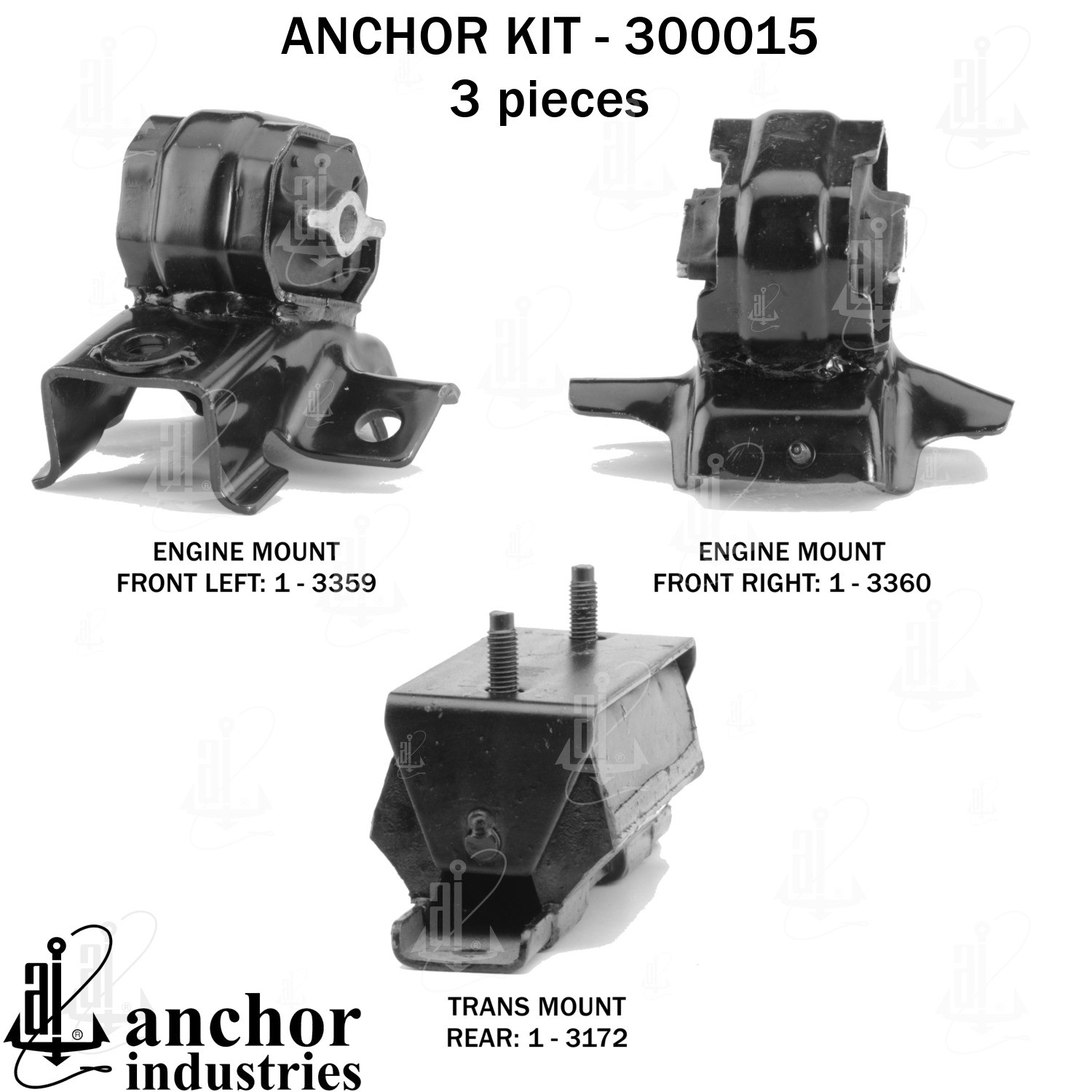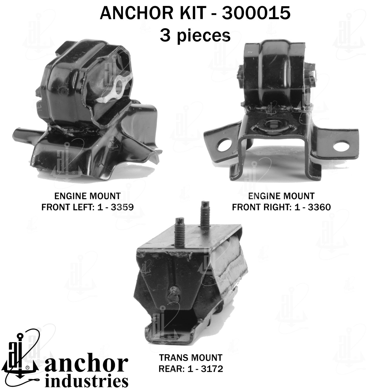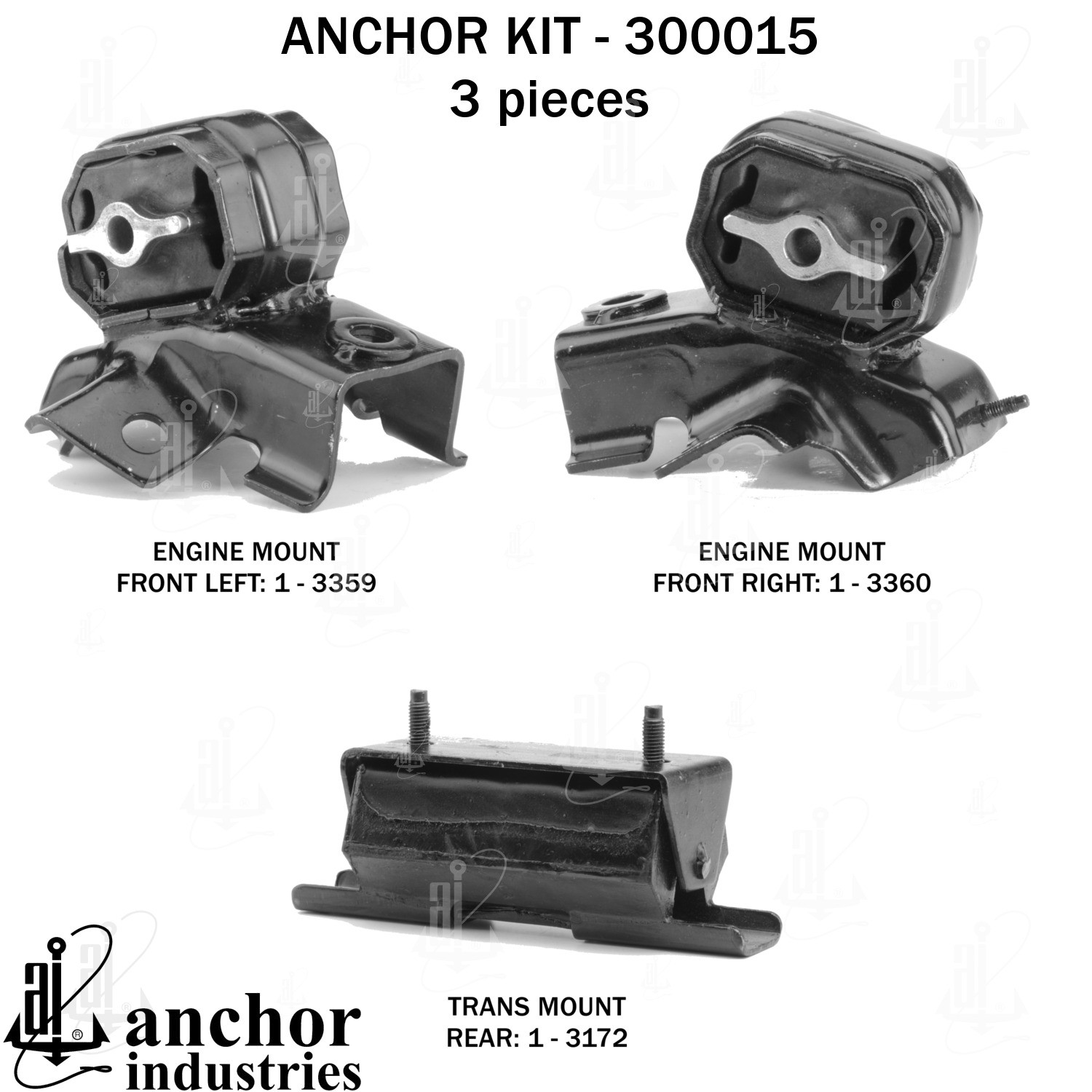 - Anchor 300015; ENGINE MNT KIT ; Each part of this kit is specifically engineered and manufactured to meet or exceed OE standards to ensure perfect fit and function. Natural and SBR rubber provide maximum life and performance. Steel fasteners are heat treated grade 5 bolts. A special bonding agent is used to ensure a rubber to metal bond. Rubber material is mixed to specific Durometer, hardness. 12 Month Warranty.