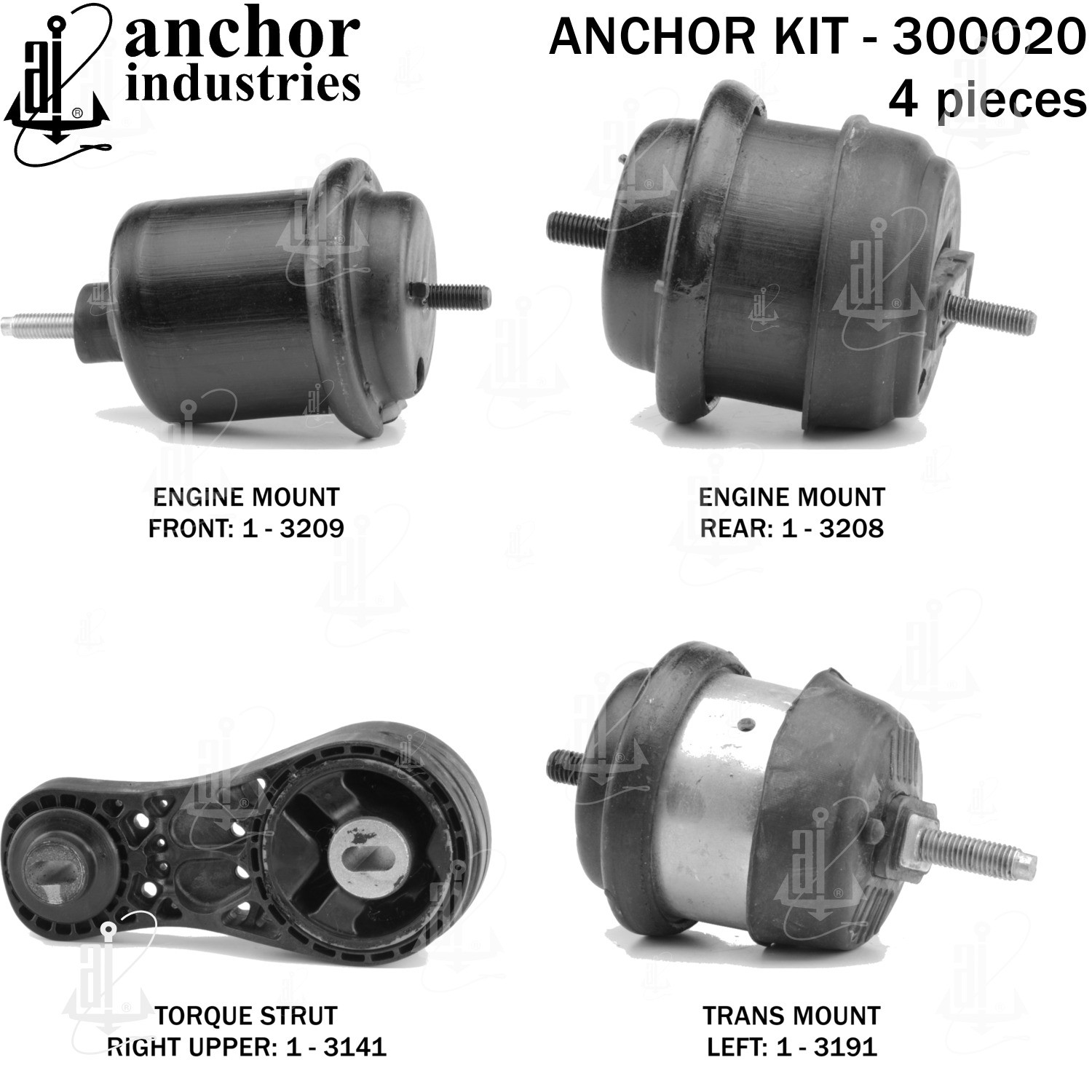 | KIT | 1-3209 engine mount front / 1-3208 engine mount rear / 1-3141 torque strut right upper / 1-3191 trans mount left |