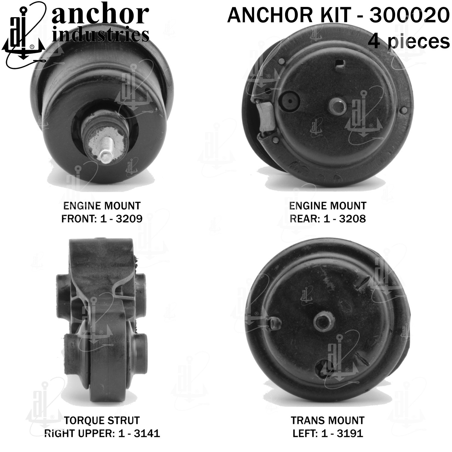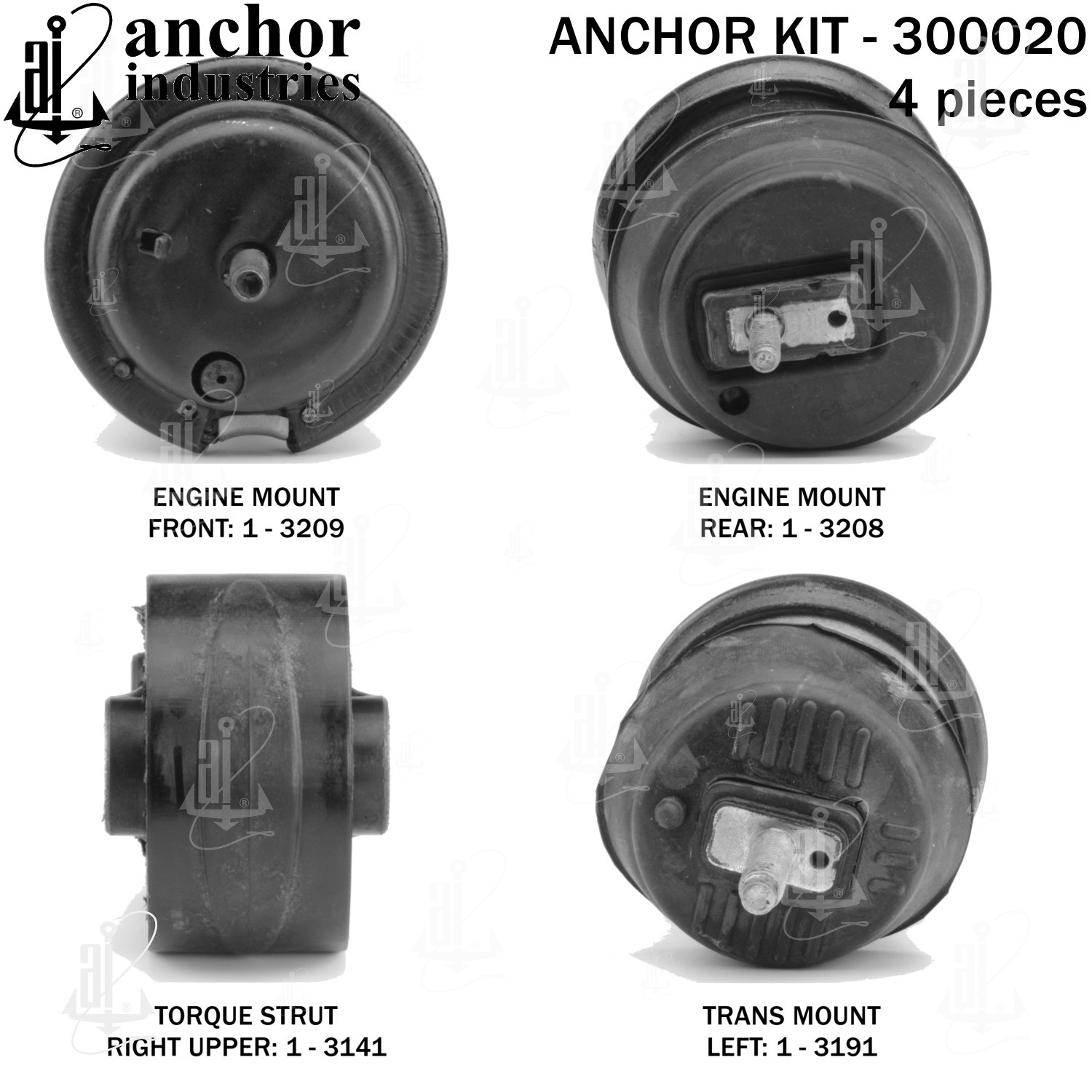 - Anchor 300020; ENGINE MNT KIT ; Each part of this kit is specifically engineered and manufactured to meet or exceed OE standards to ensure perfect fit and function. Natural and SBR rubber provide maximum life and performance. Steel fasteners are heat treated grade 5 bolts. A special bonding agent is used to ensure a rubber to metal bond. Rubber material is mixed to specific Durometer, hardness. 12 Month Warranty.