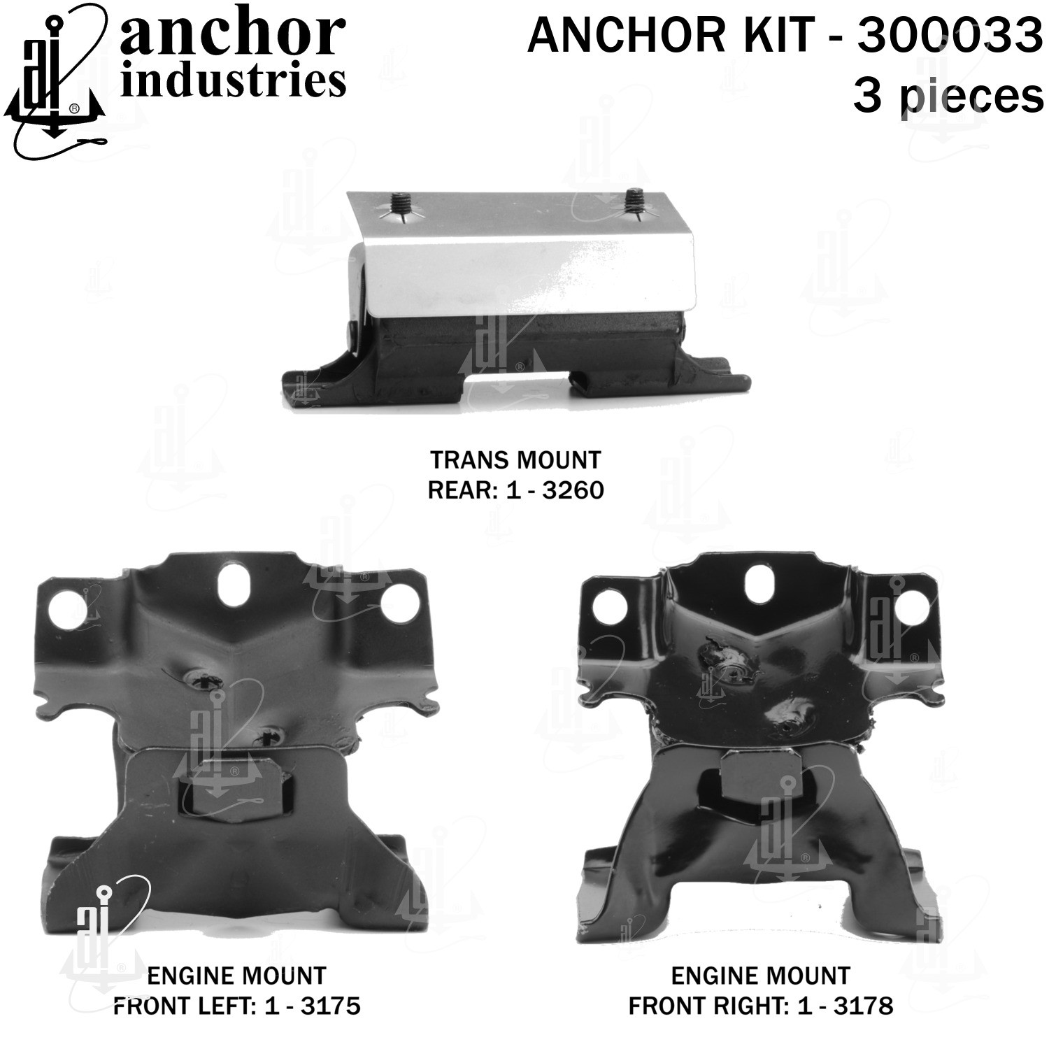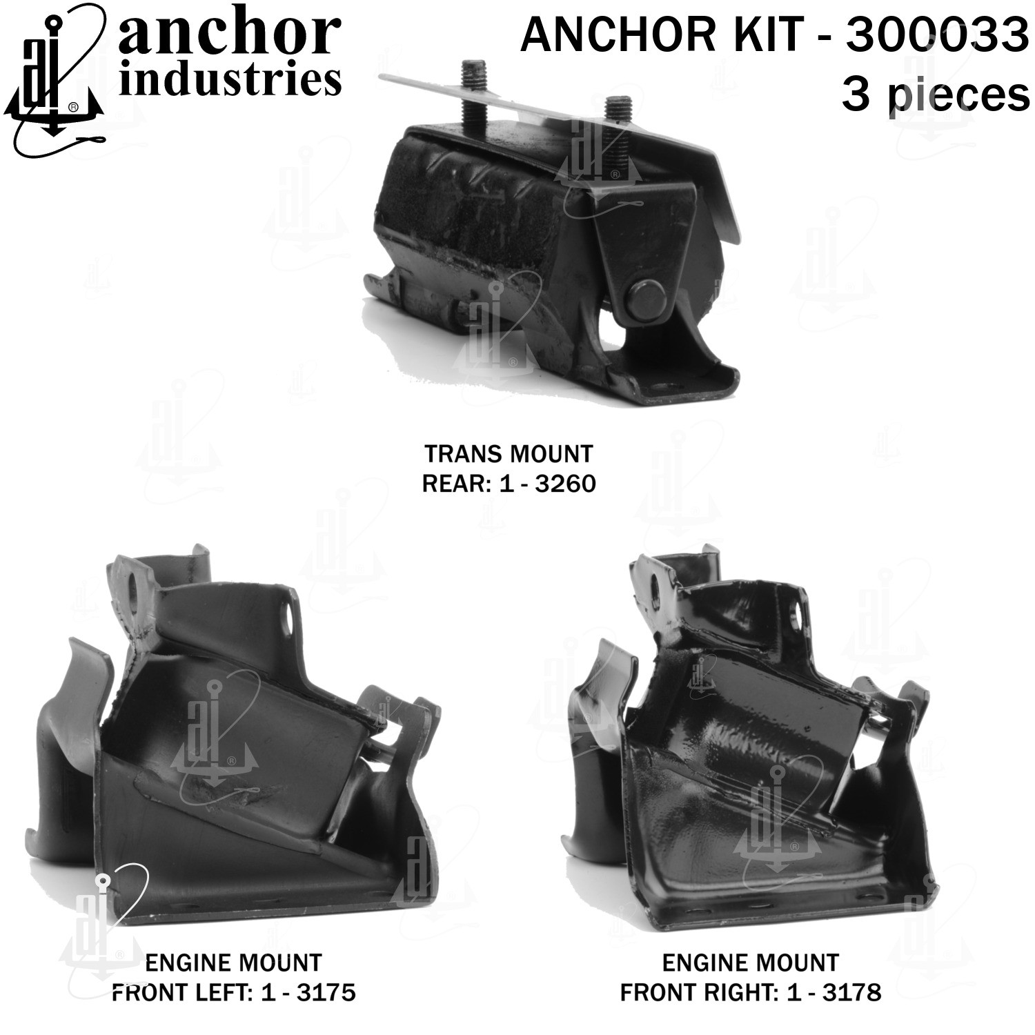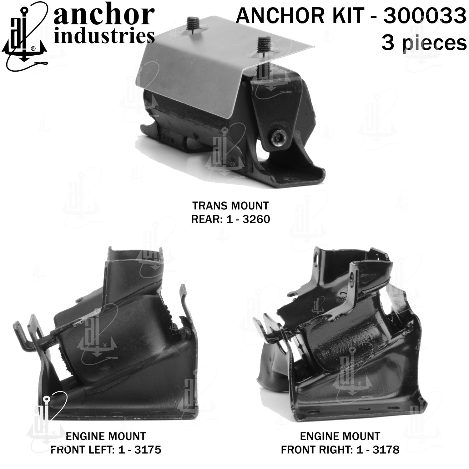 - Anchor 300033; ENGINE MNT KIT ; Each part of this kit is specifically engineered and manufactured to meet or exceed OE standards to ensure perfect fit and function. Natural and SBR rubber provide maximum life and performance. Steel fasteners are heat treated grade 5 bolts. A special bonding agent is used to ensure a rubber to metal bond. Rubber material is mixed to specific Durometer, hardness. 12 Month Warranty.