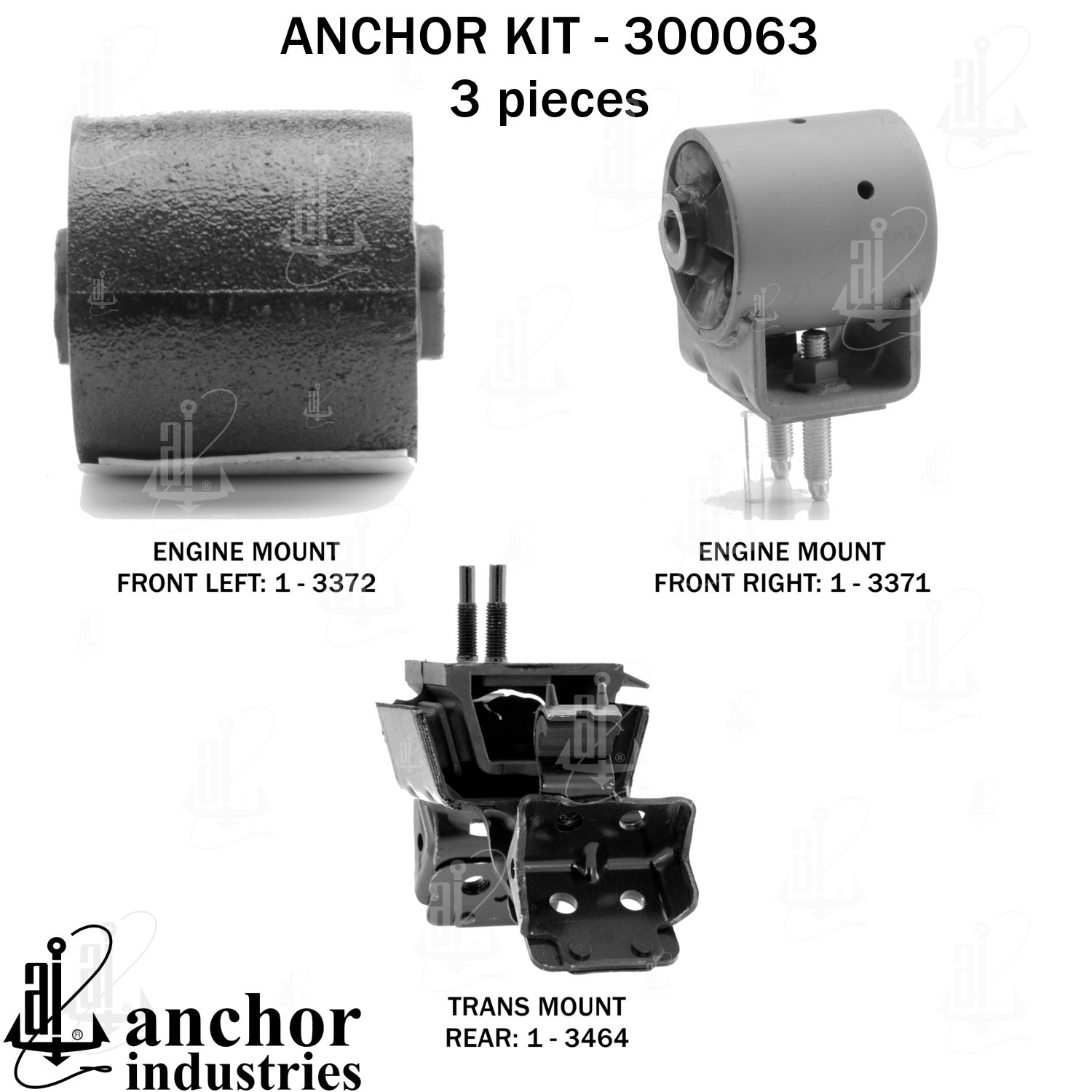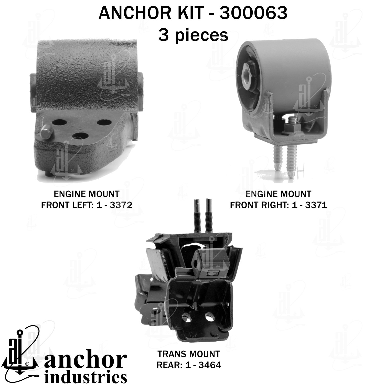 - Anchor 300063; ENGINE MNT KIT ; Each part of this kit is specifically engineered and manufactured to meet or exceed OE standards to ensure perfect fit and function. Natural and SBR rubber provide maximum life and performance. Steel fasteners are heat treated grade 5 bolts. A special bonding agent is used to ensure a rubber to metal bond. Rubber material is mixed to specific Durometer, hardness. 12 Month Warranty.