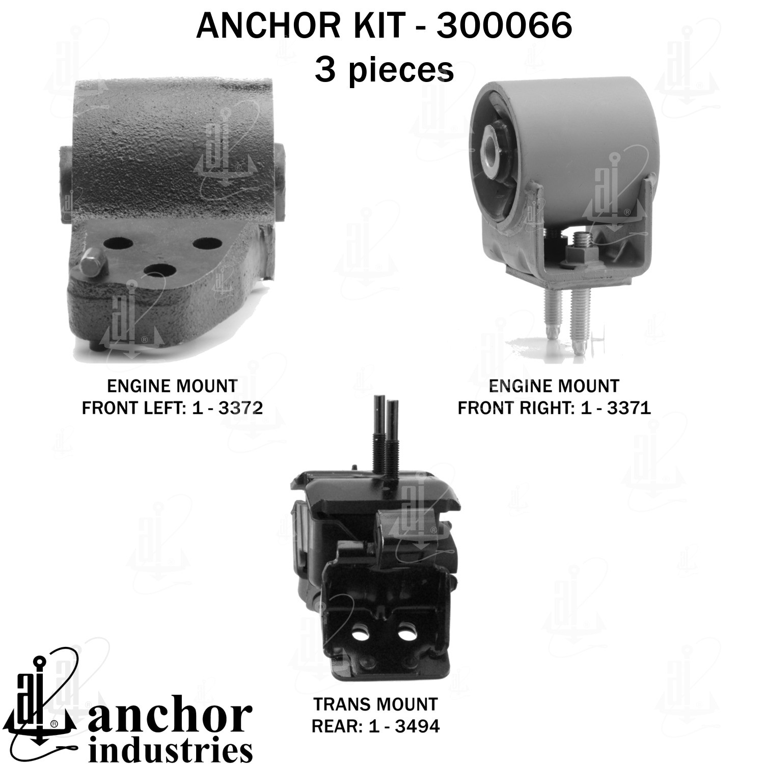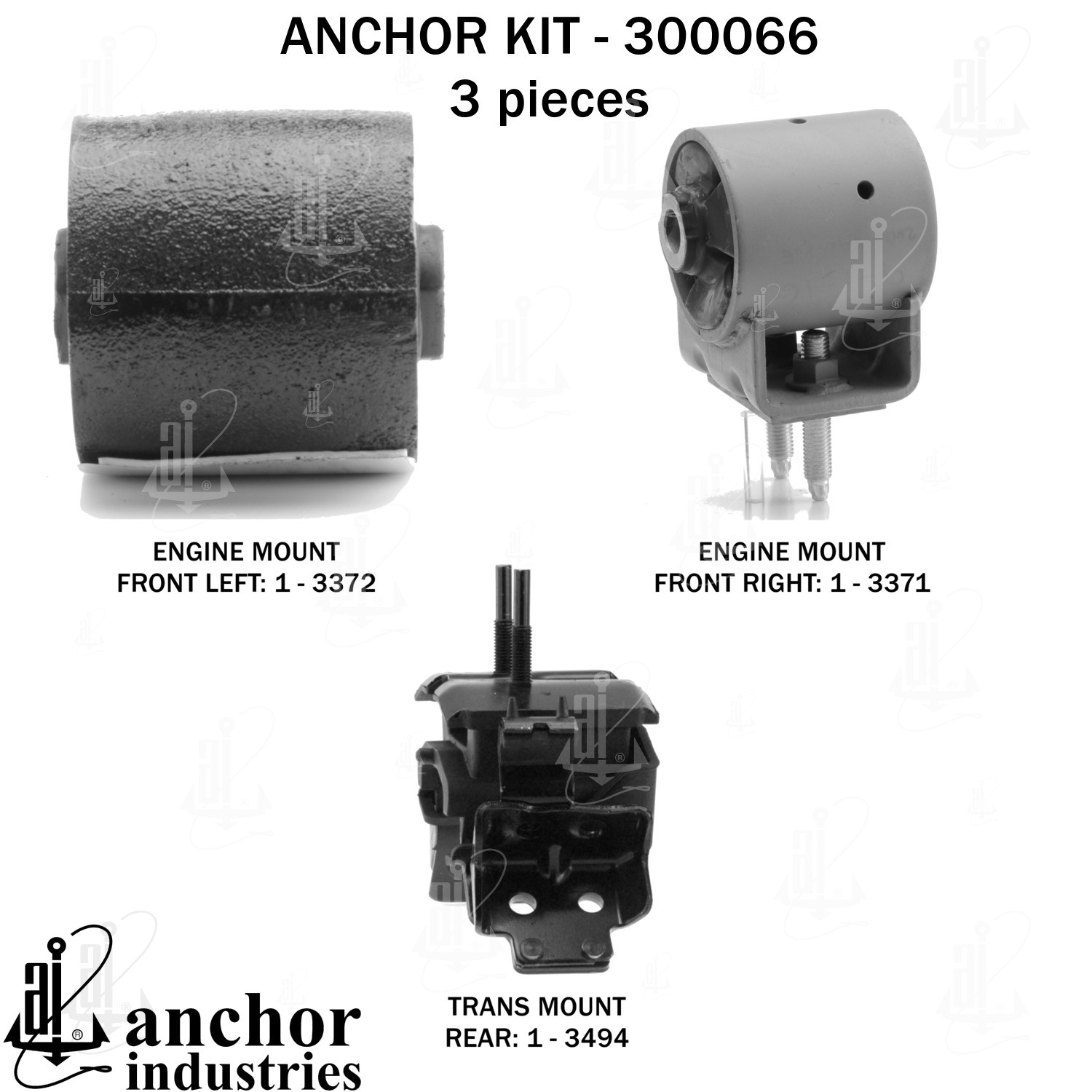 - Anchor 300066; ENGINE MNT KIT ; Each part of this kit is specifically engineered and manufactured to meet or exceed OE standards to ensure perfect fit and function. Natural and SBR rubber provide maximum life and performance. Steel fasteners are heat treated grade 5 bolts. A special bonding agent is used to ensure a rubber to metal bond. Rubber material is mixed to specific Durometer, hardness. 12 Month Warranty.