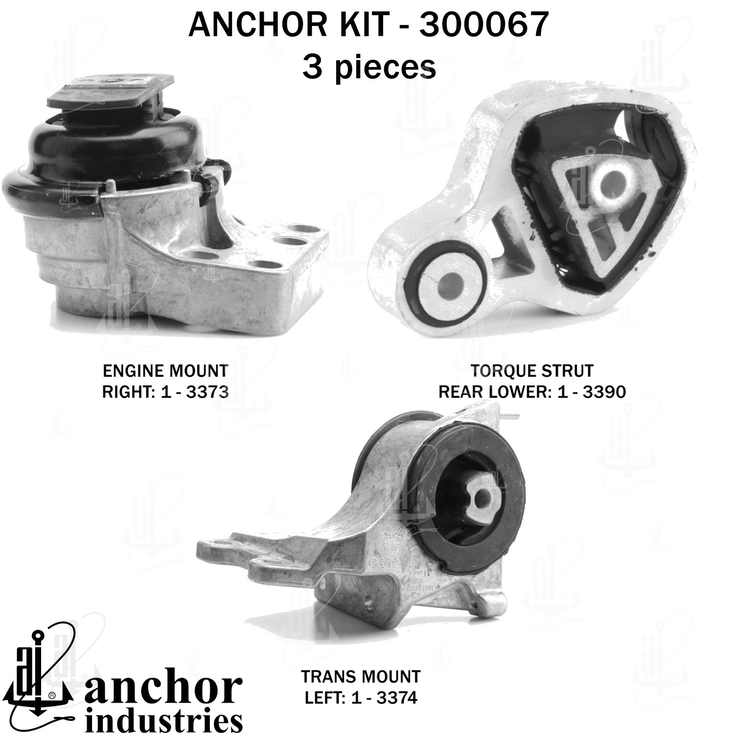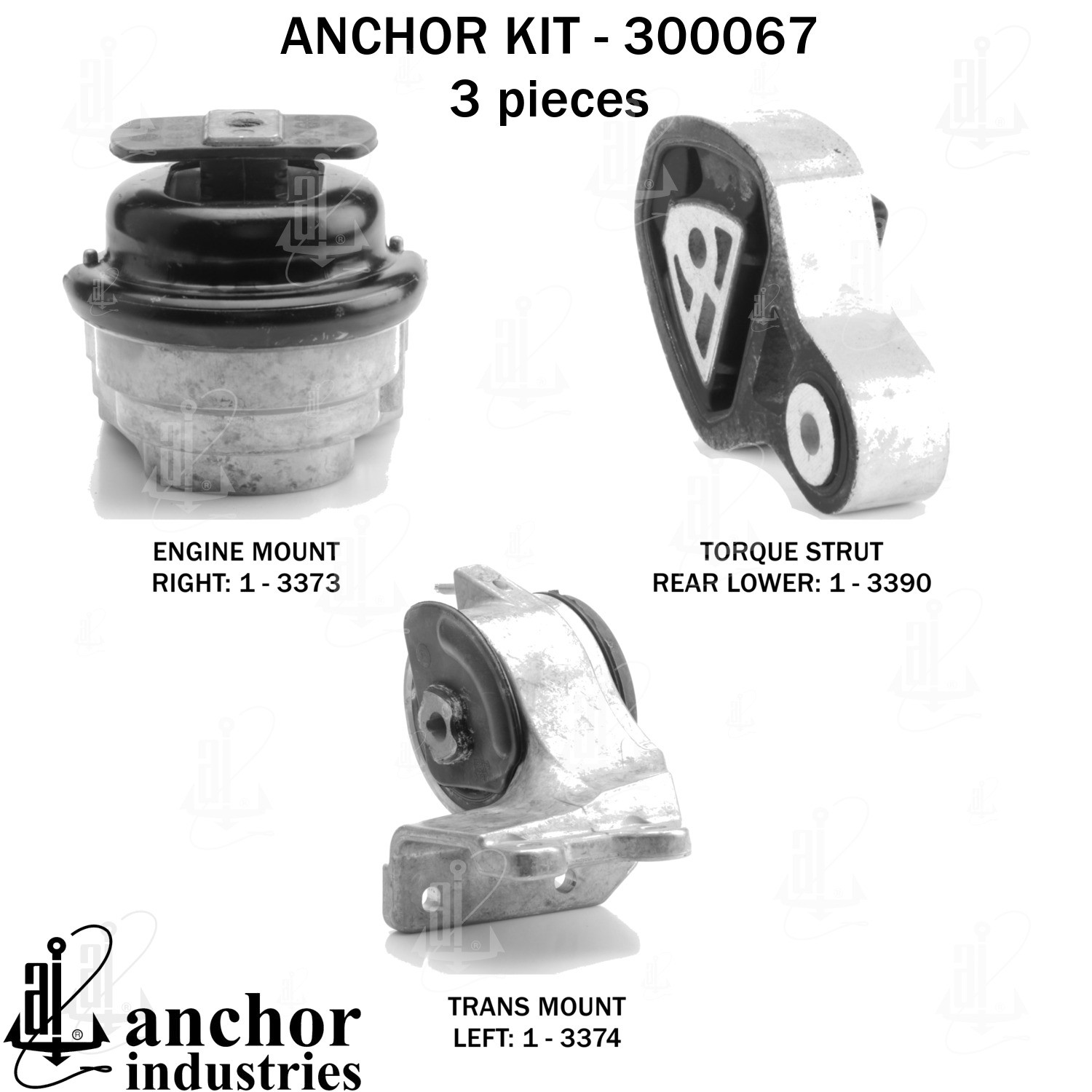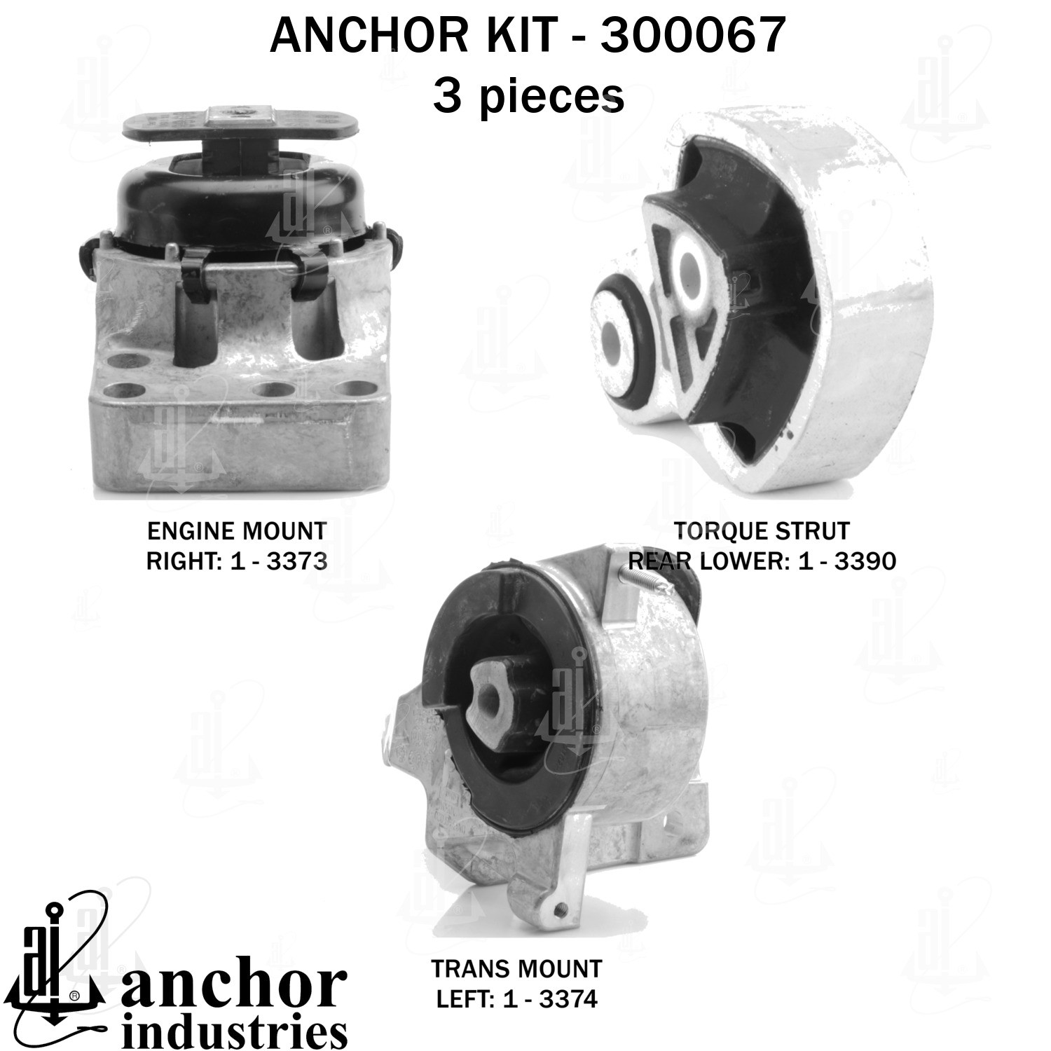 - Anchor 300067; ENGINE MNT KIT ; Each part of this kit is specifically engineered and manufactured to meet or exceed OE standards to ensure perfect fit and function. Natural and SBR rubber provide maximum life and performance. Steel fasteners are heat treated grade 5 bolts. A special bonding agent is used to ensure a rubber to metal bond. Rubber material is mixed to specific Durometer, hardness. 12 Month Warranty.