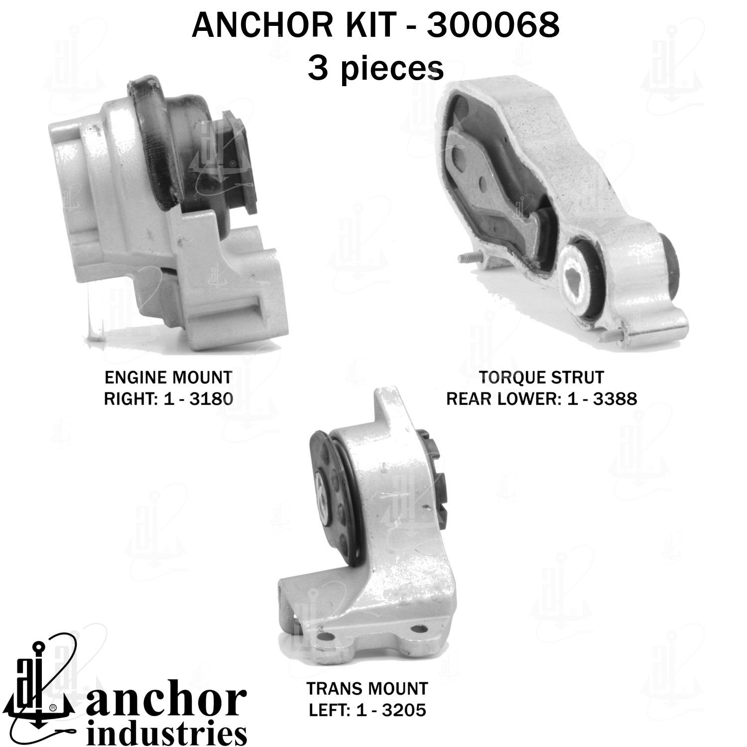 - Anchor 300068; ENGINE MNT KIT ; Each part of this kit is specifically engineered and manufactured to meet or exceed OE standards to ensure perfect fit and function. Natural and SBR rubber provide maximum life and performance. Steel fasteners are heat treated grade 5 bolts. A special bonding agent is used to ensure a rubber to metal bond. Rubber material is mixed to specific Durometer, hardness. 12 Month Warranty.