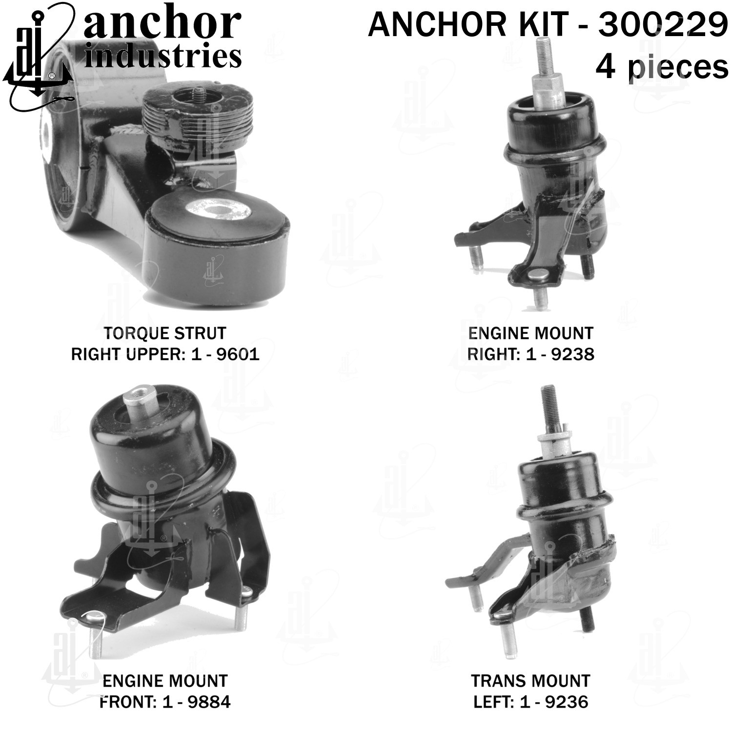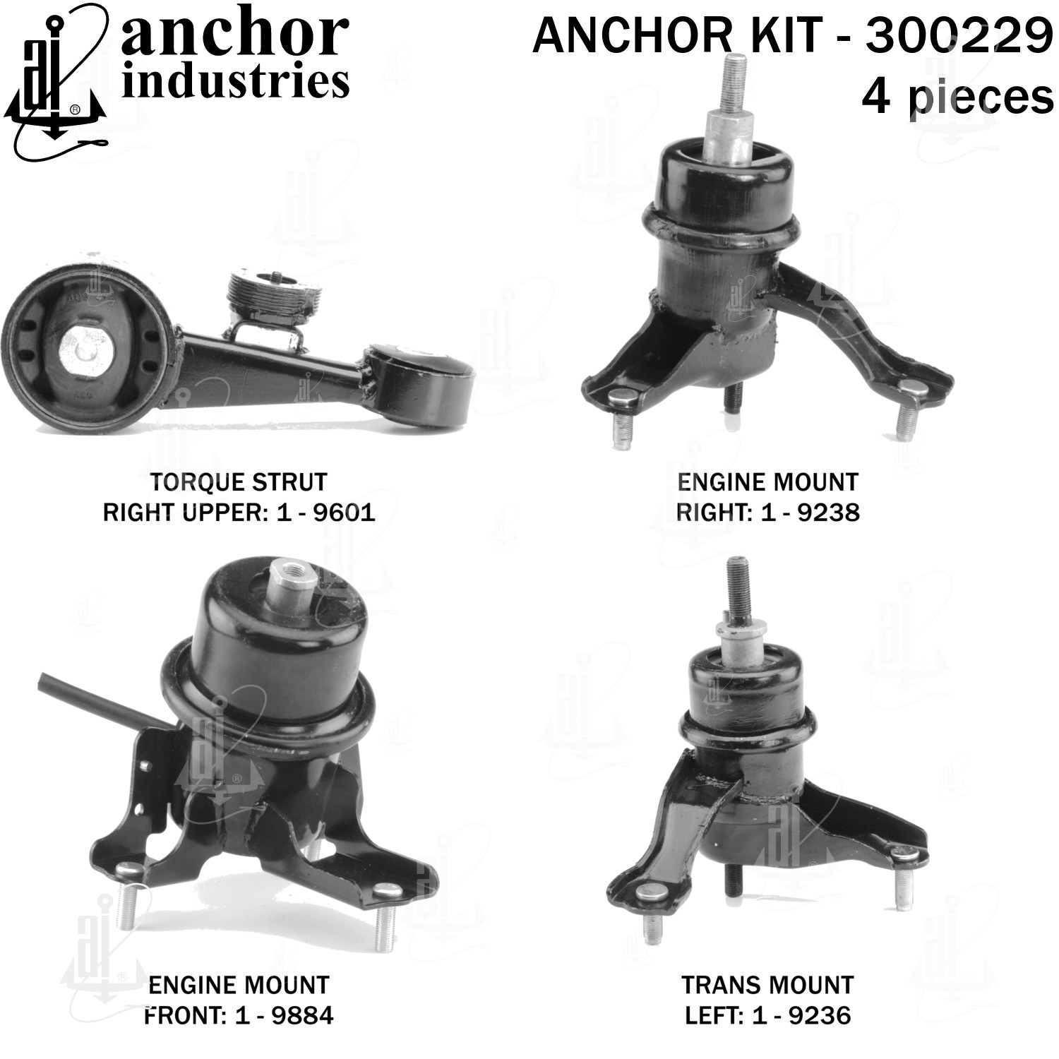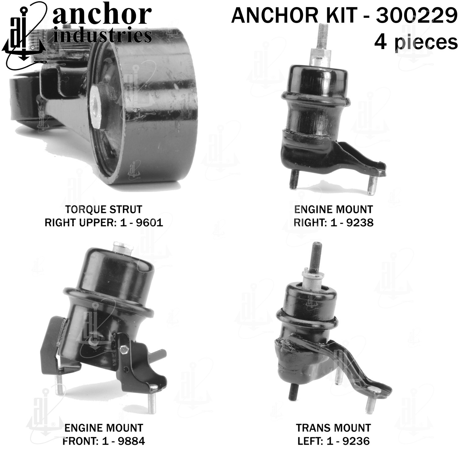 - Anchor 300229; ENGINE MNT KIT ; Each part of this kit is specifically engineered and manufactured to meet or exceed OE standards to ensure perfect fit and function. Natural and SBR rubber provide maximum life and performance. Steel fasteners are heat treated grade 5 bolts. A special bonding agent is used to ensure a rubber to metal bond. Rubber material is mixed to specific Durometer, hardness. 12 Month Warranty.