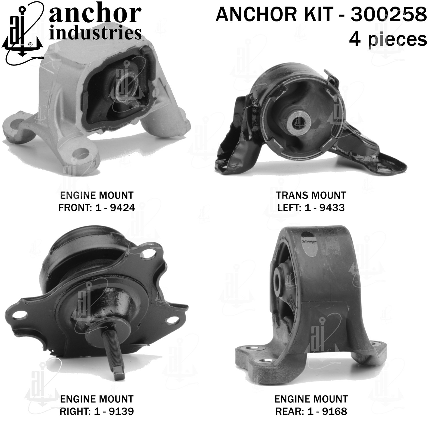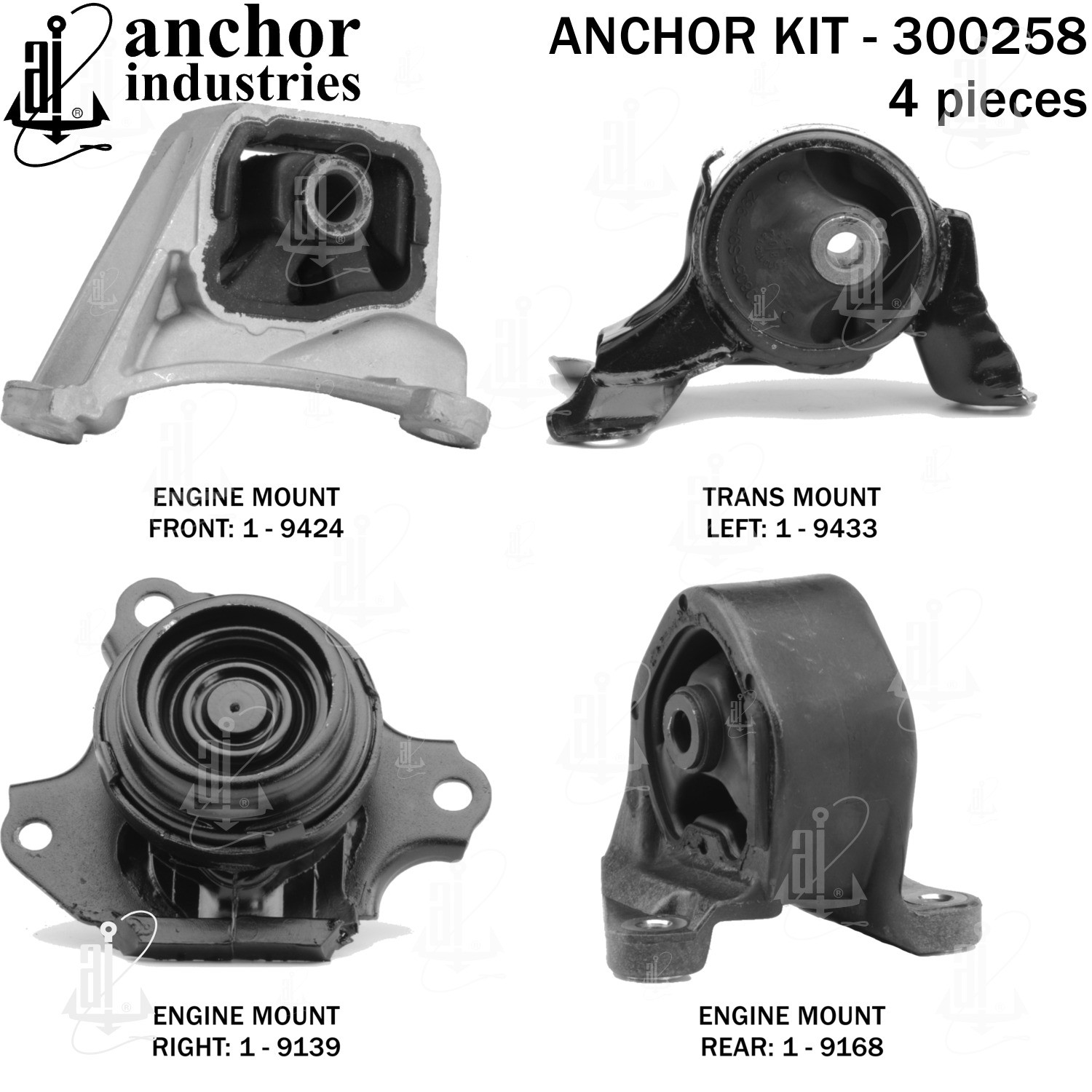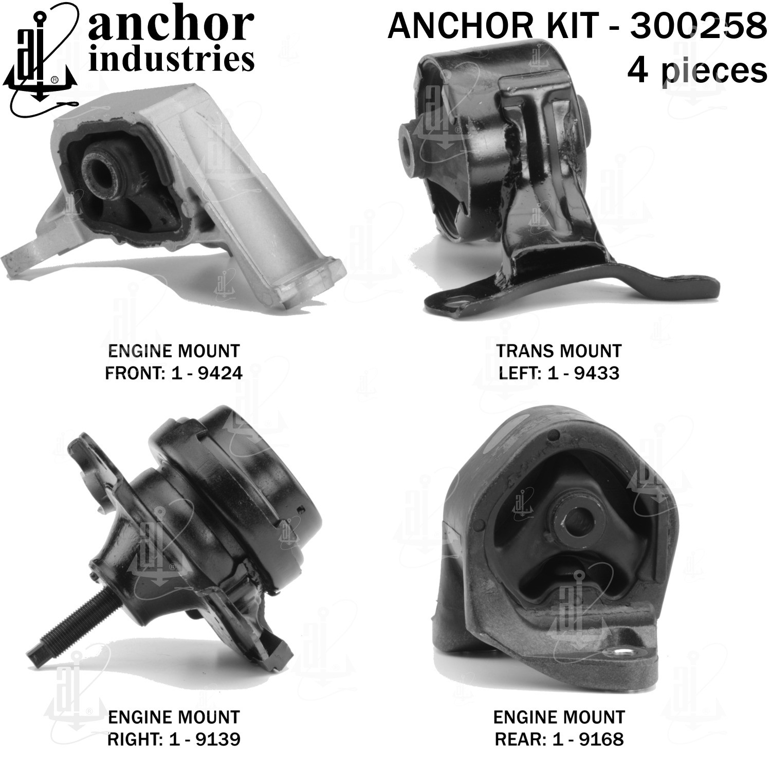 - Anchor 300258; ENGINE MNT KIT ; Each part of this kit is specifically engineered and manufactured to meet or exceed OE standards to ensure perfect fit and function. Natural and SBR rubber provide maximum life and performance. Steel fasteners are heat treated grade 5 bolts. A special bonding agent is used to ensure a rubber to metal bond. Rubber material is mixed to specific Durometer, hardness. 12 Month Warranty.