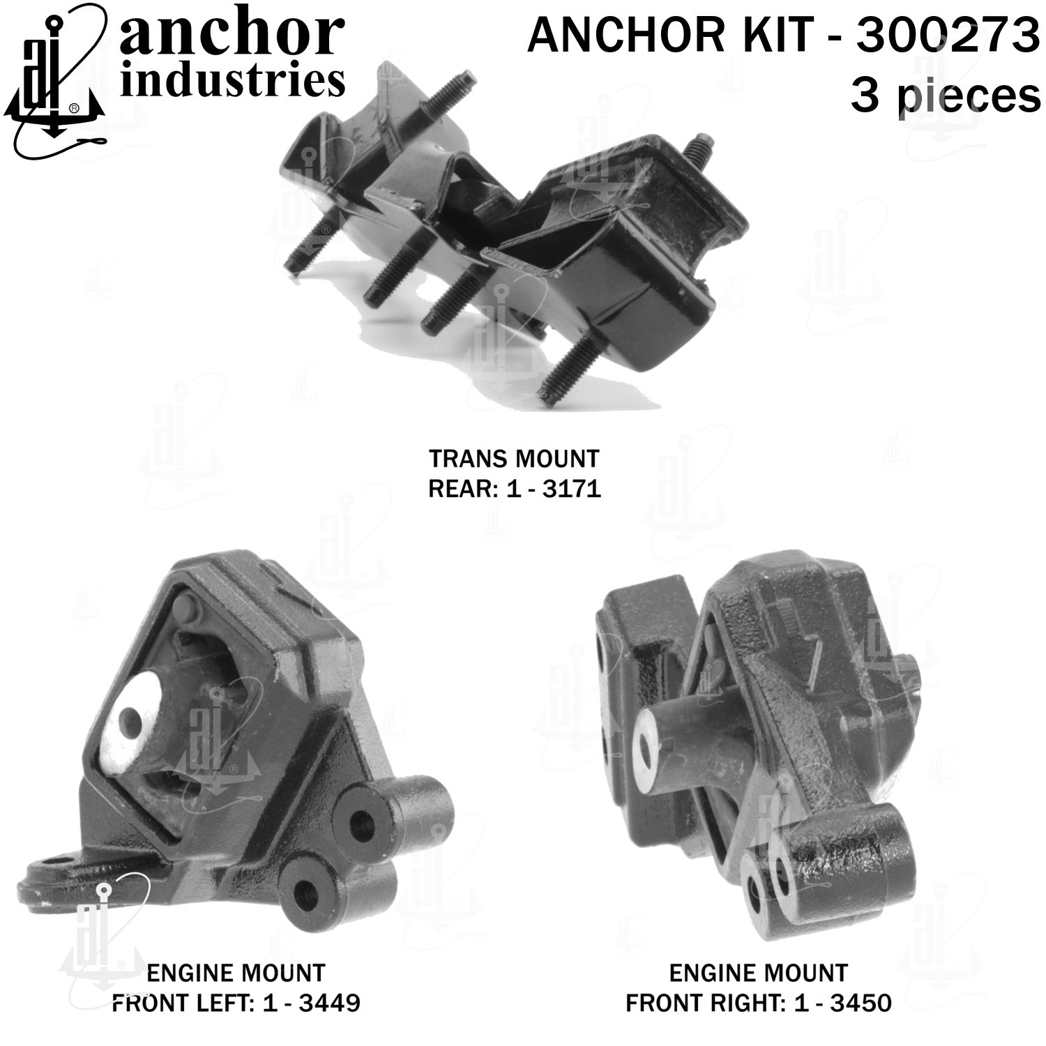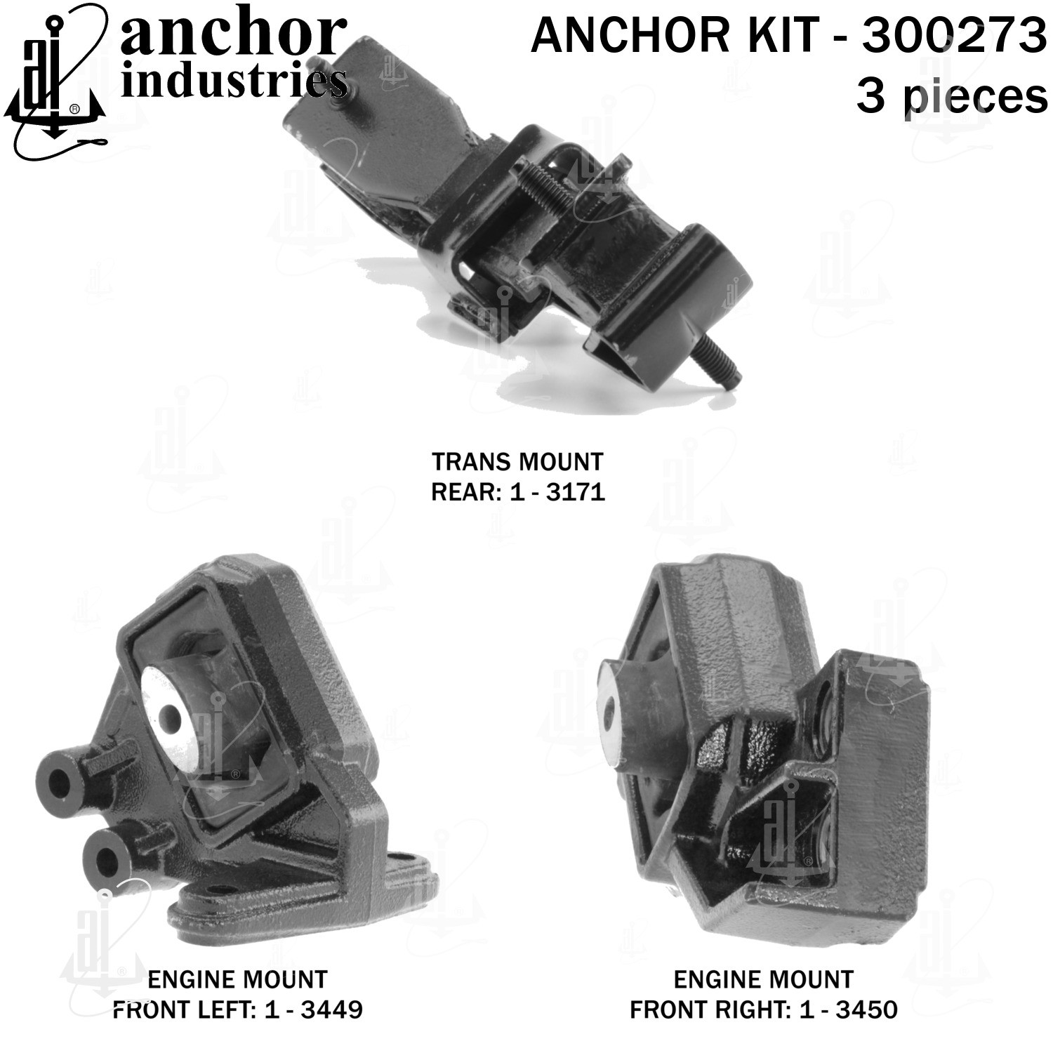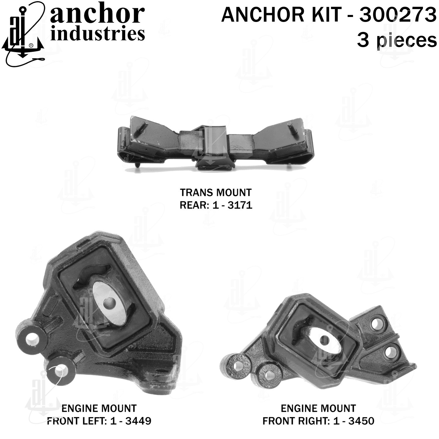 - Anchor 300273; ENGINE MNT KIT ; Each part of this kit is specifically engineered and manufactured to meet or exceed OE standards to ensure perfect fit and function. Natural and SBR rubber provide maximum life and performance. Steel fasteners are heat treated grade 5 bolts. A special bonding agent is used to ensure a rubber to metal bond. Rubber material is mixed to specific Durometer, hardness. 12 Month Warranty.