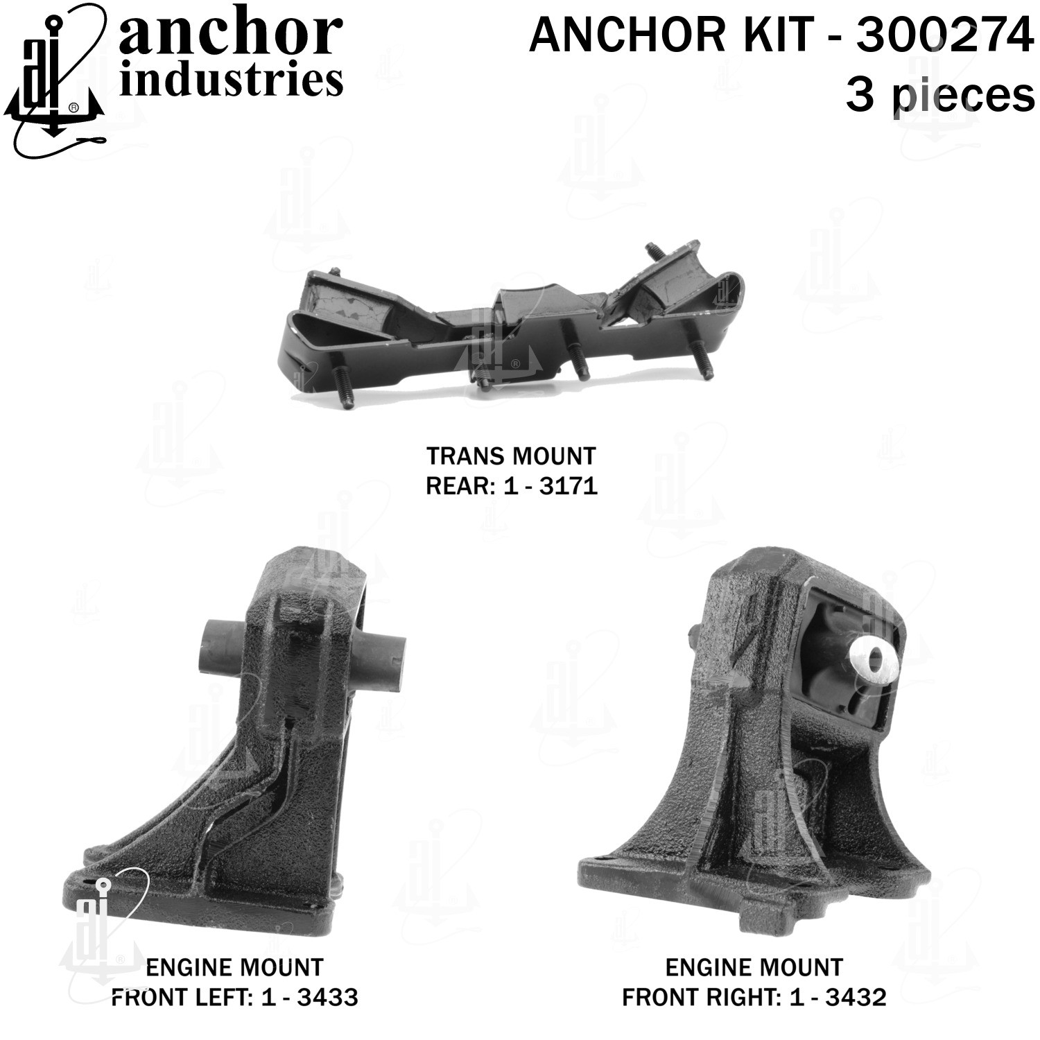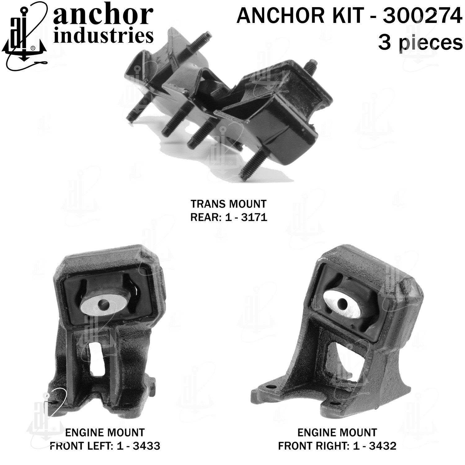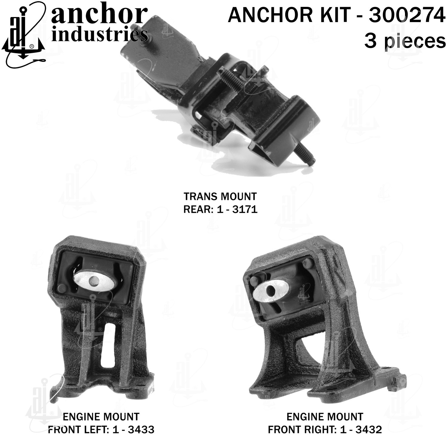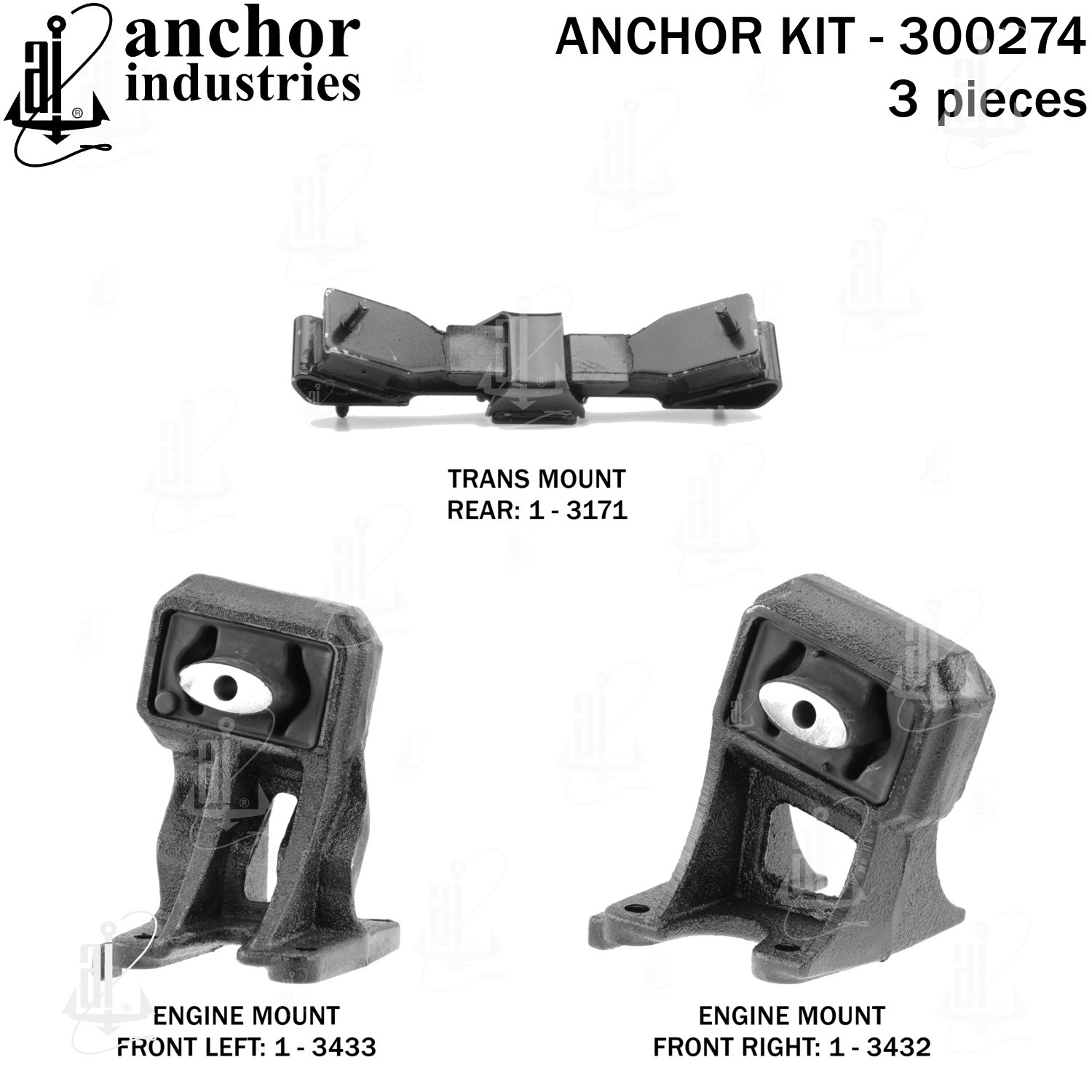 - Anchor 300274; ENGINE MNT KIT ; Each part of this kit is specifically engineered and manufactured to meet or exceed OE standards to ensure perfect fit and function. Natural and SBR rubber provide maximum life and performance. Steel fasteners are heat treated grade 5 bolts. A special bonding agent is used to ensure a rubber to metal bond. Rubber material is mixed to specific Durometer, hardness. 12 Month Warranty.