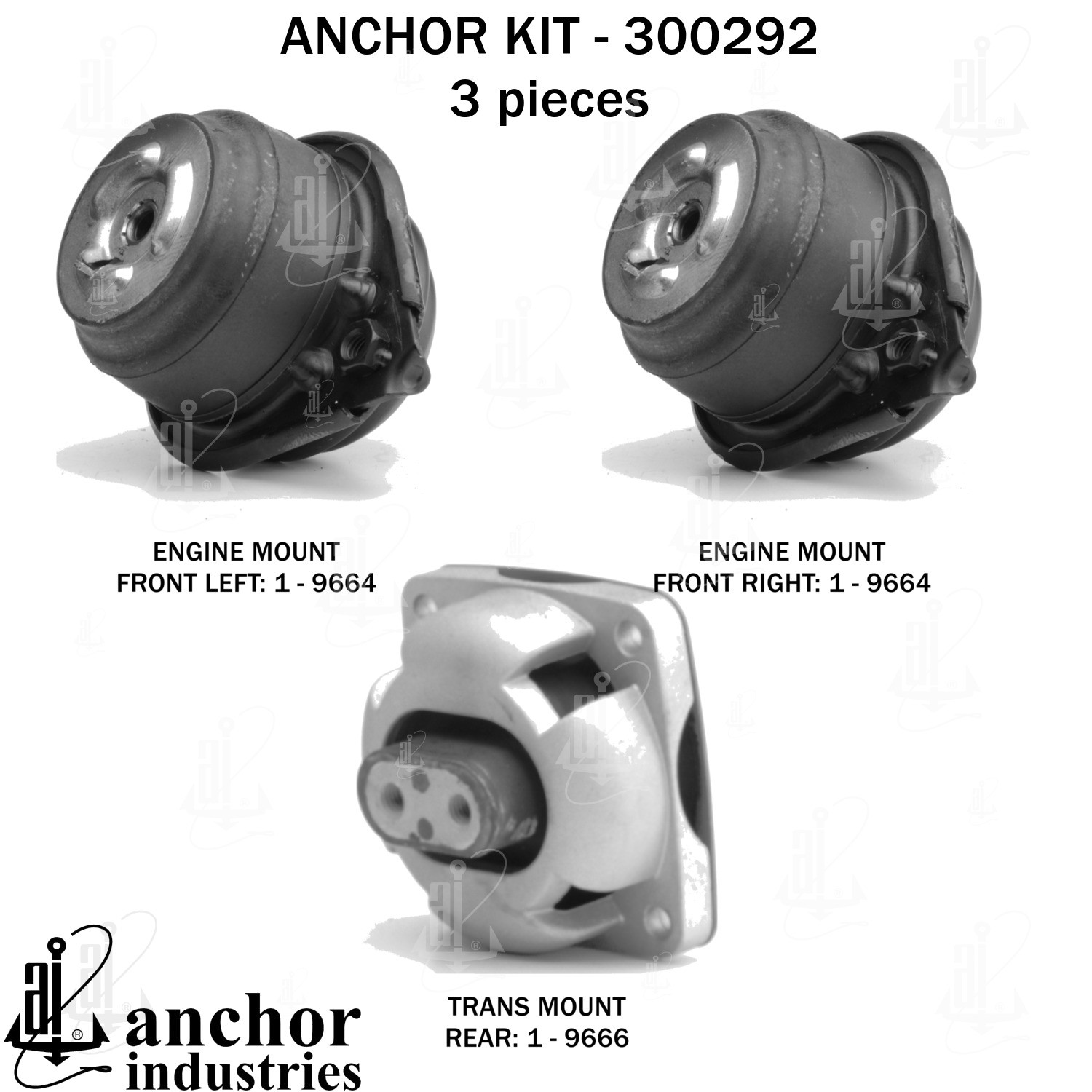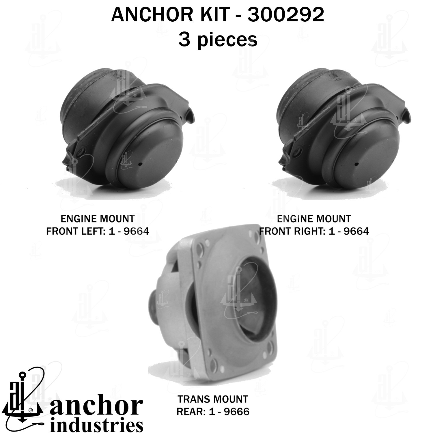 - Anchor 300292; ENGINE MNT KIT ; Each part of this kit is specifically engineered and manufactured to meet or exceed OE standards to ensure perfect fit and function. Natural and SBR rubber provide maximum life and performance. Steel fasteners are heat treated grade 5 bolts. A special bonding agent is used to ensure a rubber to metal bond. Rubber material is mixed to specific Durometer, hardness. 12 Month Warranty.
