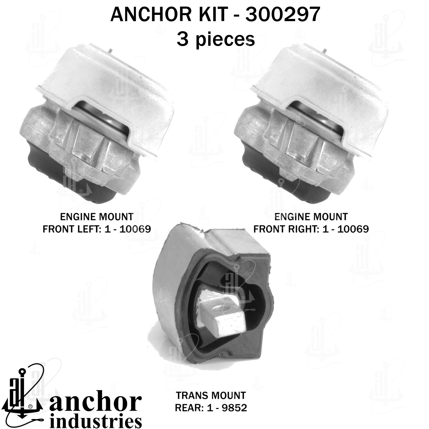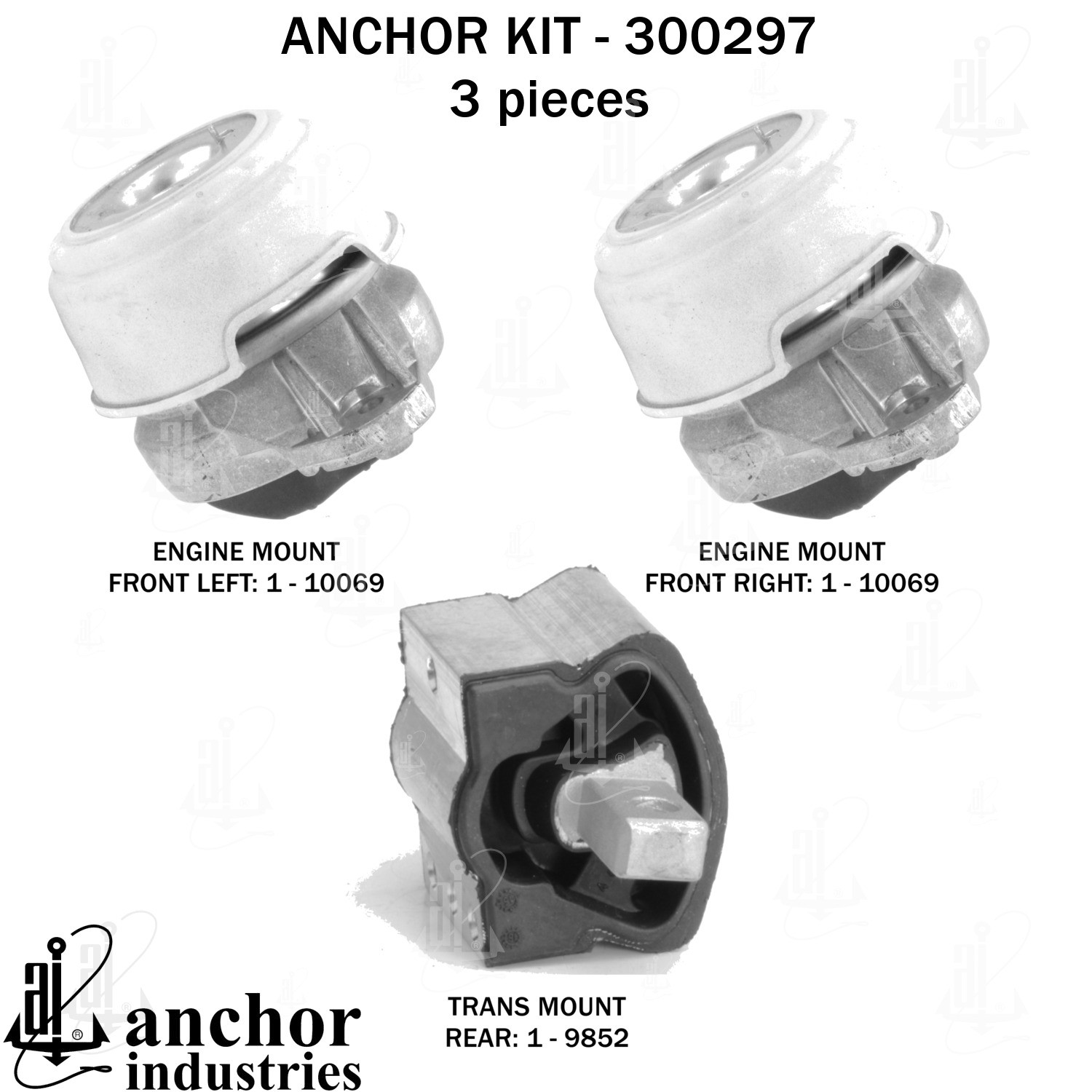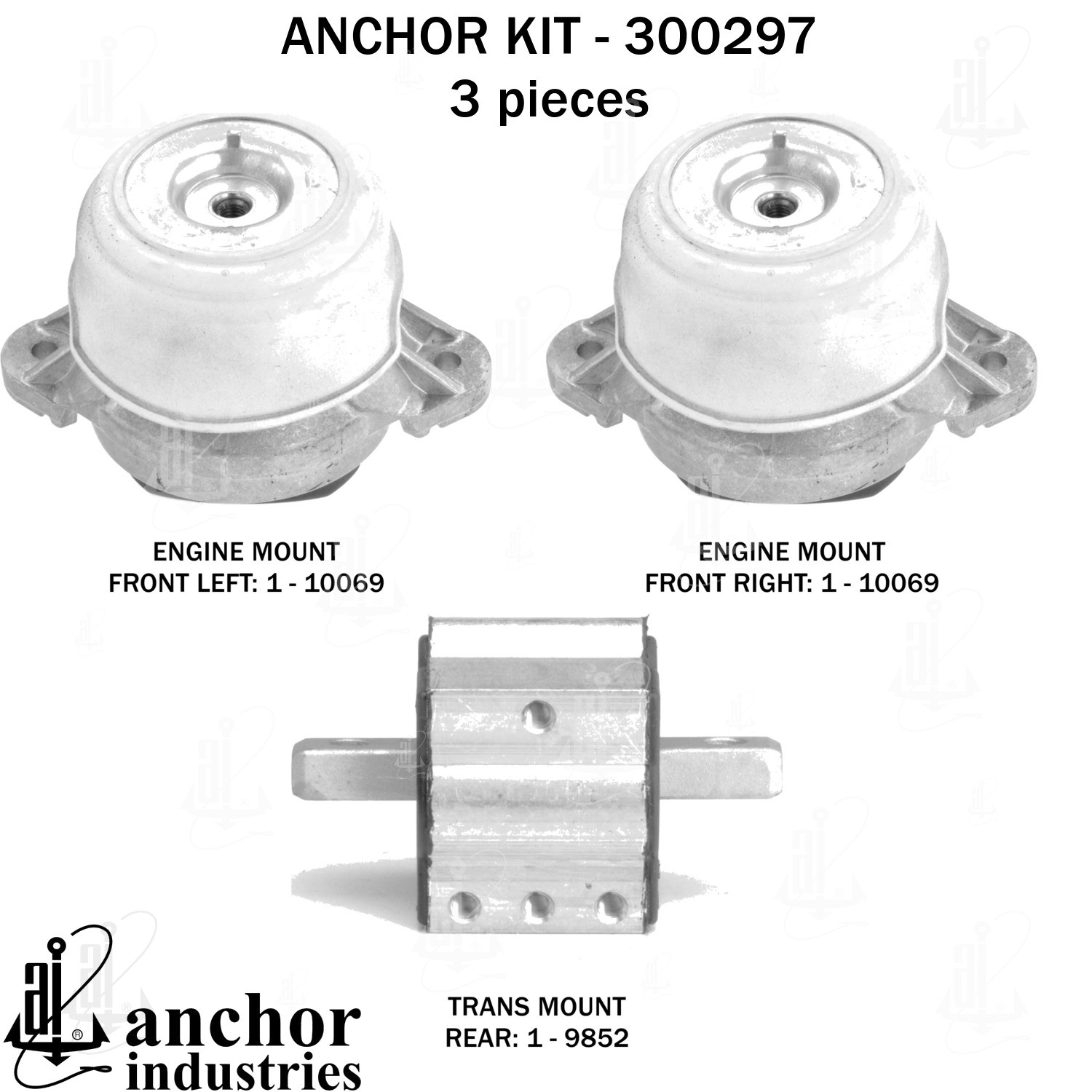 - Anchor 300297; ENGINE MNT KIT ; Each part of this kit is specifically engineered and manufactured to meet or exceed OE standards to ensure perfect fit and function. Natural and SBR rubber provide maximum life and performance. Steel fasteners are heat treated grade 5 bolts. A special bonding agent is used to ensure a rubber to metal bond. Rubber material is mixed to specific Durometer, hardness. 12 Month Warranty.