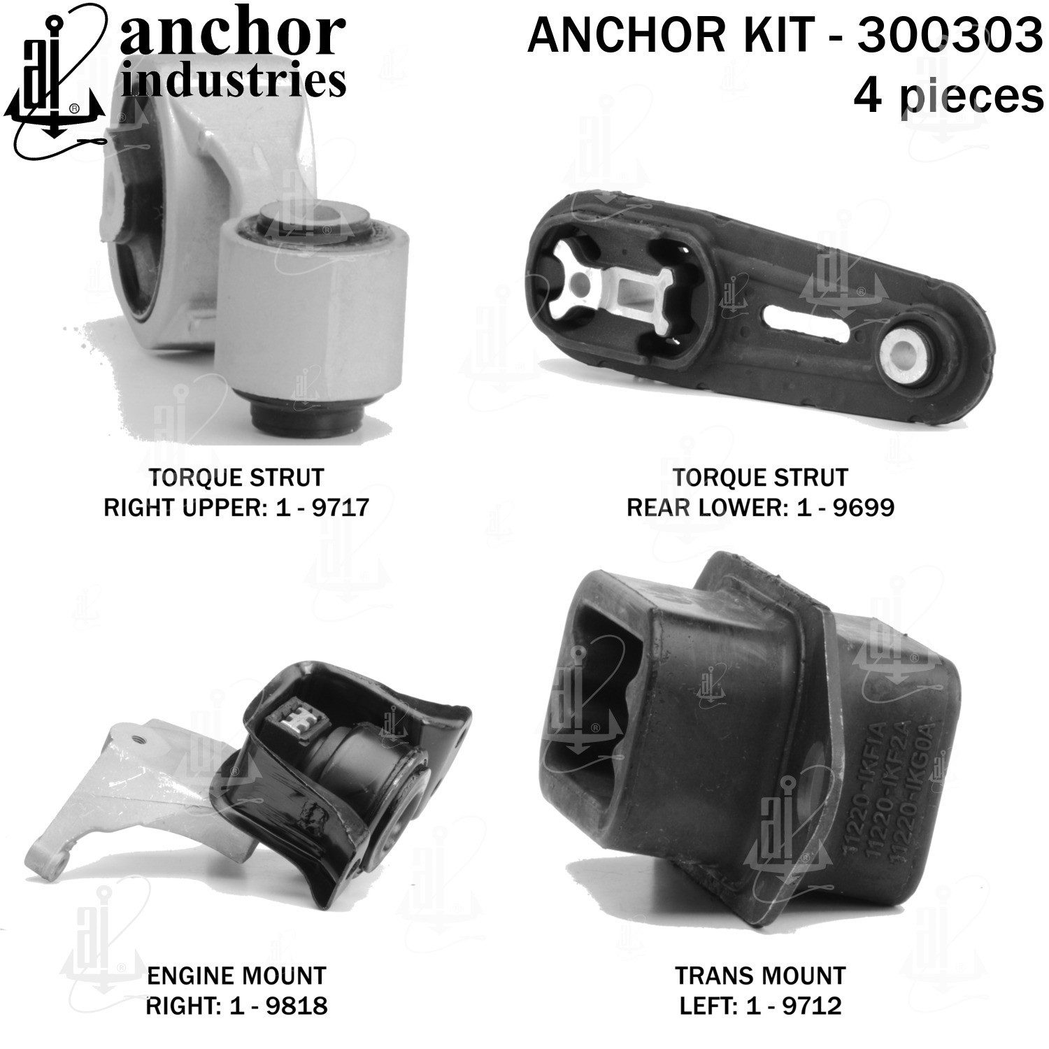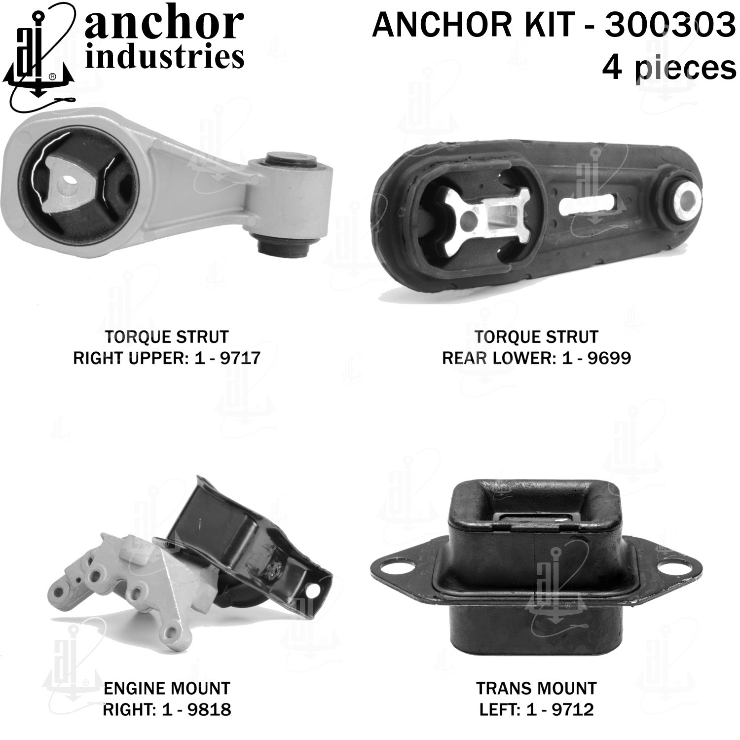 - Anchor 300303; ENGINE MNT KIT ; Each part of this kit is specifically engineered and manufactured to meet or exceed OE standards to ensure perfect fit and function. Natural and SBR rubber provide maximum life and performance. Steel fasteners are heat treated grade 5 bolts. A special bonding agent is used to ensure a rubber to metal bond. Rubber material is mixed to specific Durometer, hardness. 12 Month Warranty.