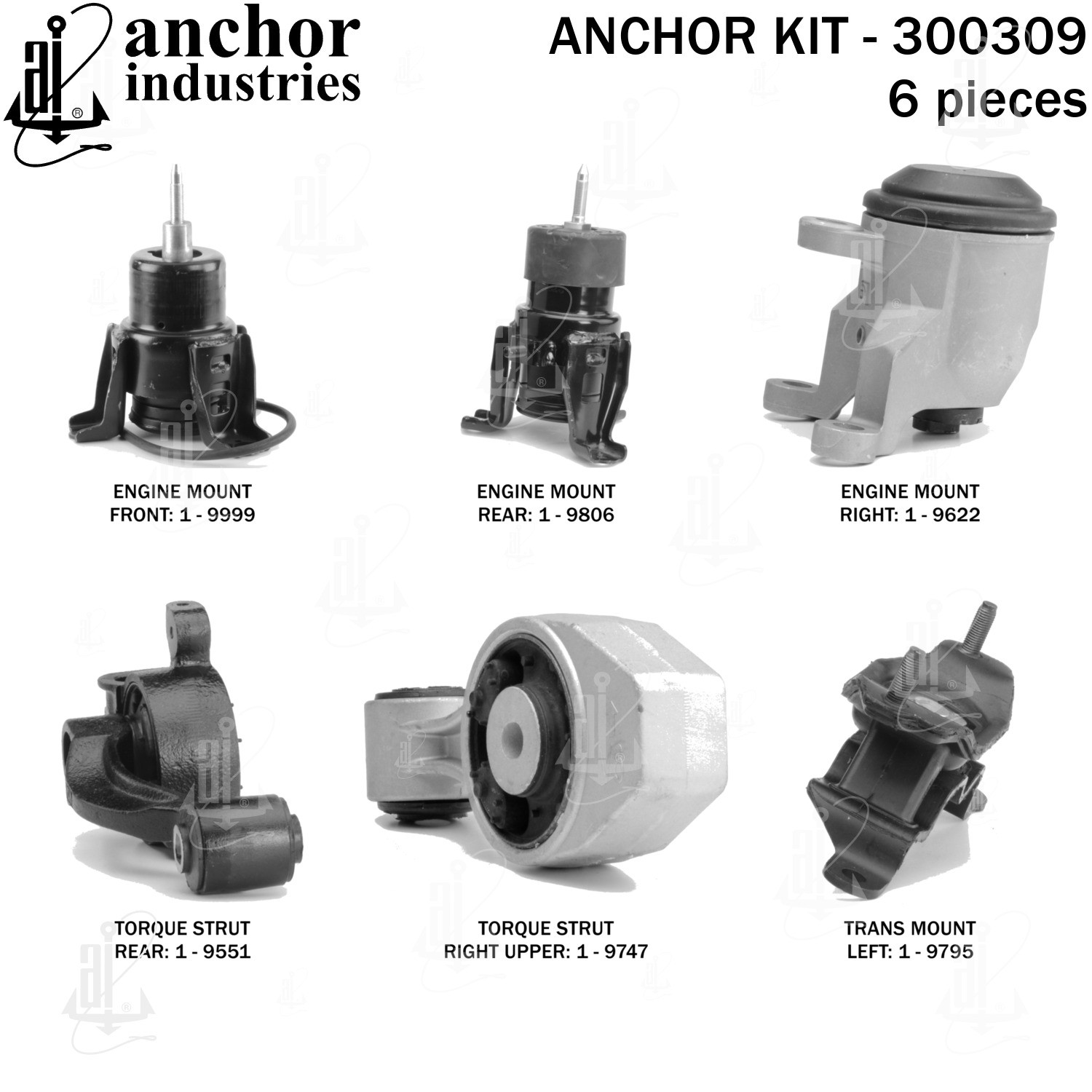 - Anchor 300309; ENGINE MNT KIT ; Each part of this kit is specifically engineered and manufactured to meet or exceed OE standards to ensure perfect fit and function. Natural and SBR rubber provide maximum life and performance. Steel fasteners are heat treated grade 5 bolts. A special bonding agent is used to ensure a rubber to metal bond. Rubber material is mixed to specific Durometer, hardness. 12 Month Warranty.