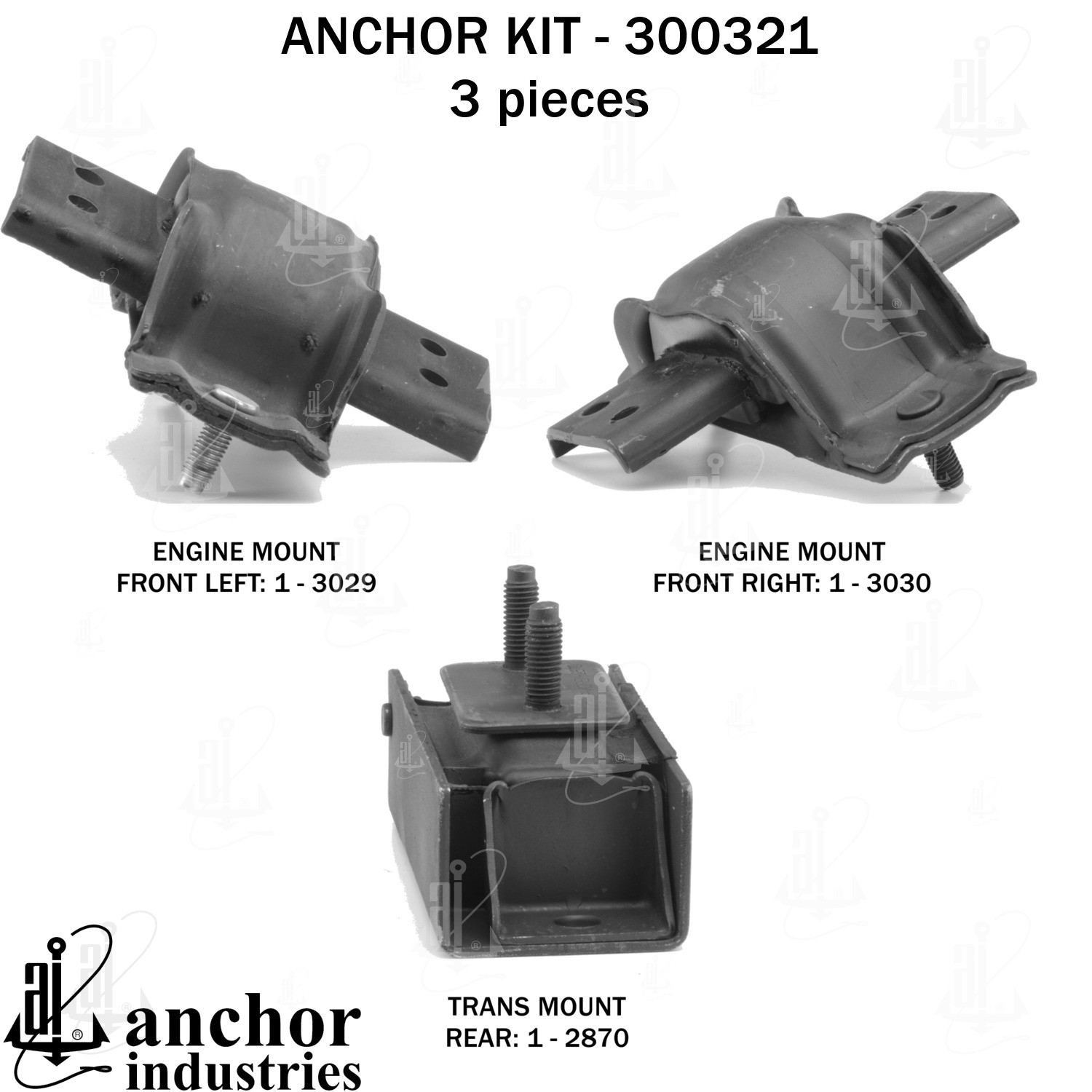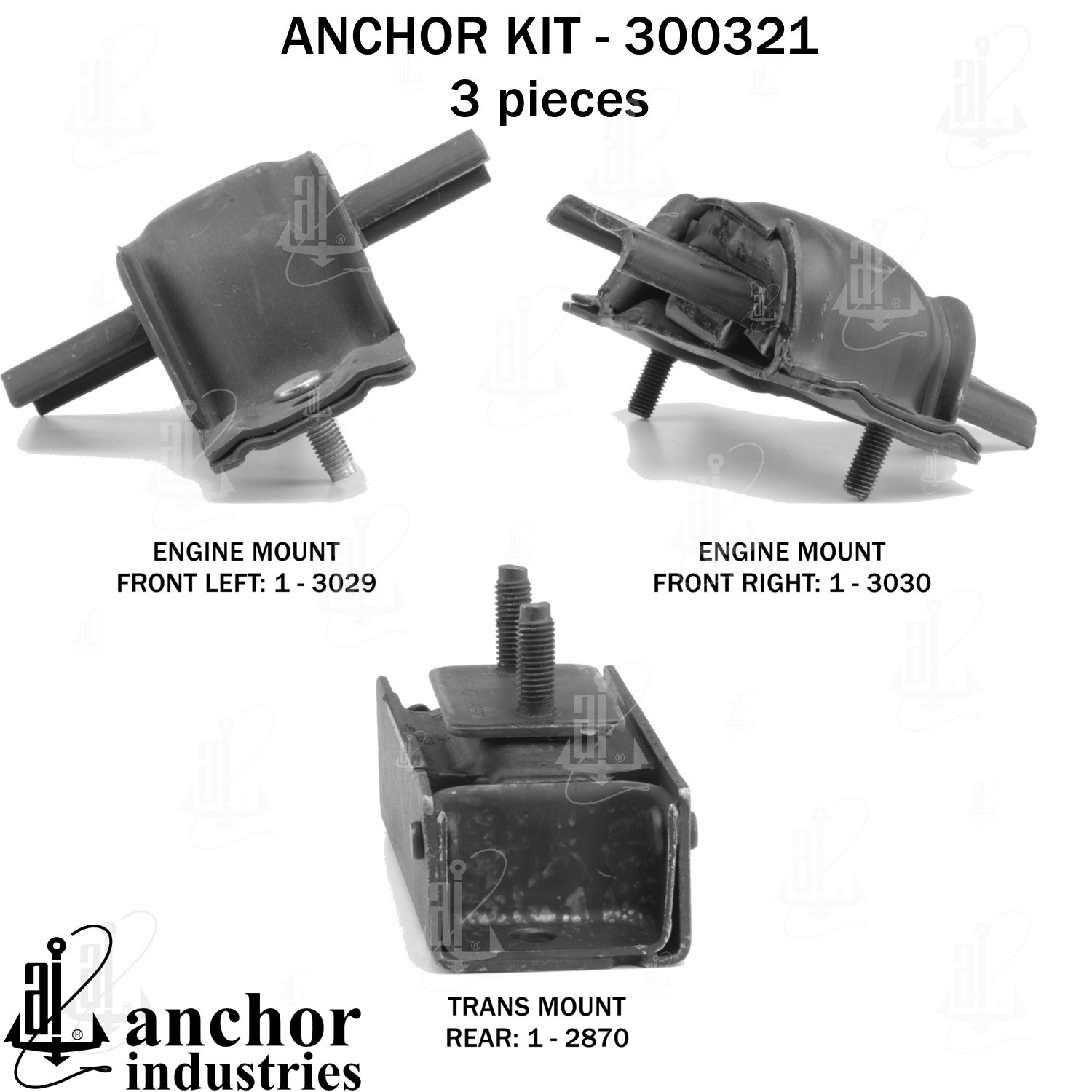 - Anchor 300321; ENGINE MNT KIT ; Each part of this kit is specifically engineered and manufactured to meet or exceed OE standards to ensure perfect fit and function. Natural and SBR rubber provide maximum life and performance. Steel fasteners are heat treated grade 5 bolts. A special bonding agent is used to ensure a rubber to metal bond. Rubber material is mixed to specific Durometer, hardness. 12 Month Warranty.