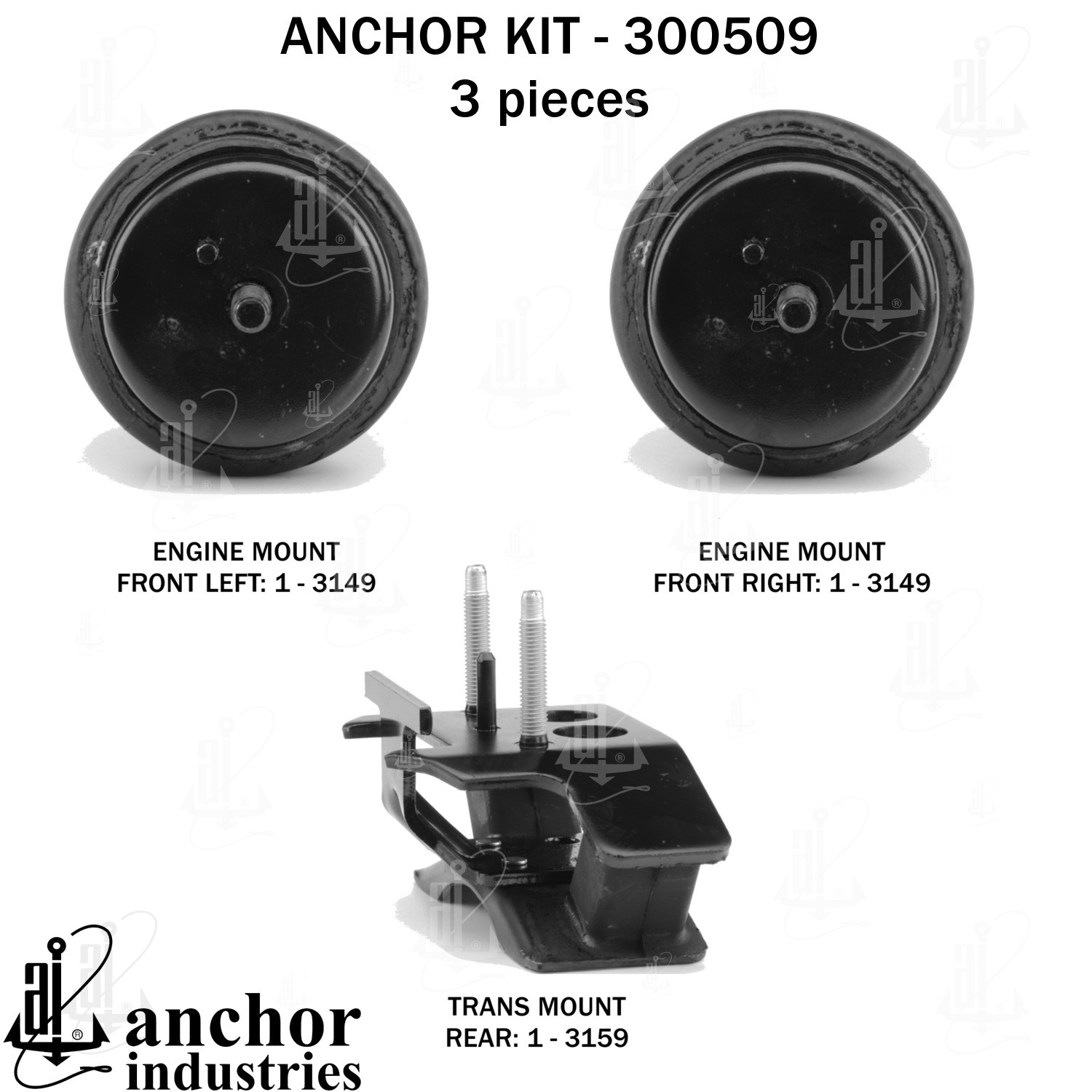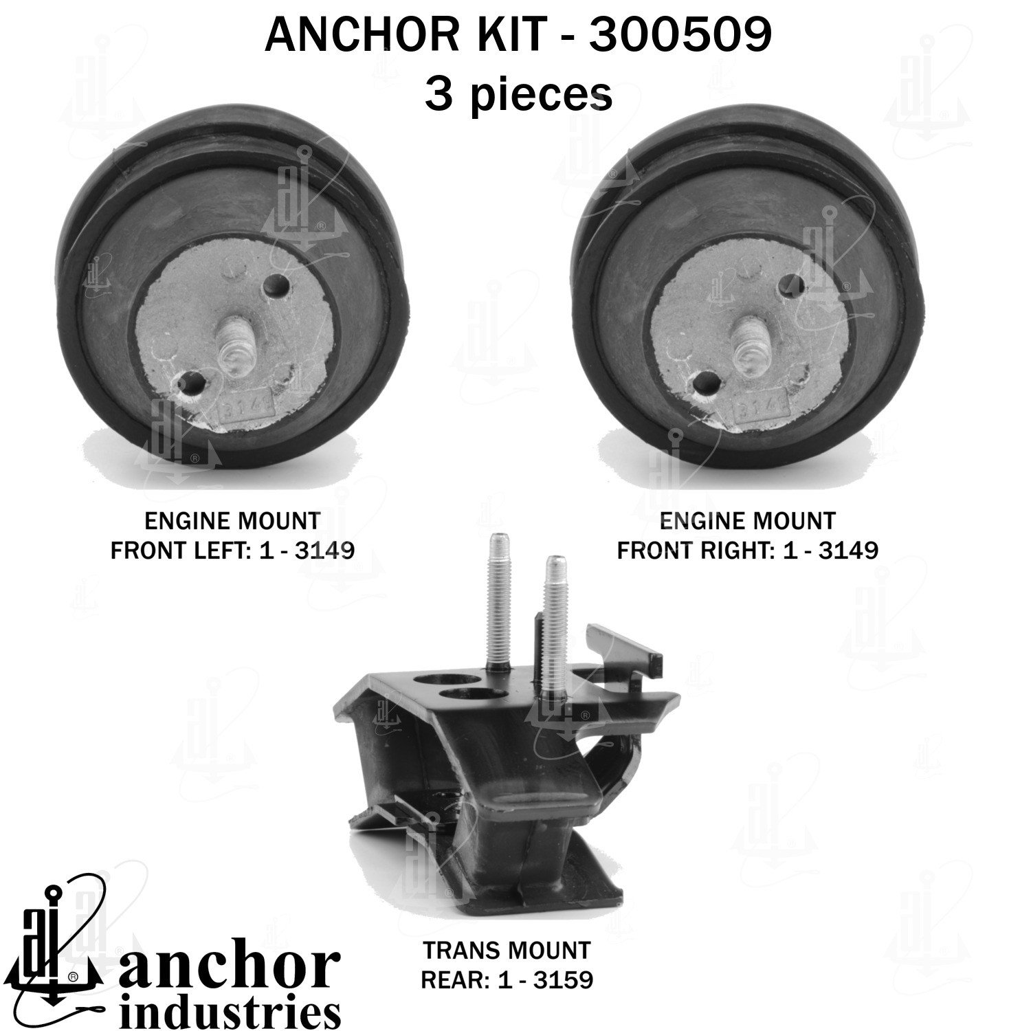 - Anchor 300509; ENGINE MNT KIT ; Each part of this kit is specifically engineered and manufactured to meet or exceed OE standards to ensure perfect fit and function. Natural and SBR rubber provide maximum life and performance. Steel fasteners are heat treated grade 5 bolts. A special bonding agent is used to ensure a rubber to metal bond. Rubber material is mixed to specific Durometer, hardness. 12 Month Warranty.