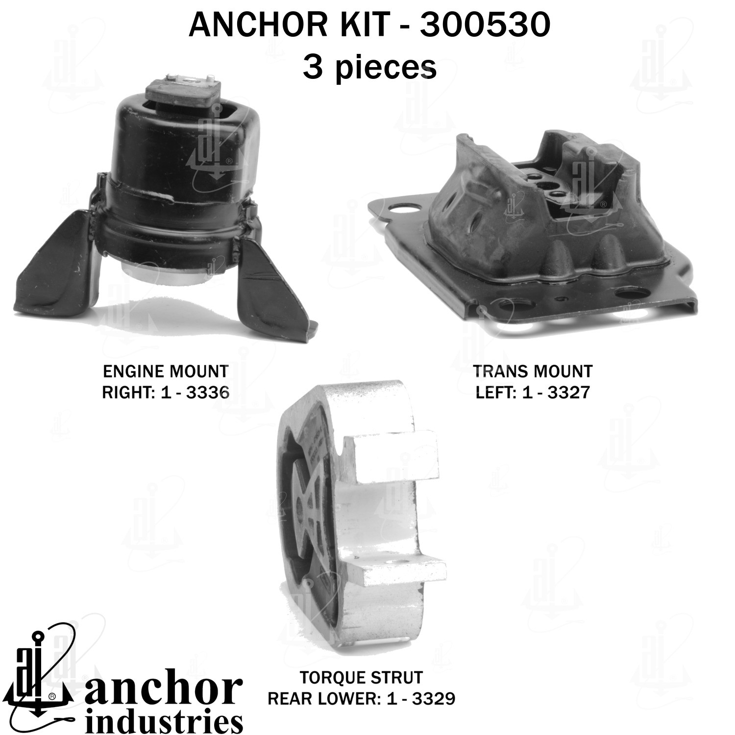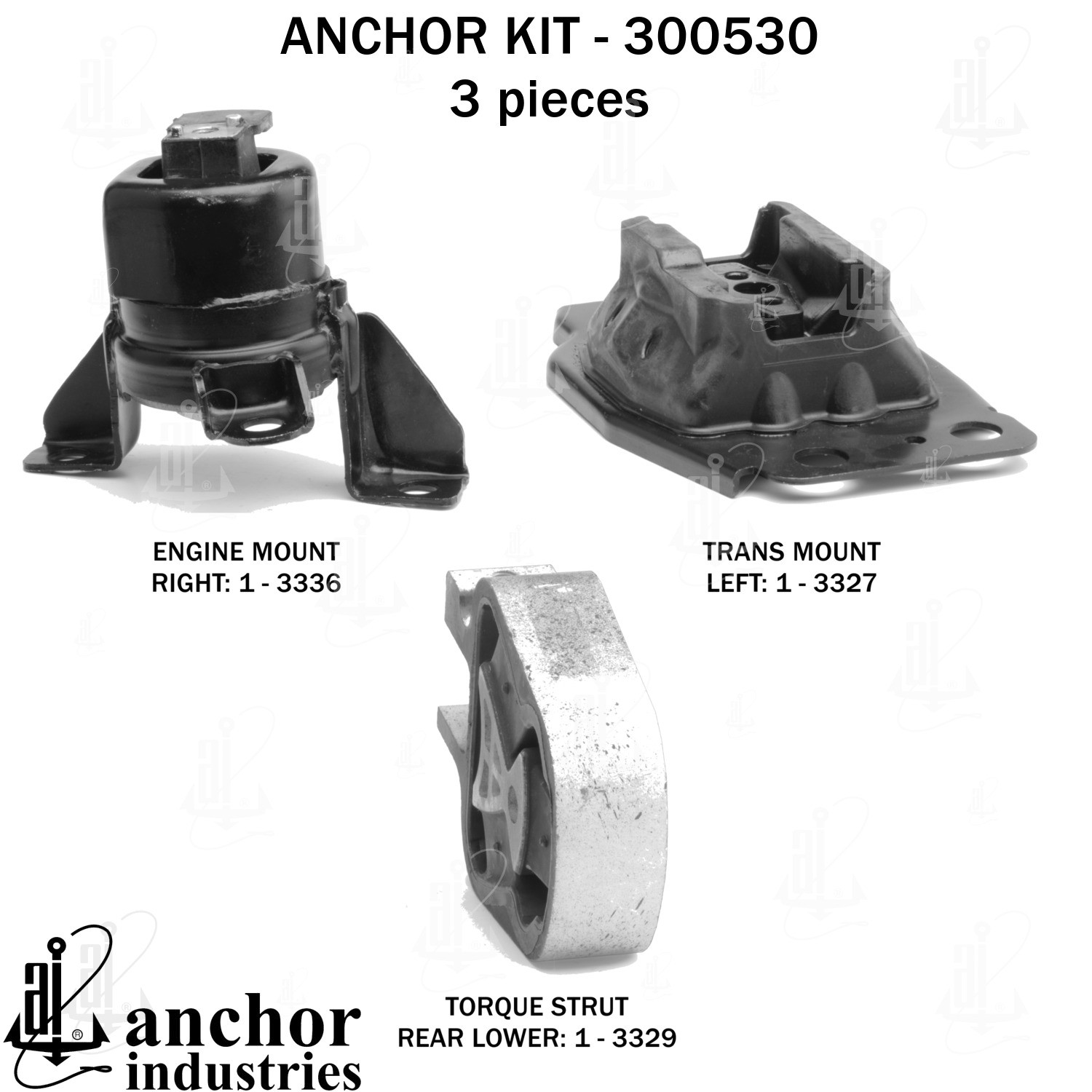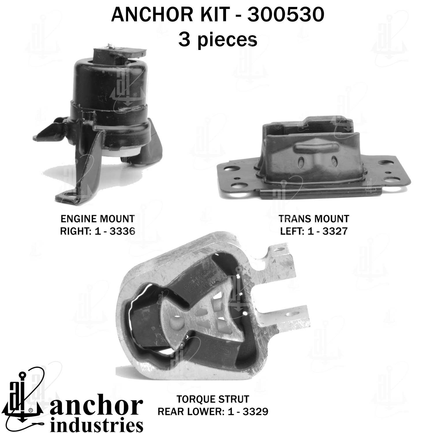 - Anchor 300530; ENGINE MNT KIT ; Each part of this kit is specifically engineered and manufactured to meet or exceed OE standards to ensure perfect fit and function. Natural and SBR rubber provide maximum life and performance. Steel fasteners are heat treated grade 5 bolts. A special bonding agent is used to ensure a rubber to metal bond. Rubber material is mixed to specific Durometer, hardness. 12 Month Warranty.