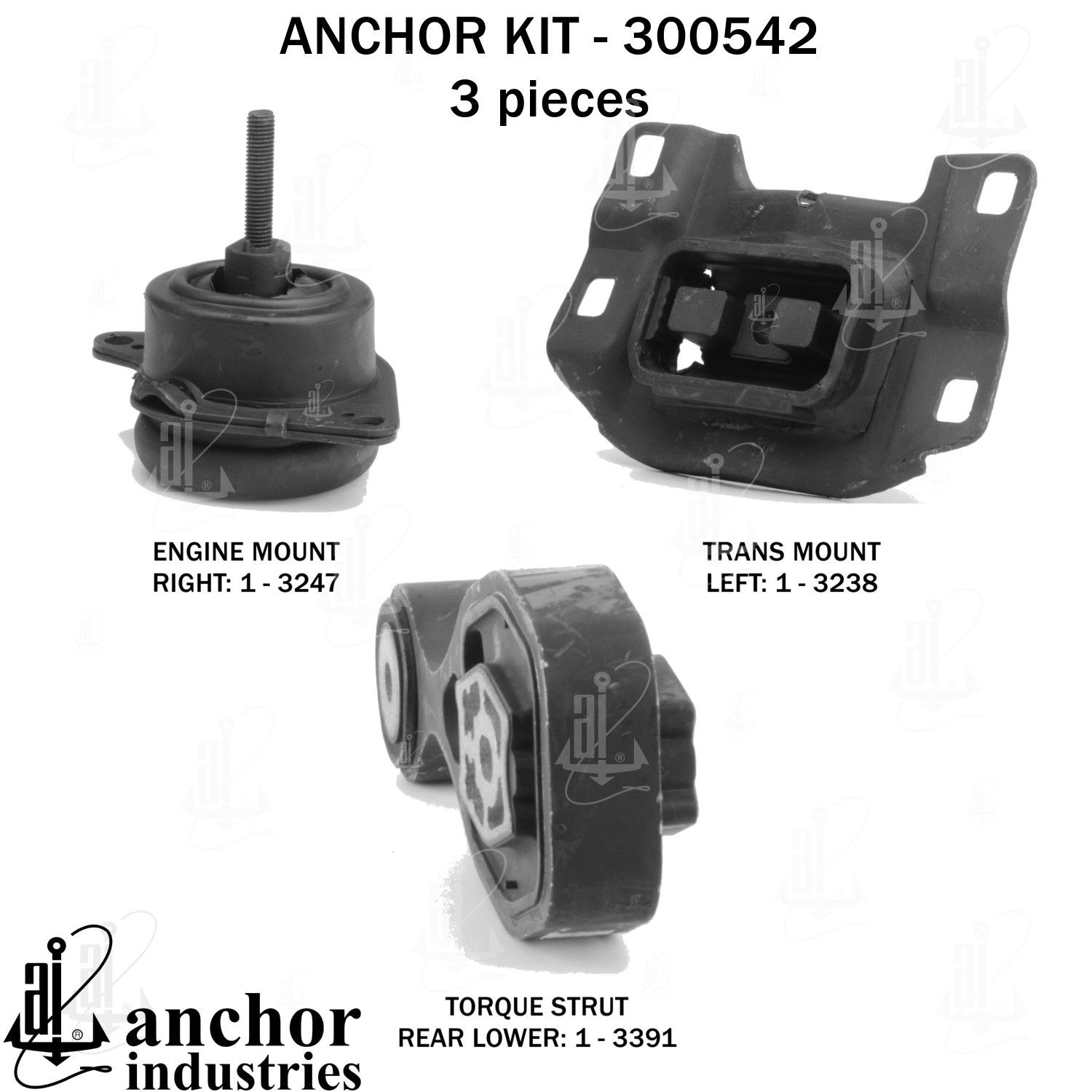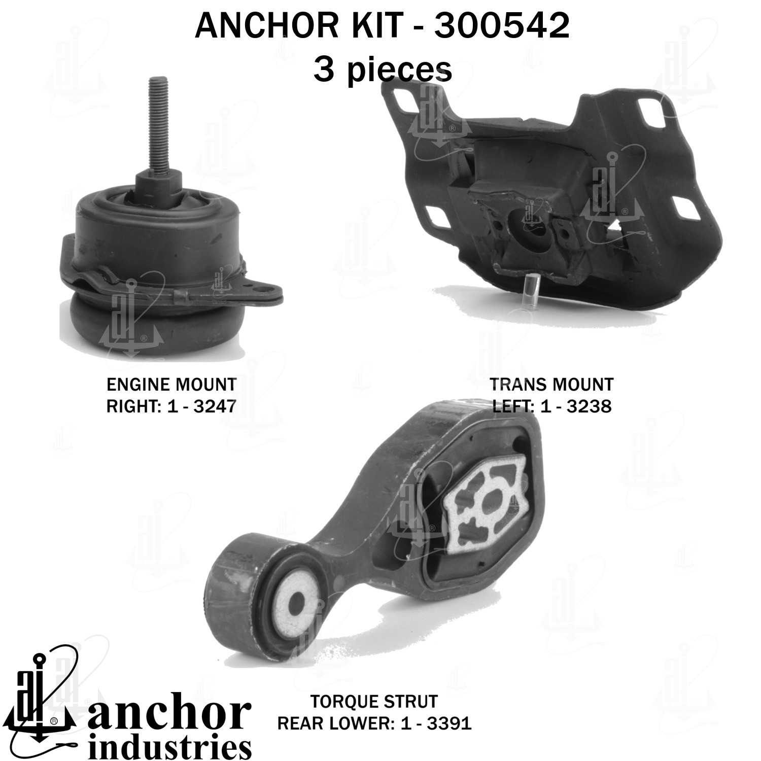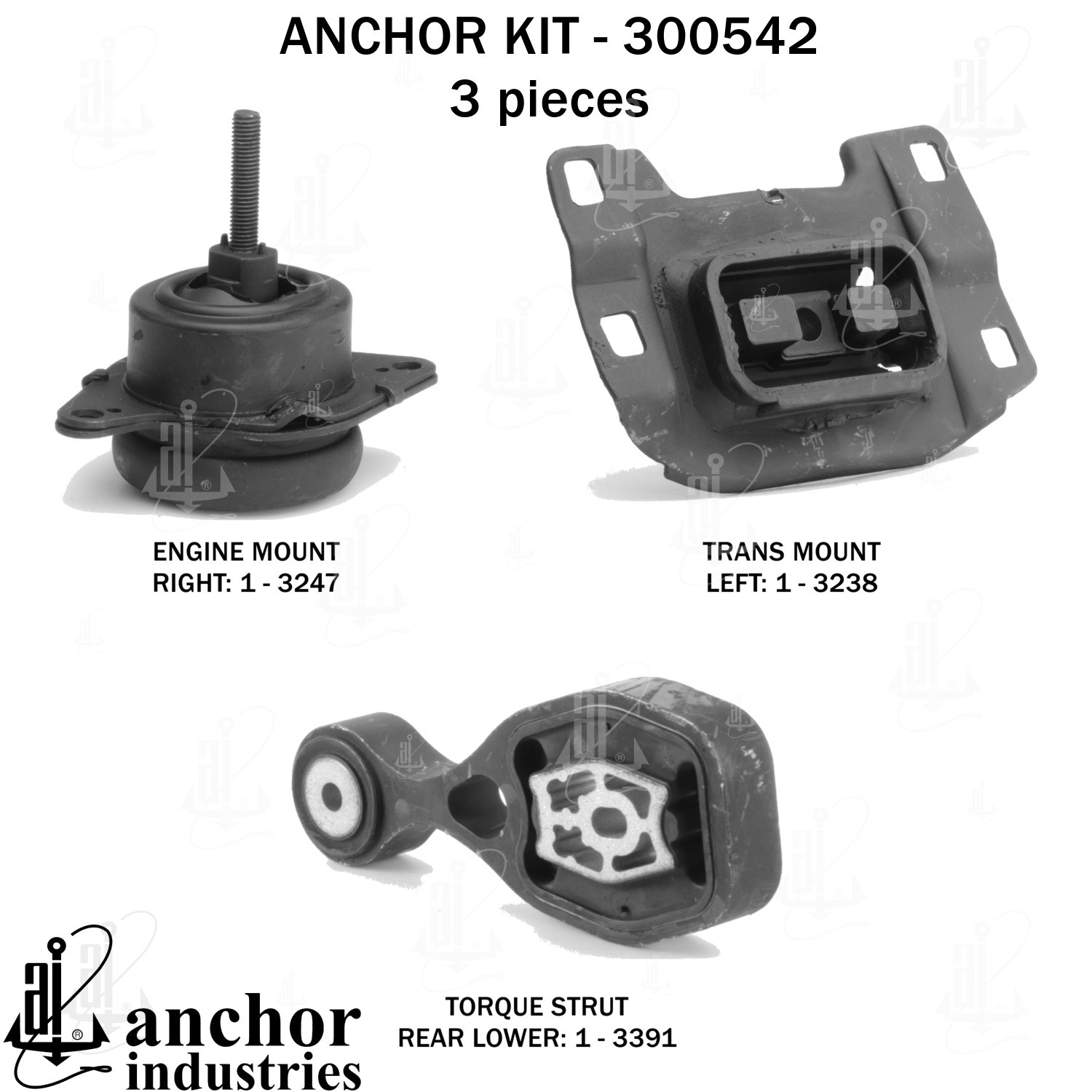 - Anchor 300542; ENGINE MNT KIT ; Each part of this kit is specifically engineered and manufactured to meet or exceed OE standards to ensure perfect fit and function. Natural and SBR rubber provide maximum life and performance. Steel fasteners are heat treated grade 5 bolts. A special bonding agent is used to ensure a rubber to metal bond. Rubber material is mixed to specific Durometer, hardness. 12 Month Warranty.