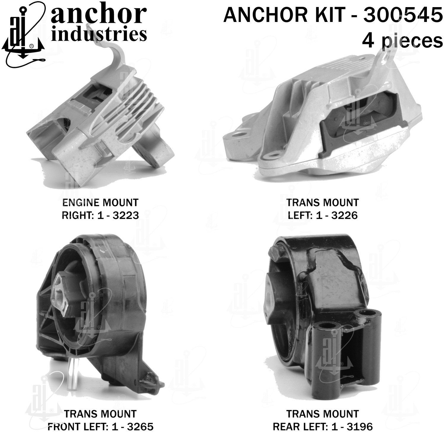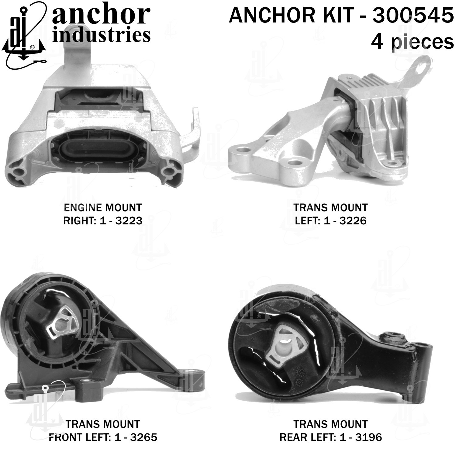 - Anchor 300545; ENGINE MNT KIT ; Each part of this kit is specifically engineered and manufactured to meet or exceed OE standards to ensure perfect fit and function. Natural and SBR rubber provide maximum life and performance. Steel fasteners are heat treated grade 5 bolts. A special bonding agent is used to ensure a rubber to metal bond. Rubber material is mixed to specific Durometer, hardness. 12 Month Warranty.