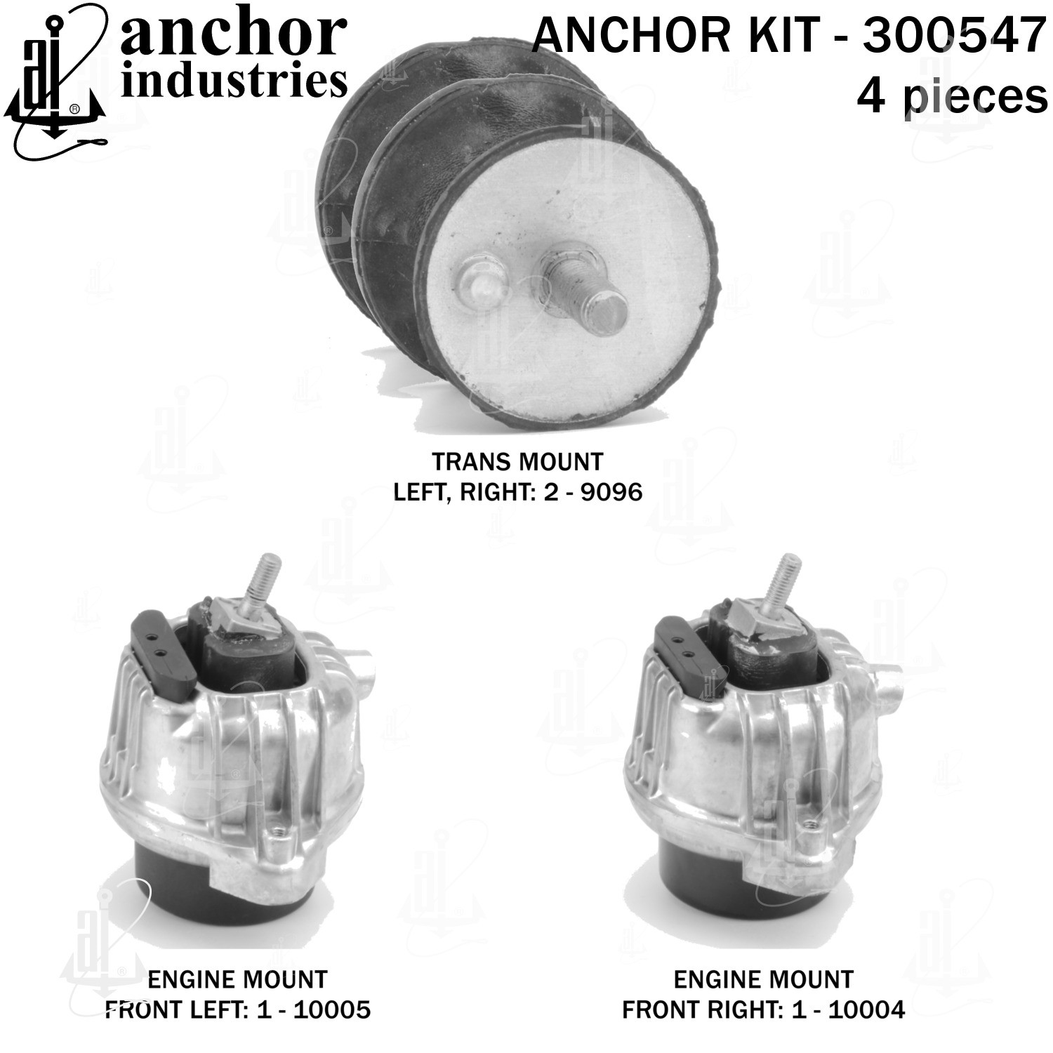 - Anchor 300547; ENGINE MNT KIT ; Each part of this kit is specifically engineered and manufactured to meet or exceed OE standards to ensure perfect fit and function. Natural and SBR rubber provide maximum life and performance. Steel fasteners are heat treated grade 5 bolts. A special bonding agent is used to ensure a rubber to metal bond. Rubber material is mixed to specific Durometer, hardness. 12 Month Warranty.