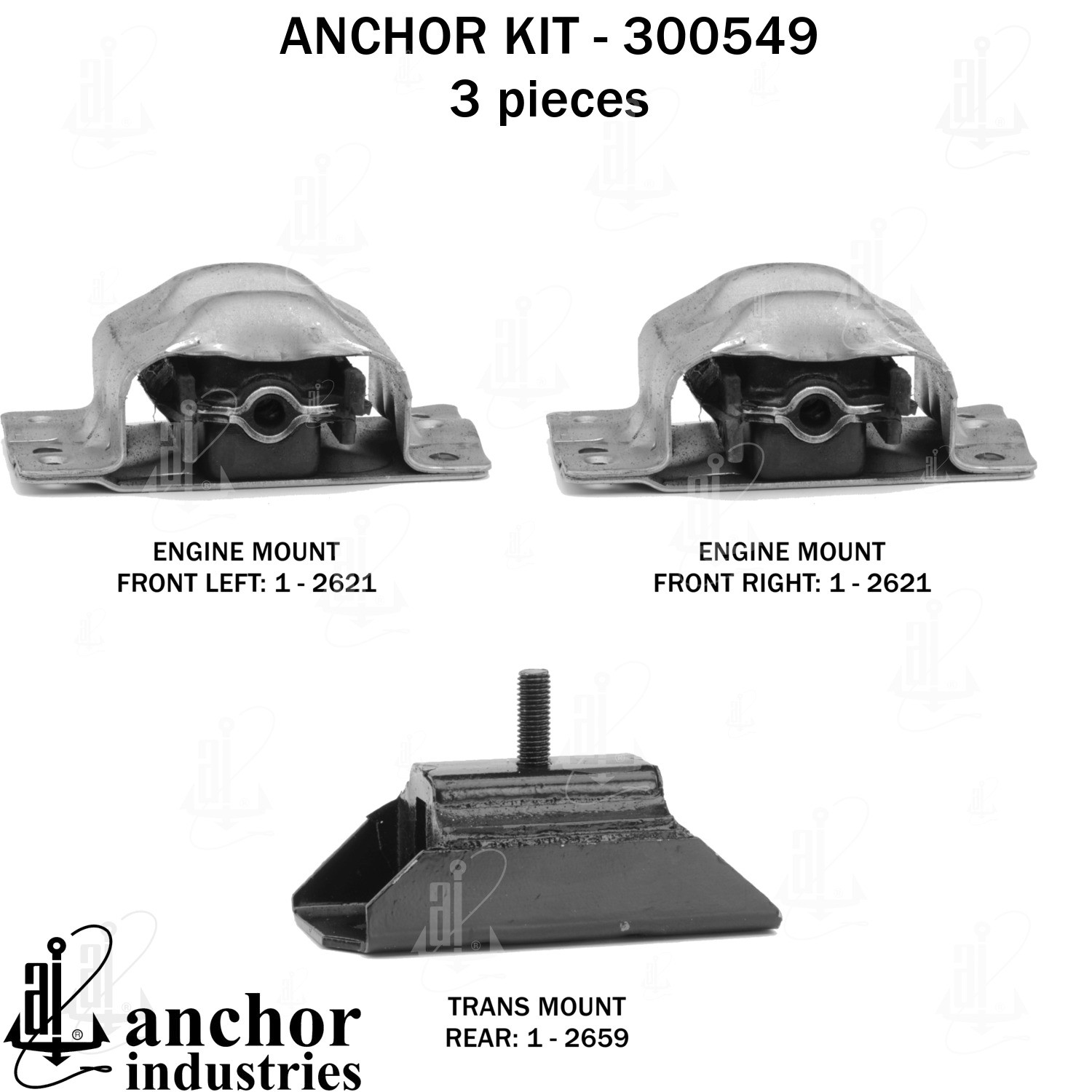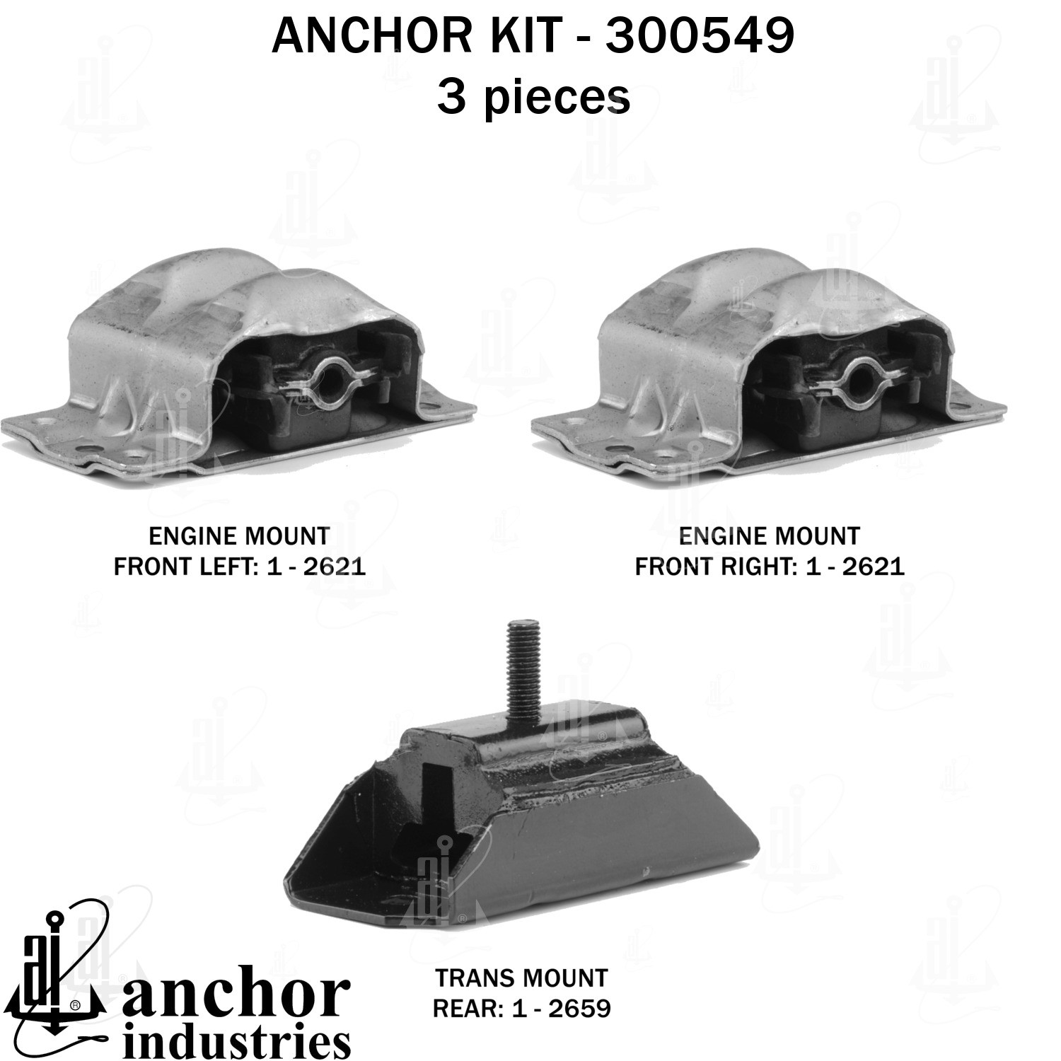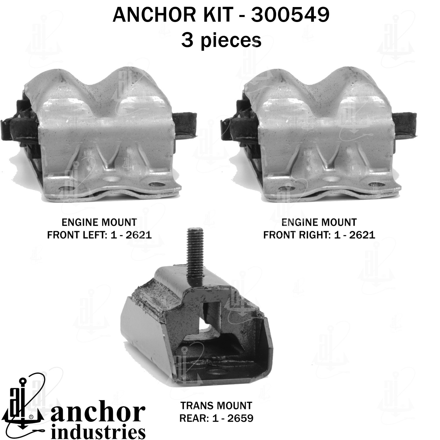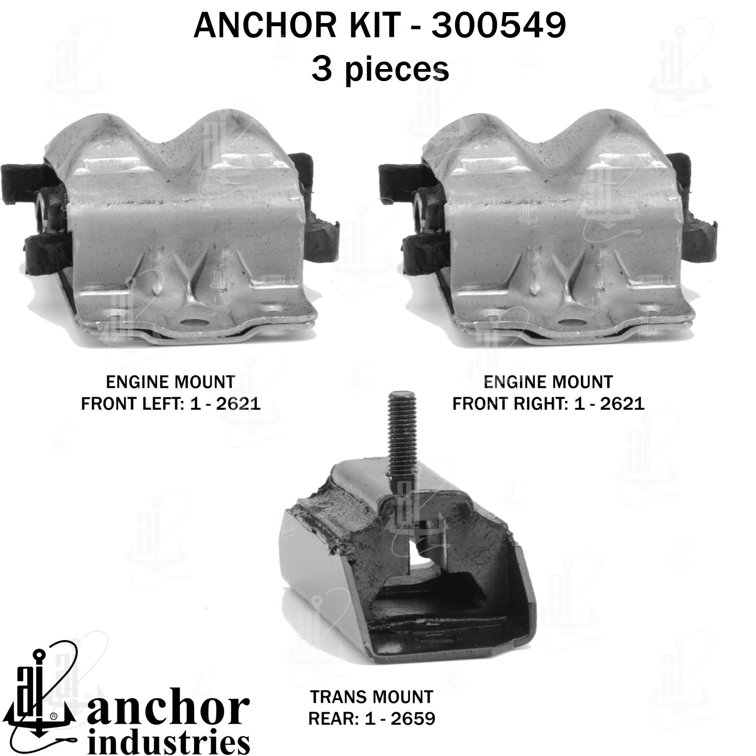- Anchor 300549; ENGINE MNT KIT ; Each part of this kit is specifically engineered and manufactured to meet or exceed OE standards to ensure perfect fit and function. Natural and SBR rubber provide maximum life and performance. Steel fasteners are heat treated grade 5 bolts. A special bonding agent is used to ensure a rubber to metal bond. Rubber material is mixed to specific Durometer, hardness. 12 Month Warranty.