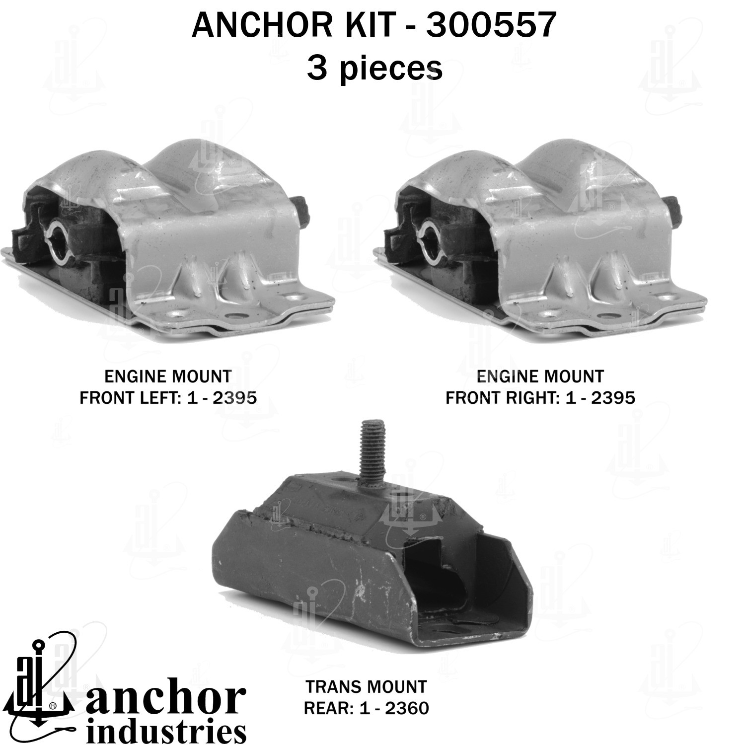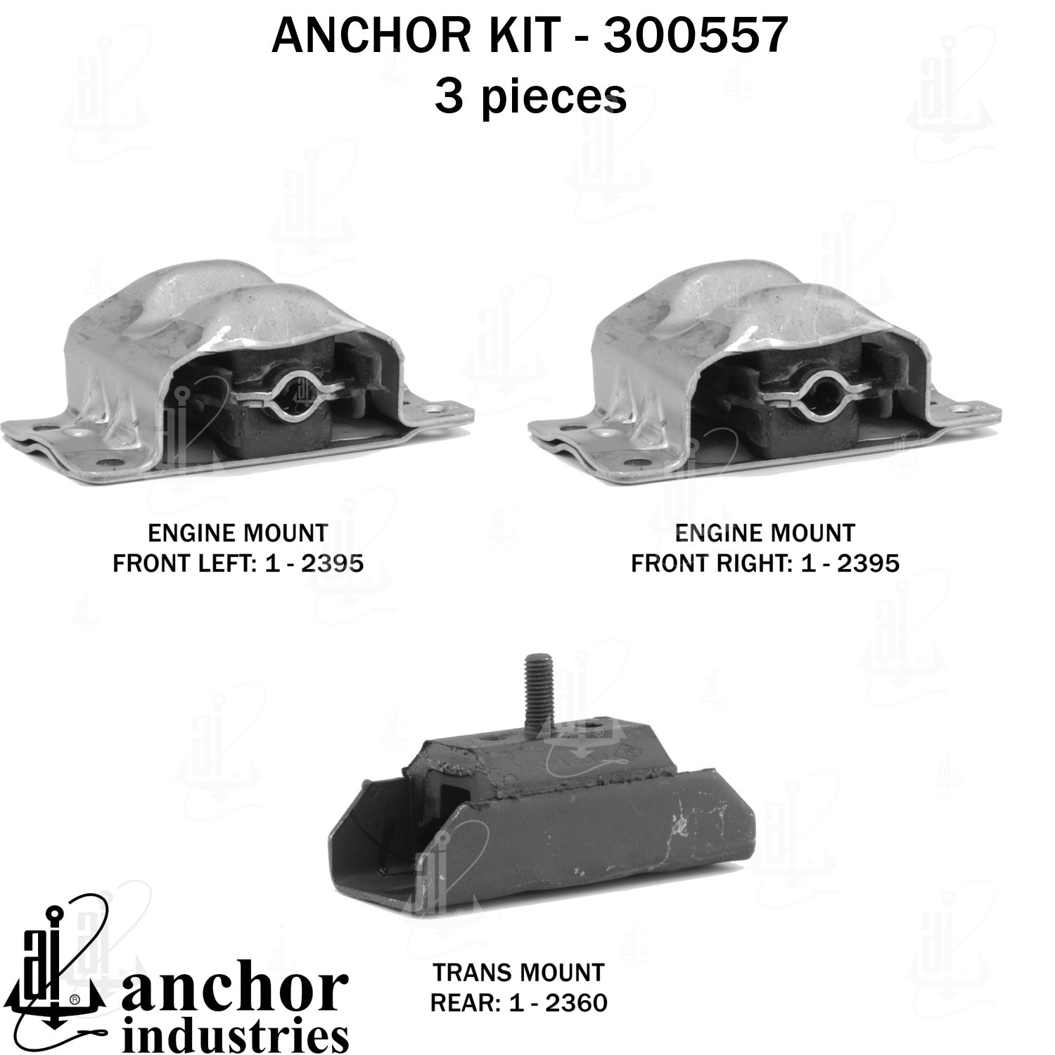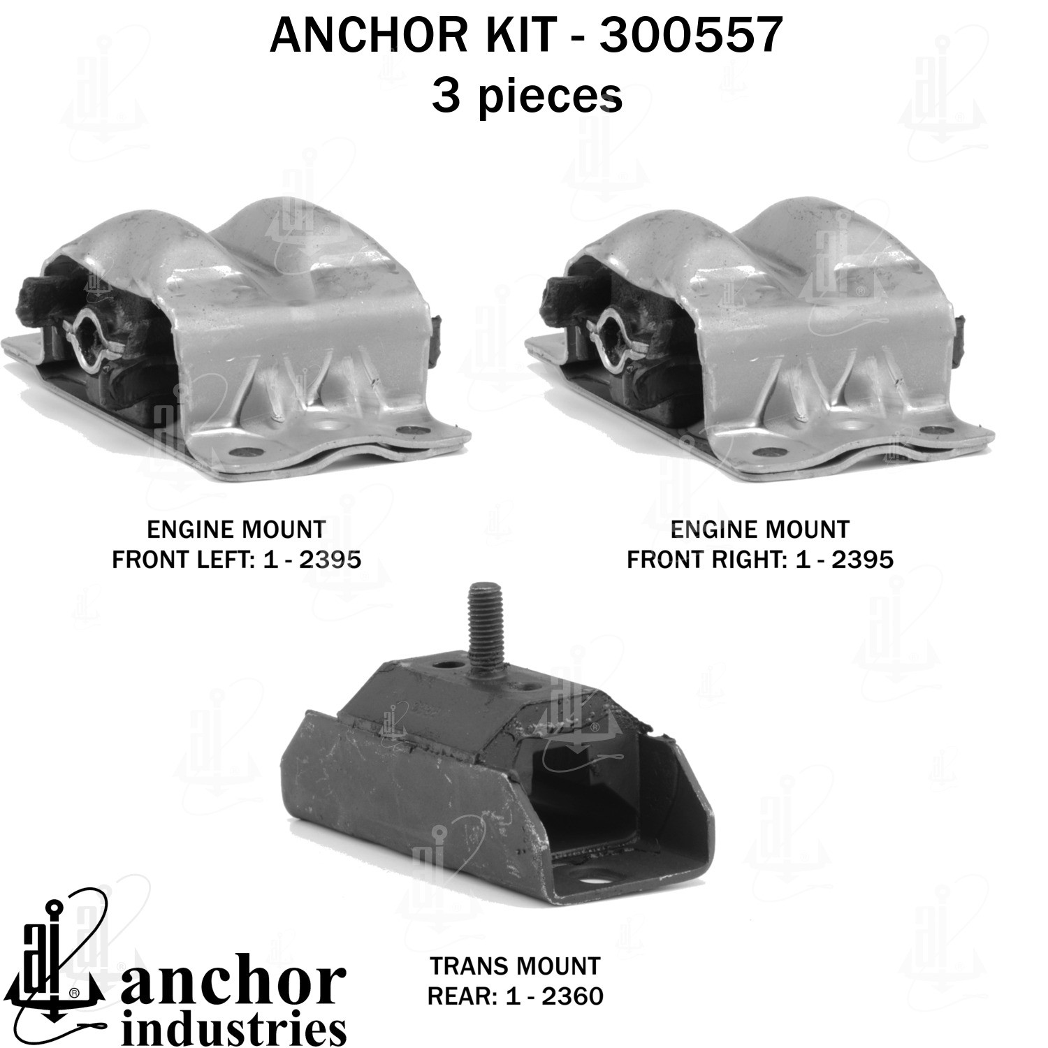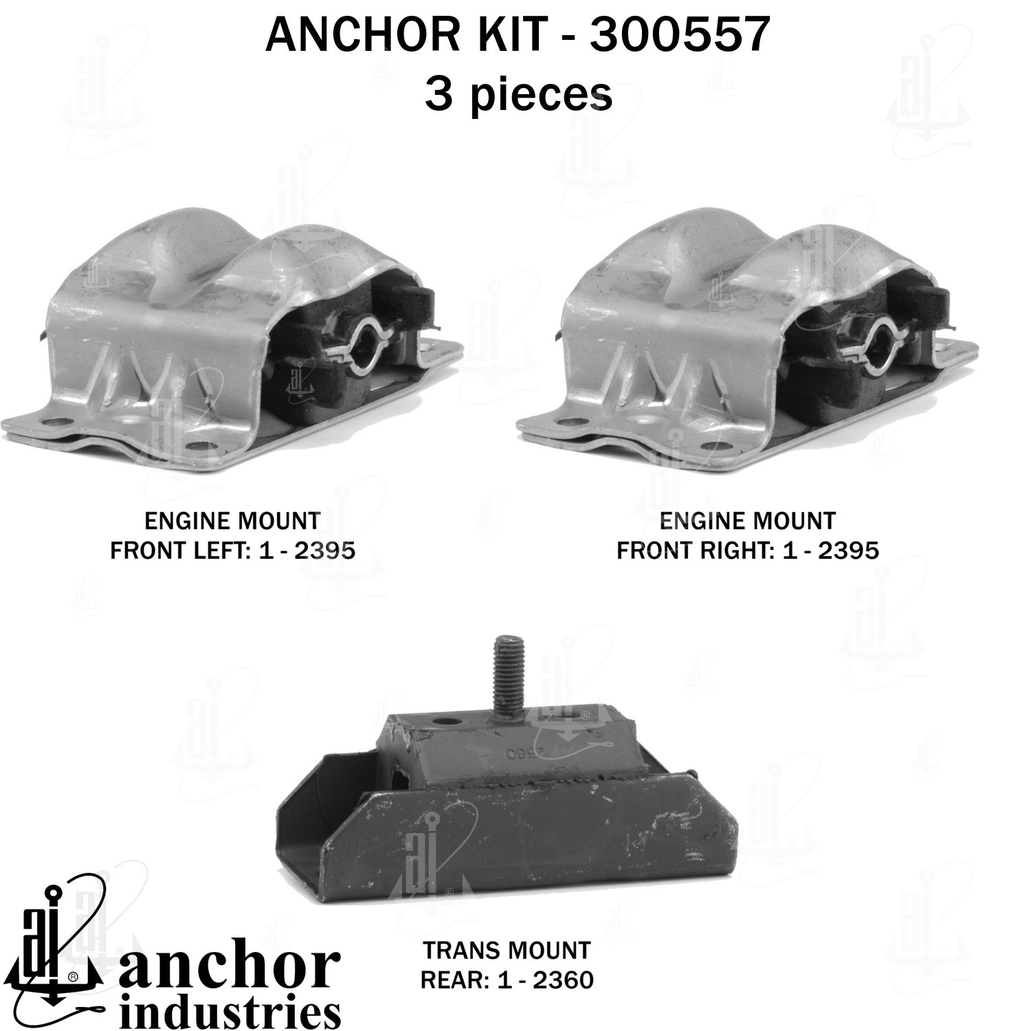 - Anchor 300557; ENGINE MNT KIT ; Each part of this kit is specifically engineered and manufactured to meet or exceed OE standards to ensure perfect fit and function. Natural and SBR rubber provide maximum life and performance. Steel fasteners are heat treated grade 5 bolts. A special bonding agent is used to ensure a rubber to metal bond. Rubber material is mixed to specific Durometer, hardness. 12 Month Warranty.