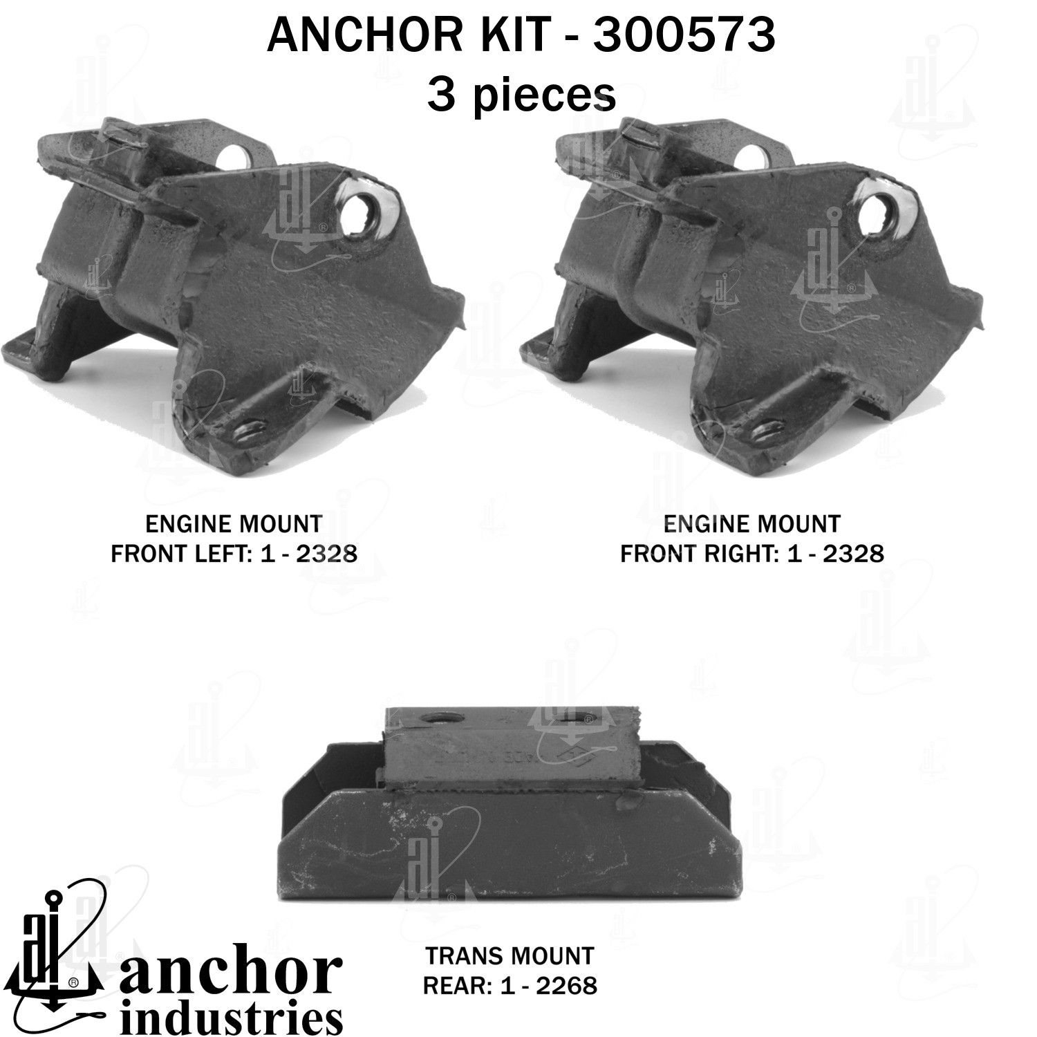 - Anchor 300573; ENGINE MNT KIT ; Each part of this kit is specifically engineered and manufactured to meet or exceed OE standards to ensure perfect fit and function. Natural and SBR rubber provide maximum life and performance. Steel fasteners are heat treated grade 5 bolts. A special bonding agent is used to ensure a rubber to metal bond. Rubber material is mixed to specific Durometer, hardness. 12 Month Warranty.