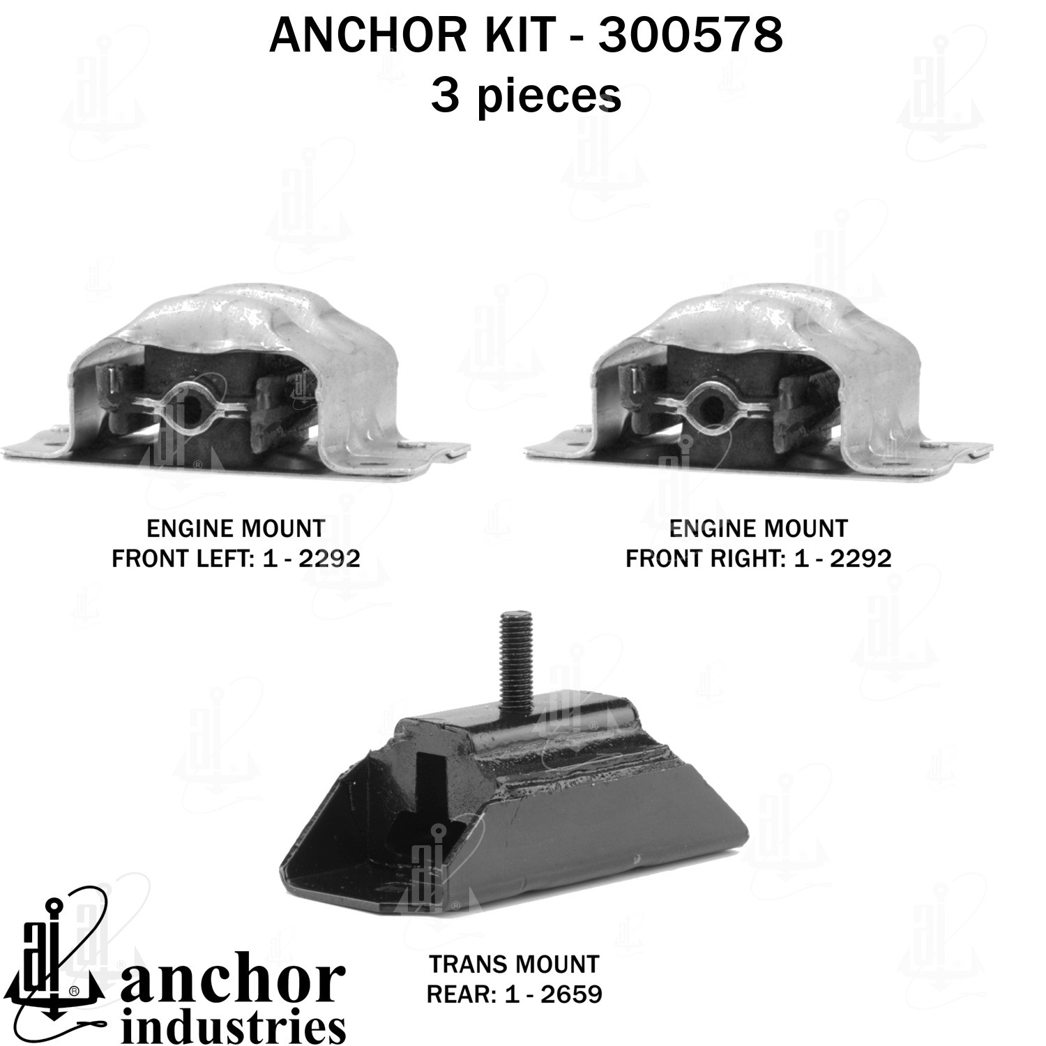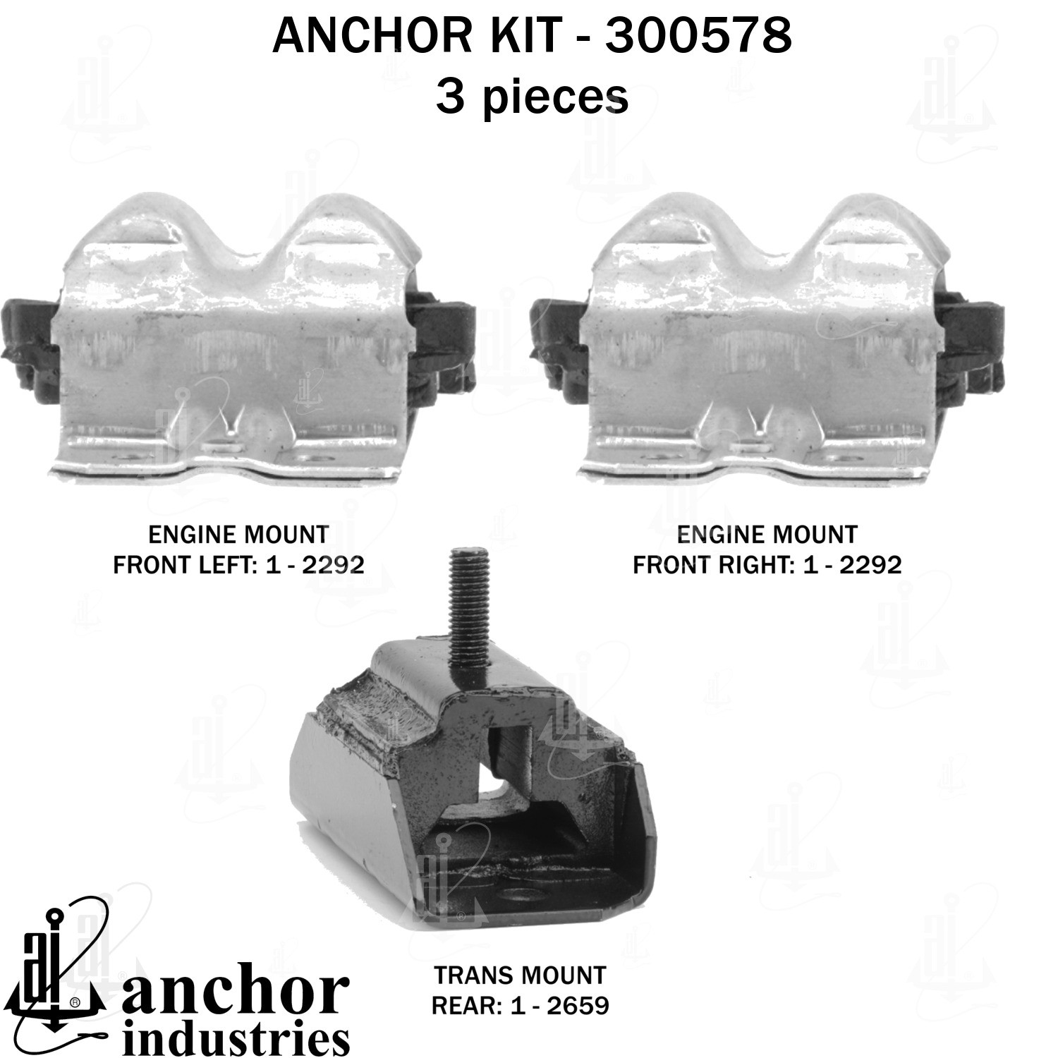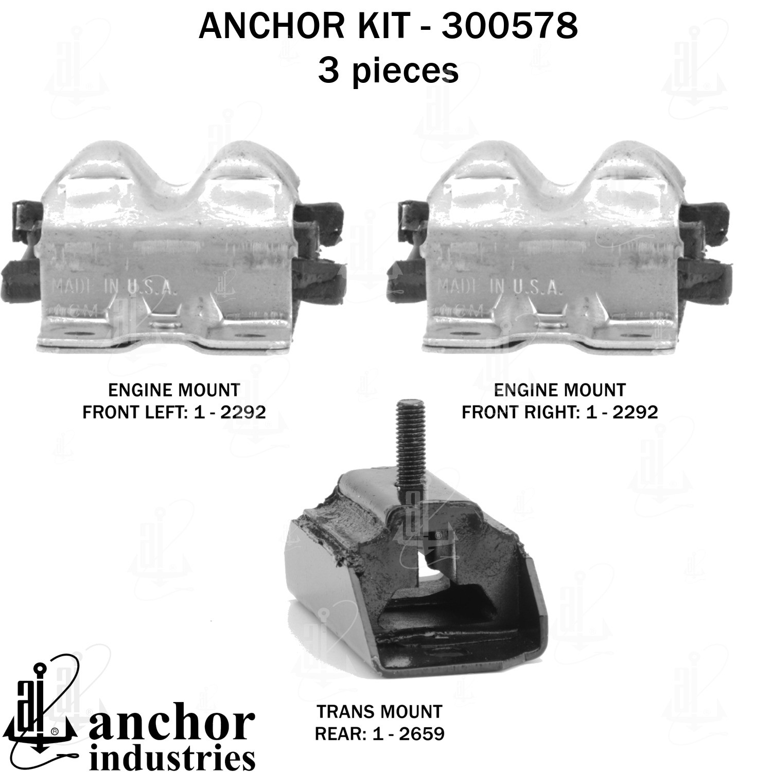 - Anchor 300578; ENGINE MNT KIT ; Each part of this kit is specifically engineered and manufactured to meet or exceed OE standards to ensure perfect fit and function. Natural and SBR rubber provide maximum life and performance. Steel fasteners are heat treated grade 5 bolts. A special bonding agent is used to ensure a rubber to metal bond. Rubber material is mixed to specific Durometer, hardness. 12 Month Warranty.