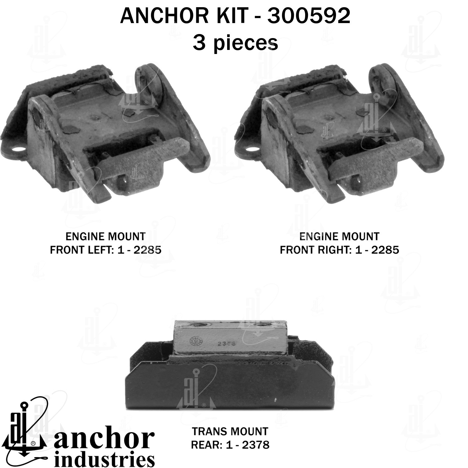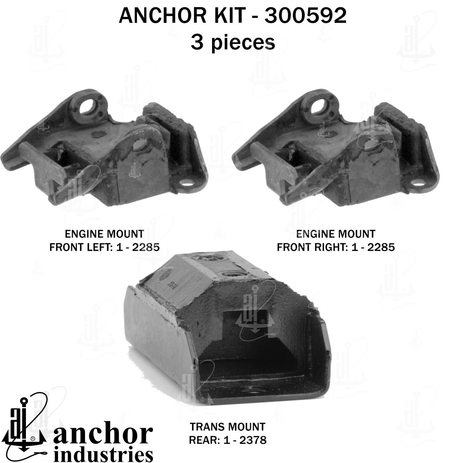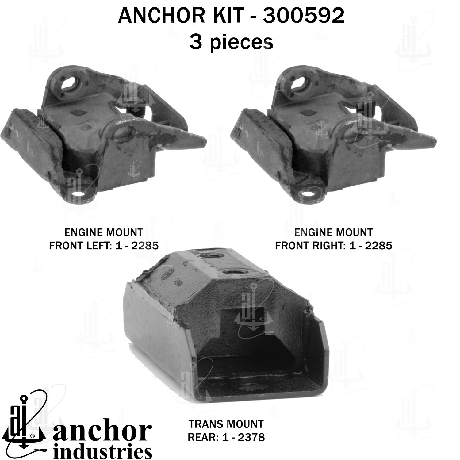 - Anchor 300592; ENGINE MNT KIT ; Each part of this kit is specifically engineered and manufactured to meet or exceed OE standards to ensure perfect fit and function. Natural and SBR rubber provide maximum life and performance. Steel fasteners are heat treated grade 5 bolts. A special bonding agent is used to ensure a rubber to metal bond. Rubber material is mixed to specific Durometer, hardness. 12 Month Warranty.