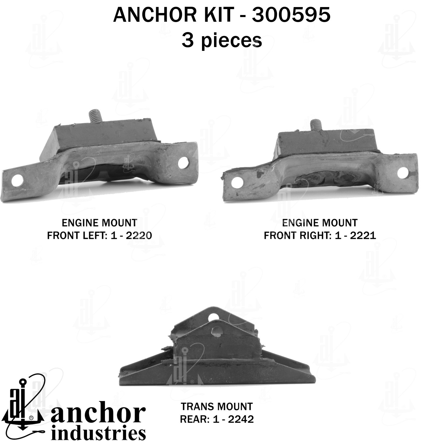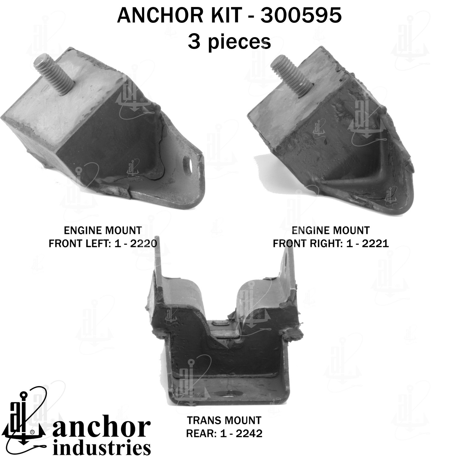 - Anchor 300595; ENGINE MNT KIT ; Each part of this kit is specifically engineered and manufactured to meet or exceed OE standards to ensure perfect fit and function. Natural and SBR rubber provide maximum life and performance. Steel fasteners are heat treated grade 5 bolts. A special bonding agent is used to ensure a rubber to metal bond. Rubber material is mixed to specific Durometer, hardness. 12 Month Warranty.