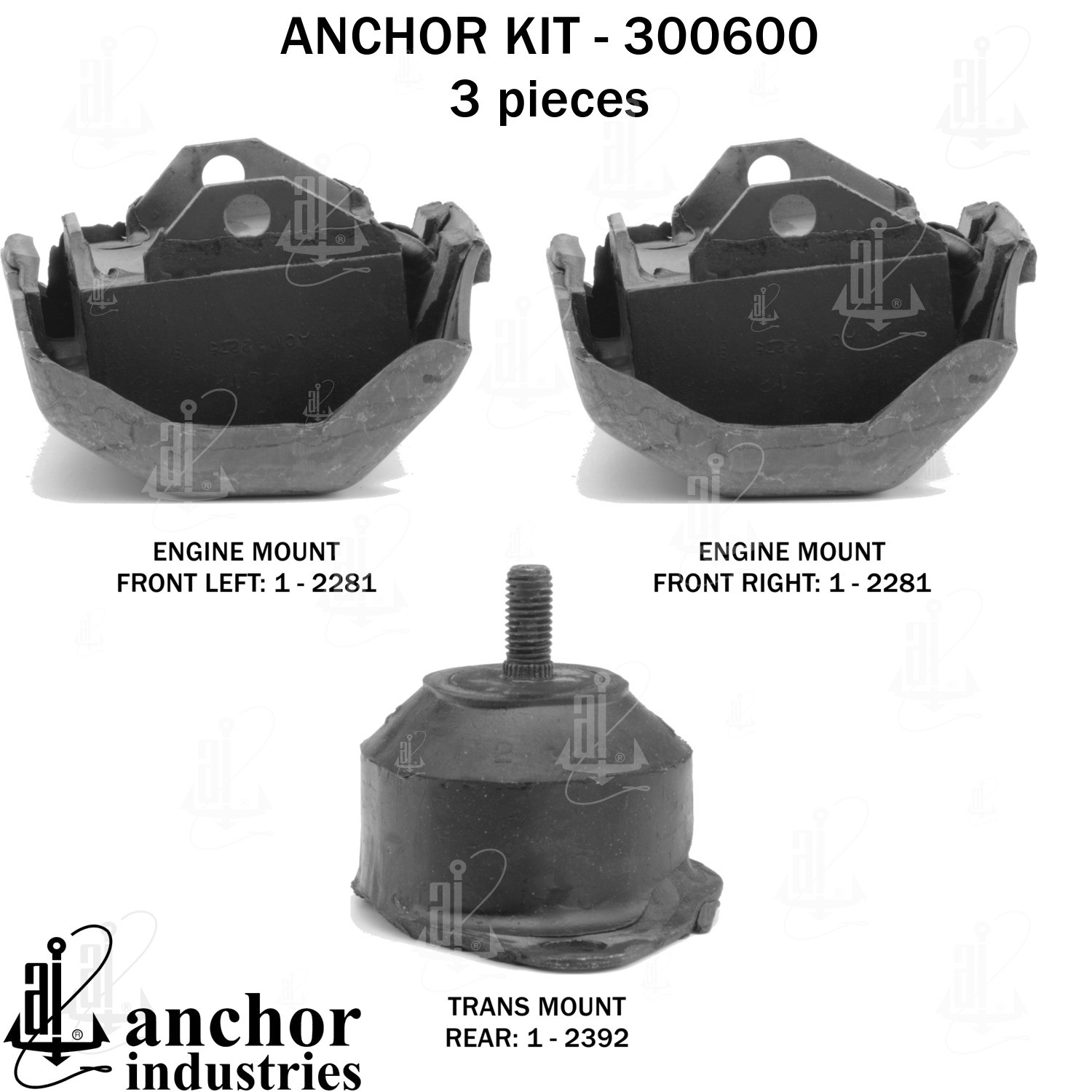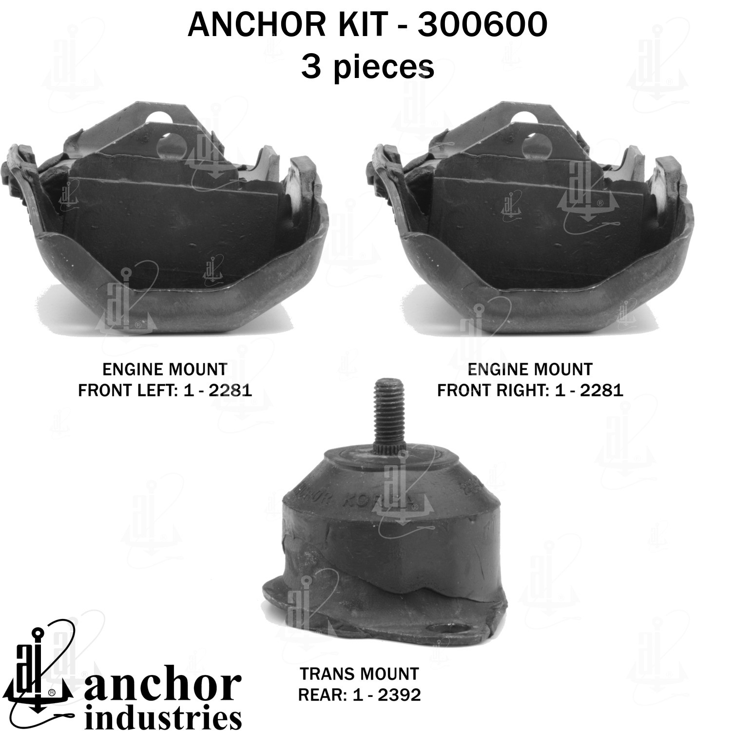 - Anchor 300600; ENGINE MNT KIT ; Each part of this kit is specifically engineered and manufactured to meet or exceed OE standards to ensure perfect fit and function. Natural and SBR rubber provide maximum life and performance. Steel fasteners are heat treated grade 5 bolts. A special bonding agent is used to ensure a rubber to metal bond. Rubber material is mixed to specific Durometer, hardness. 12 Month Warranty.