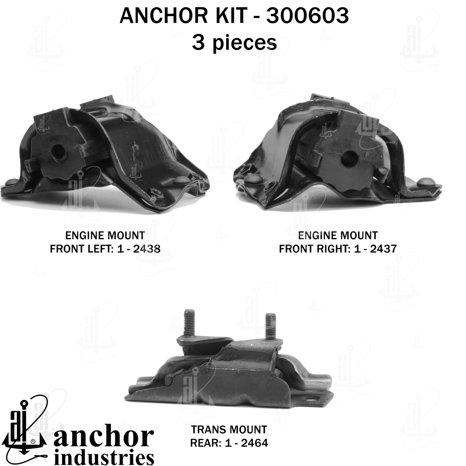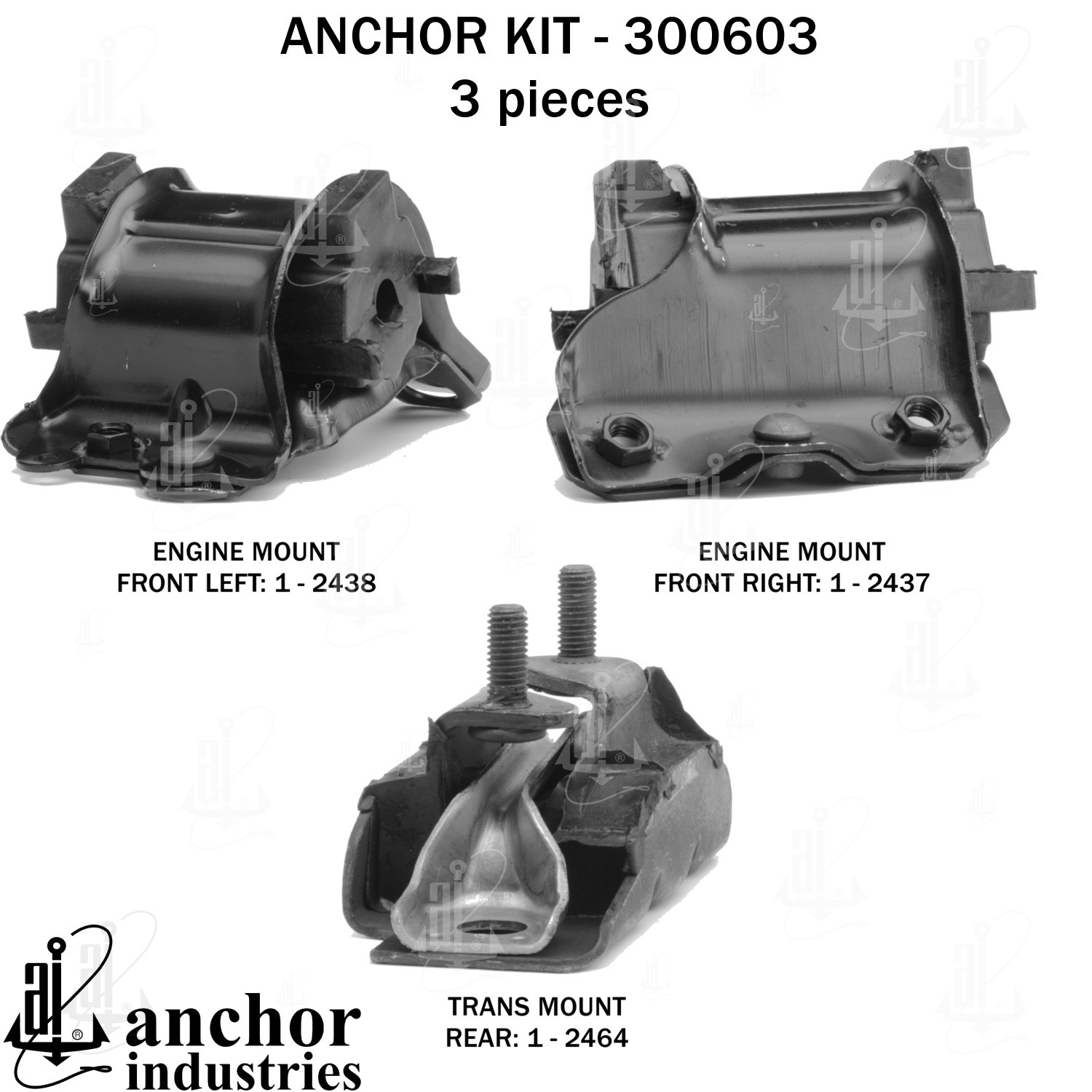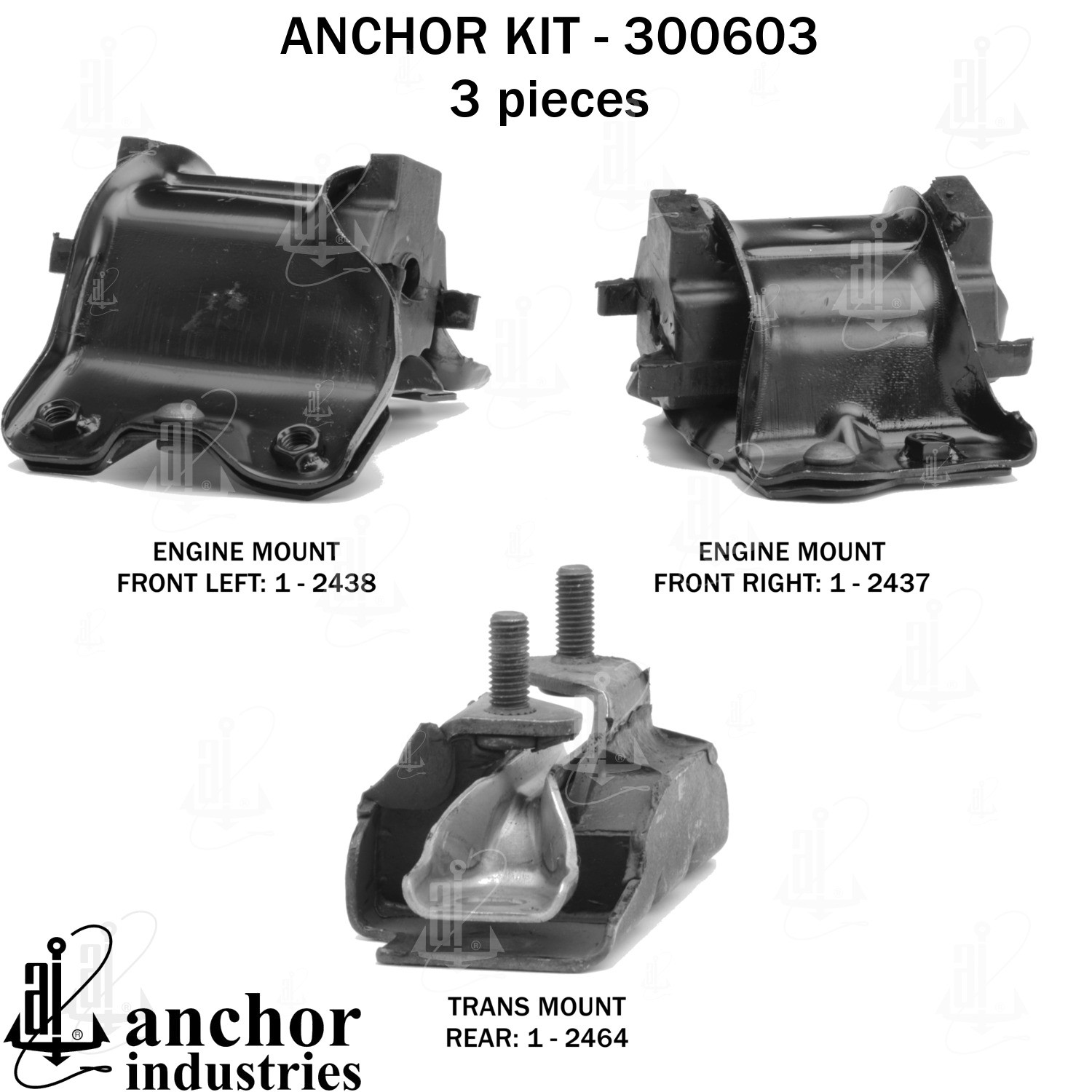 - Anchor 300603; ENGINE MNT KIT ; Each part of this kit is specifically engineered and manufactured to meet or exceed OE standards to ensure perfect fit and function. Natural and SBR rubber provide maximum life and performance. Steel fasteners are heat treated grade 5 bolts. A special bonding agent is used to ensure a rubber to metal bond. Rubber material is mixed to specific Durometer, hardness. 12 Month Warranty.