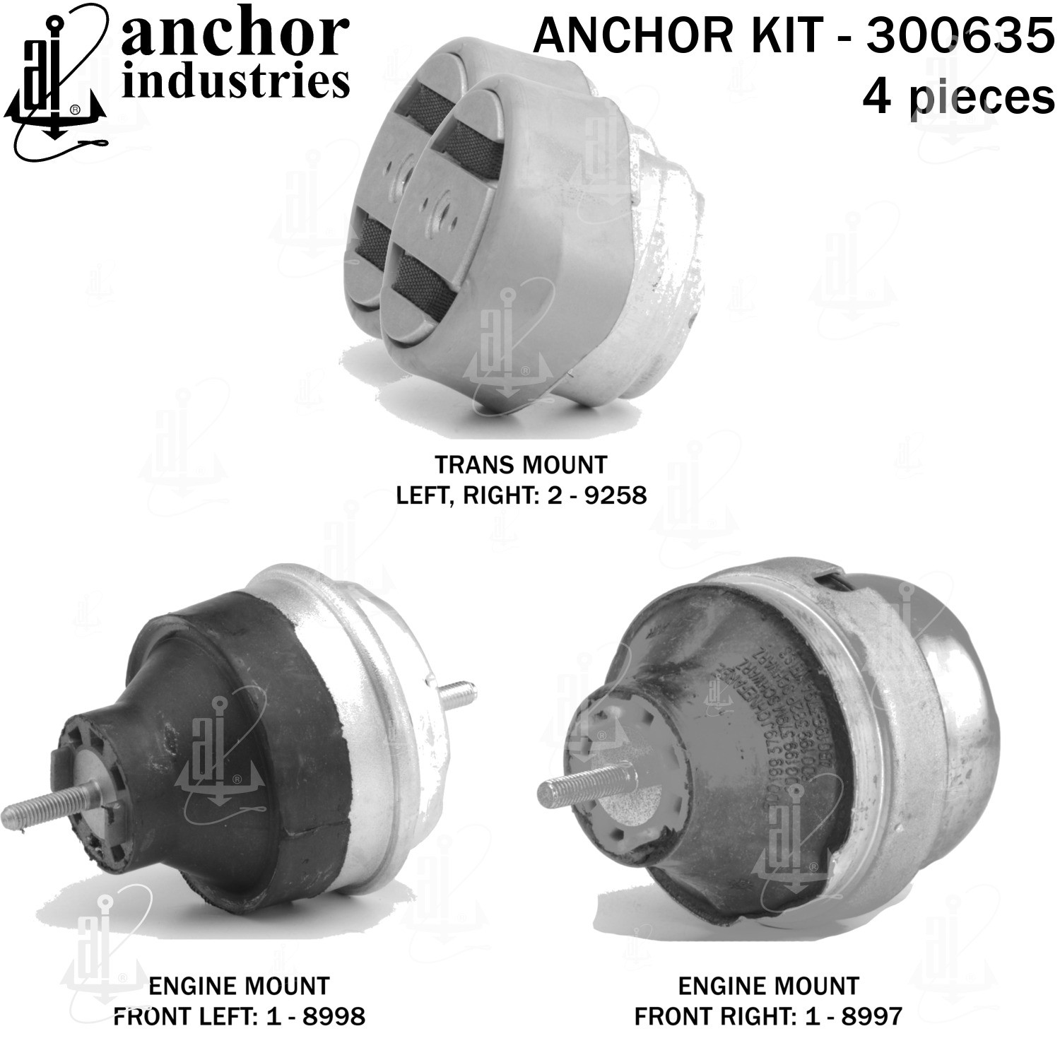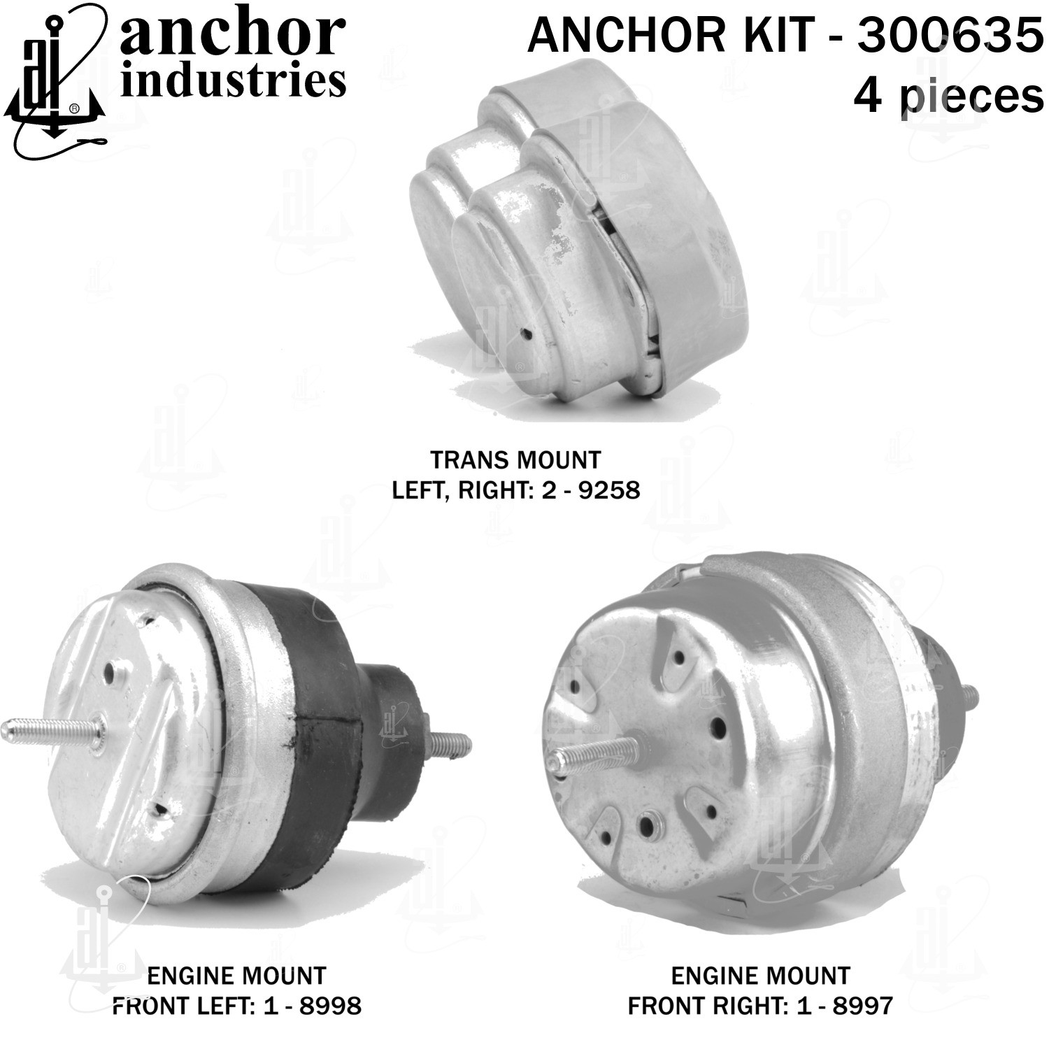 - Anchor 300635; ENGINE MNT KIT ; Each part of this kit is specifically engineered and manufactured to meet or exceed OE standards to ensure perfect fit and function. Natural and SBR rubber provide maximum life and performance. Steel fasteners are heat treated grade 5 bolts. A special bonding agent is used to ensure a rubber to metal bond. Rubber material is mixed to specific Durometer, hardness. 12 Month Warranty.