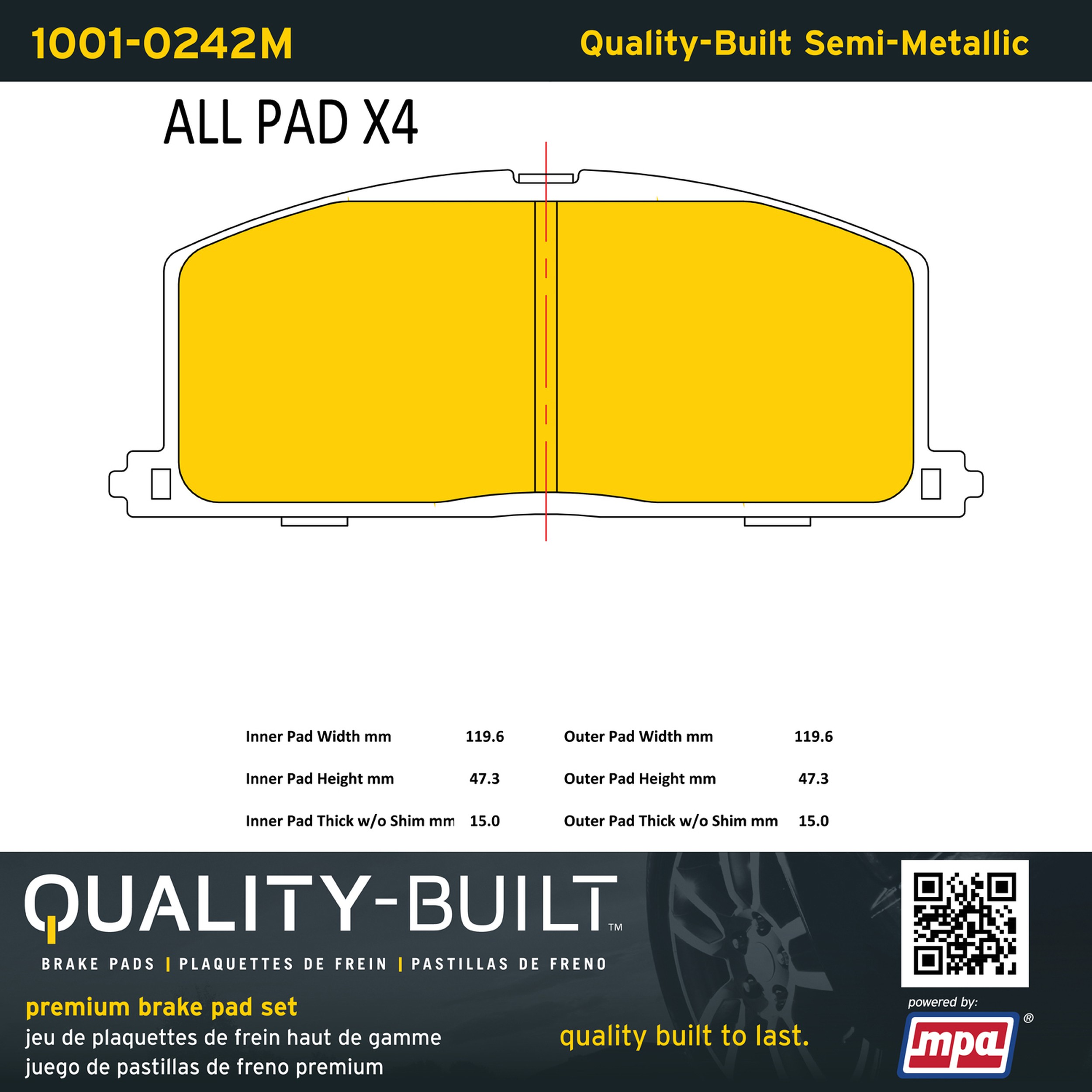 - Quality-Built Premium Brake Pads provide optimized stopping power in all conditions. Application-specific pad formulas remove the guesswork from pad selection by providing friction compounds engineered to restore like-new stopping power for every vehicle. 2025 compliant, copper-free friction formulas deliver dependable performance across a wide thermal range with low brake dust and zero noise.