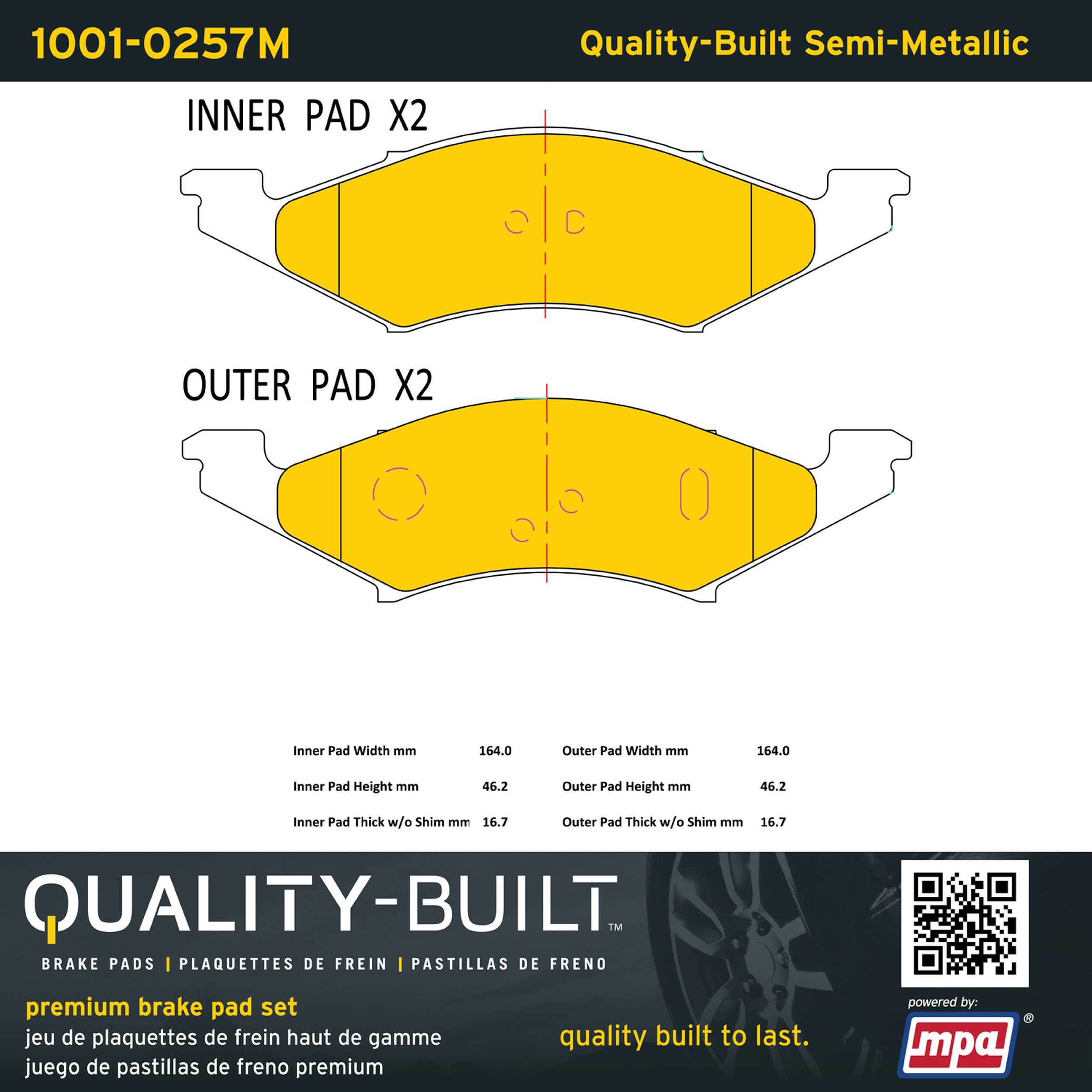 - Quality-Built Premium Brake Pads provide optimized stopping power in all conditions. Application-specific pad formulas remove the guesswork from pad selection by providing friction compounds engineered to restore like-new stopping power for every vehicle. 2025 compliant, copper-free friction formulas deliver dependable performance across a wide thermal range with low brake dust and zero noise.
