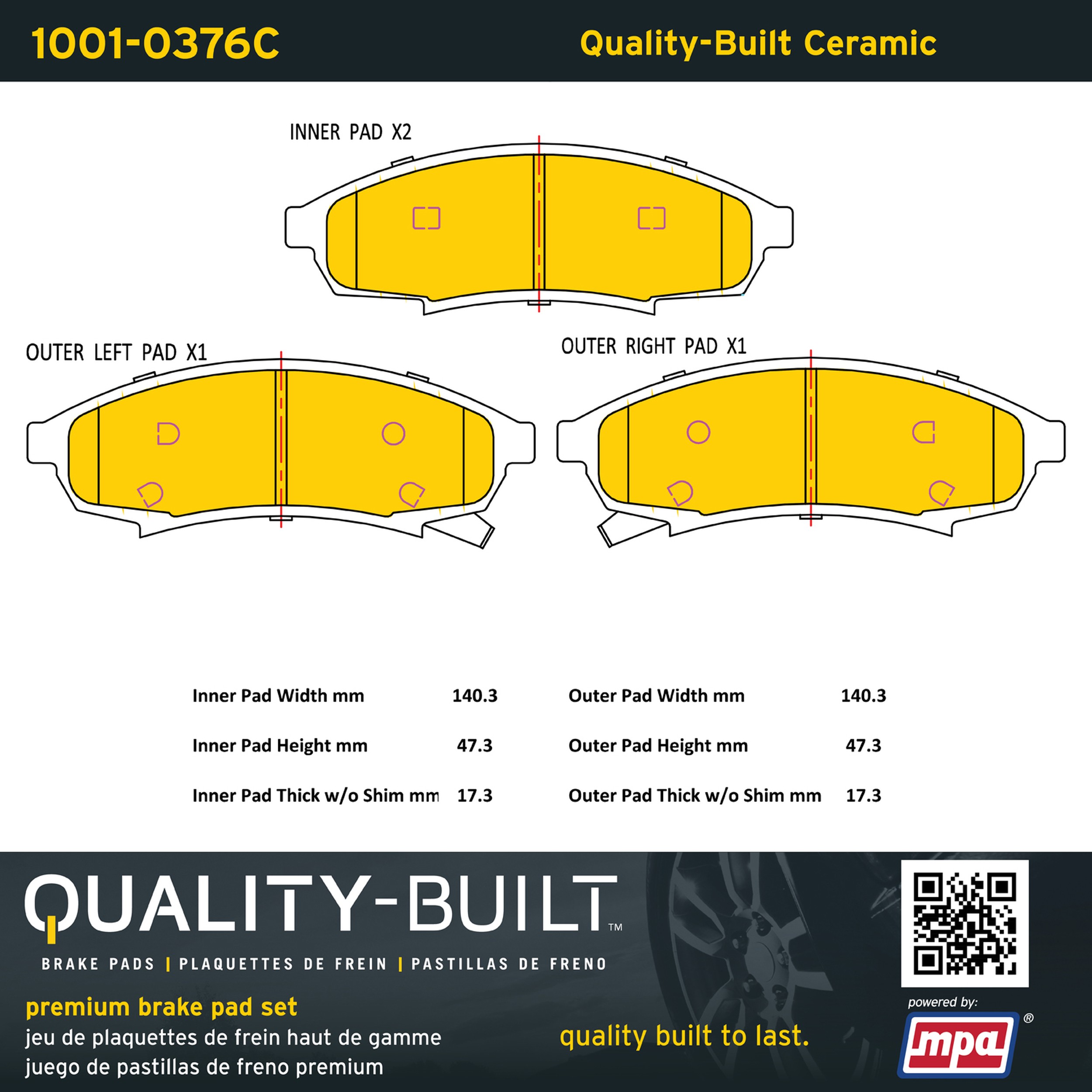 - Quality-Built Premium Brake Pads provide optimized stopping power in all conditions. Application-specific pad formulas remove the guesswork from pad selection by providing friction compounds engineered to restore like-new stopping power for every vehicle. 2025 compliant, copper-free friction formulas deliver dependable performance across a wide thermal range with low brake dust and zero noise.