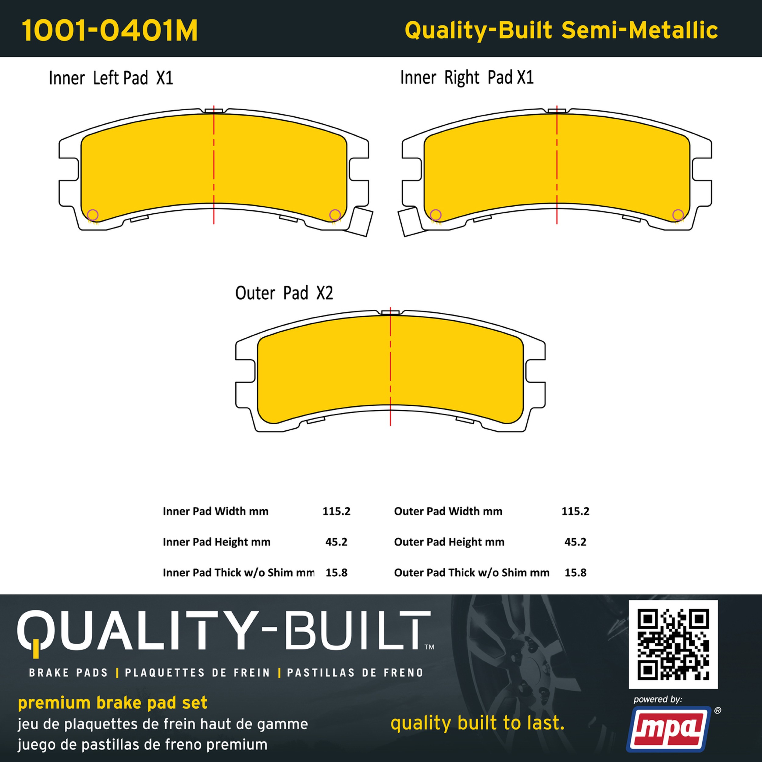 - Quality-Built Premium Brake Pads provide optimized stopping power in all conditions. Application-specific pad formulas remove the guesswork from pad selection by providing friction compounds engineered to restore like-new stopping power for every vehicle. 2025 compliant, copper-free friction formulas deliver dependable performance across a wide thermal range with low brake dust and zero noise.