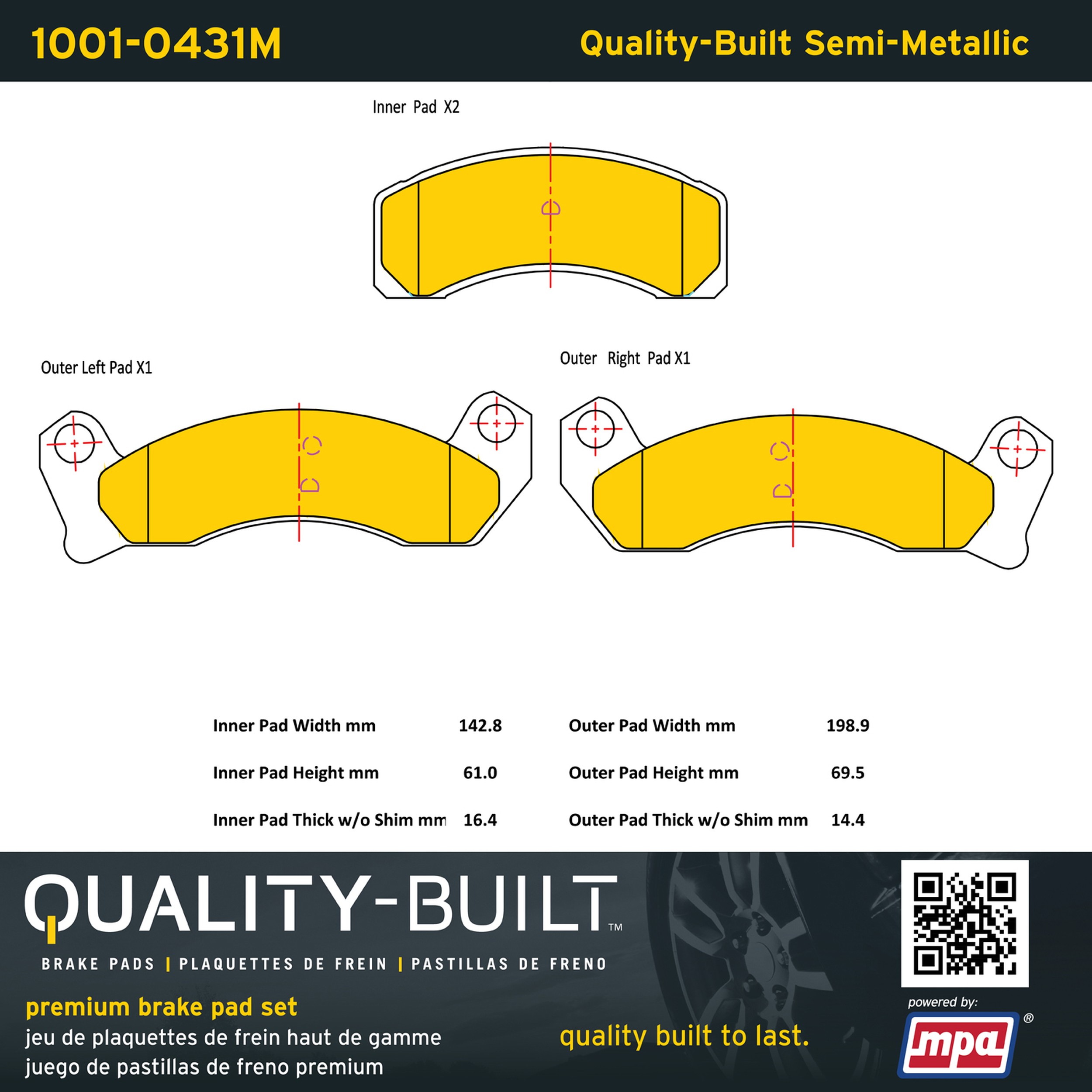 - Quality-Built Premium Brake Pads provide optimized stopping power in all conditions. Application-specific pad formulas remove the guesswork from pad selection by providing friction compounds engineered to restore like-new stopping power for every vehicle. 2025 compliant, copper-free friction formulas deliver dependable performance across a wide thermal range with low brake dust and zero noise.